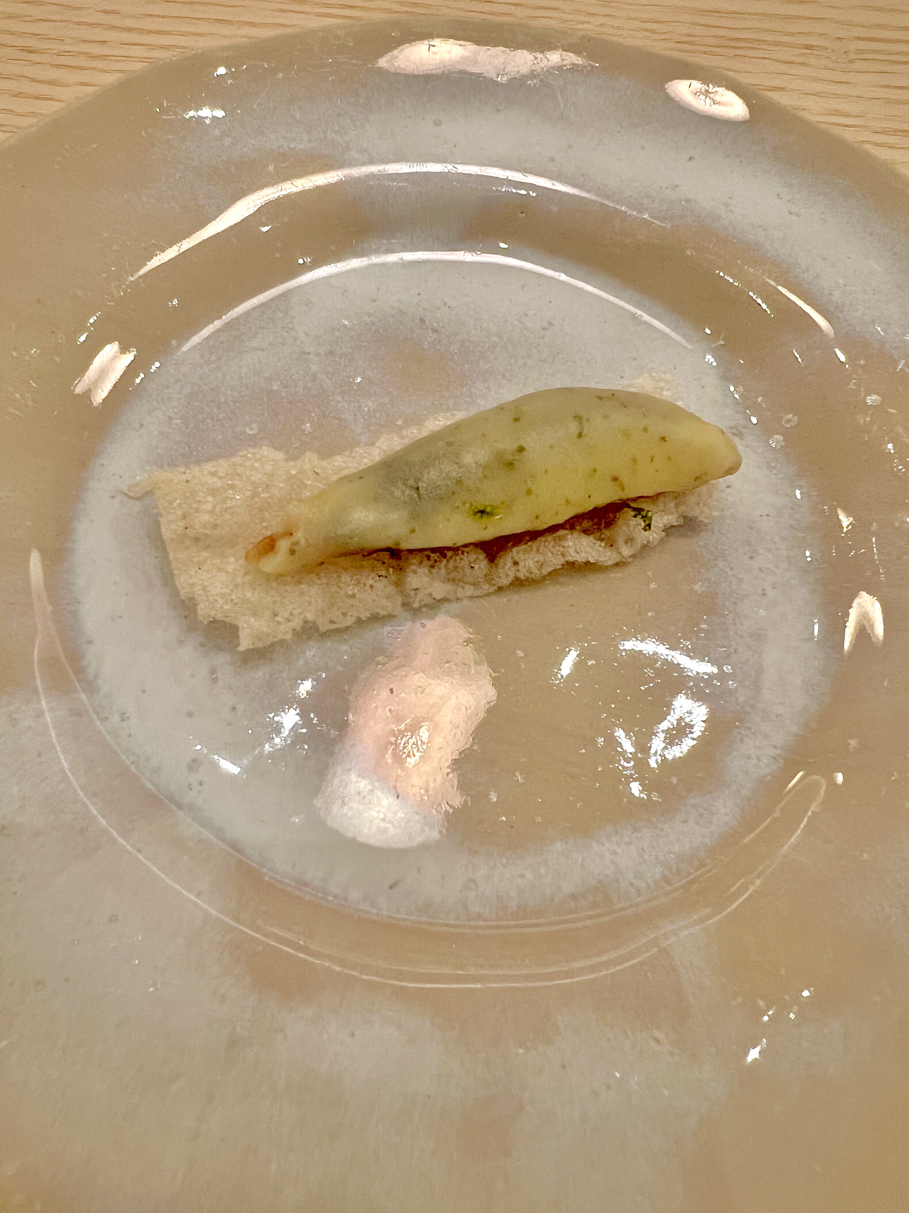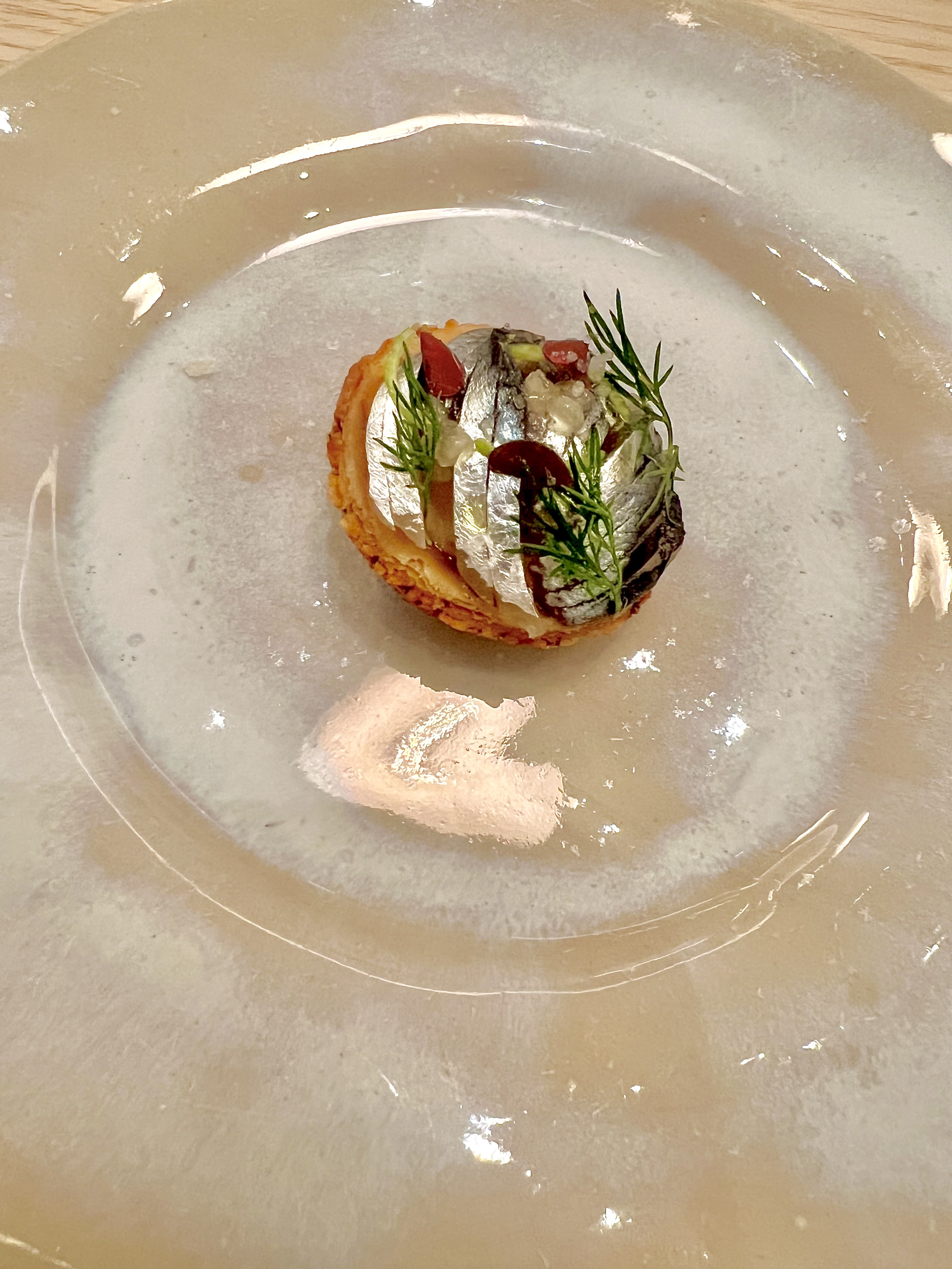 Et cela commence avec les amuse-bouches : Tuile de riz, anchois fumé et beurre d’algues Kombu, et Tartelette aux algues mousse de sardines et sashimi d’anchois frit. La tuile de riz a cette fébrilité de la croustille en légèreté, le beurre d’algues a cette vive douceur iodée herbacée et l’anchois vient titiller de sa pointe fumée en salinité. La tartelette se croque de vie en une seule bouchée de son élégance ciselée de l’anchois en un sashimi frit-pétrifié encore cru, qui cache en son coeur une aérienne mousse intensifiée de sardines, d’un gel d’agrumes et de pluches d’aneth. Brillantissme !