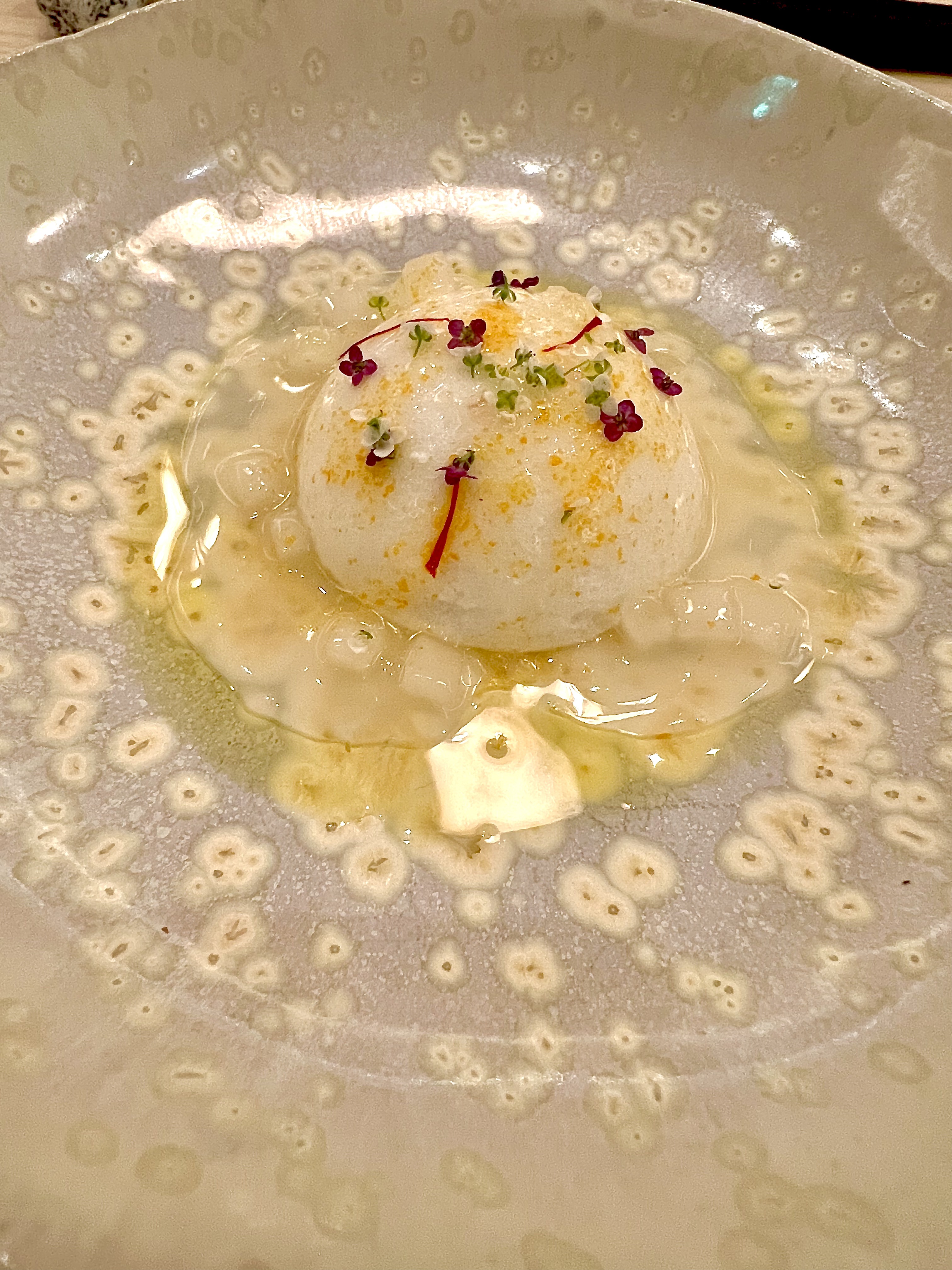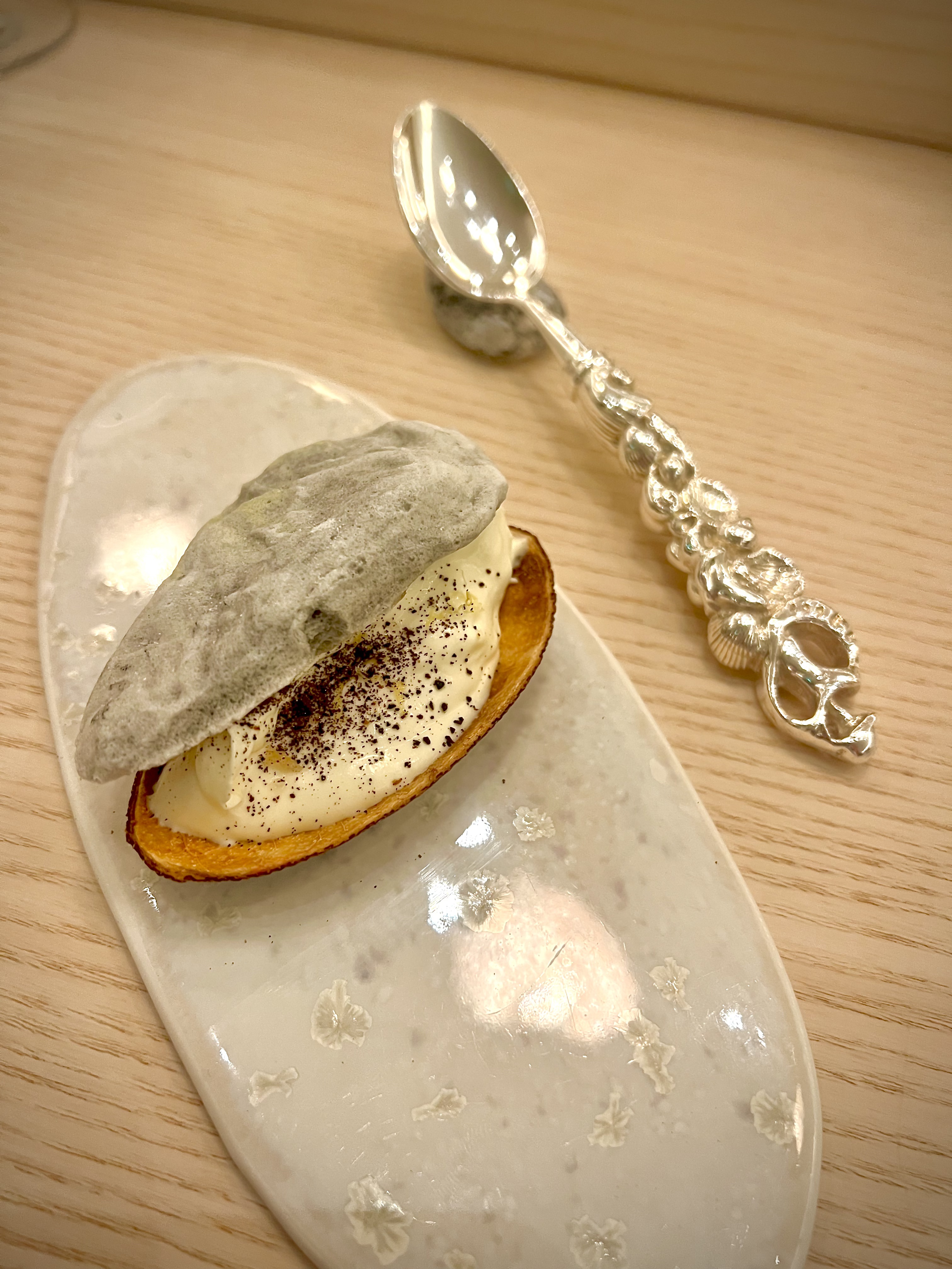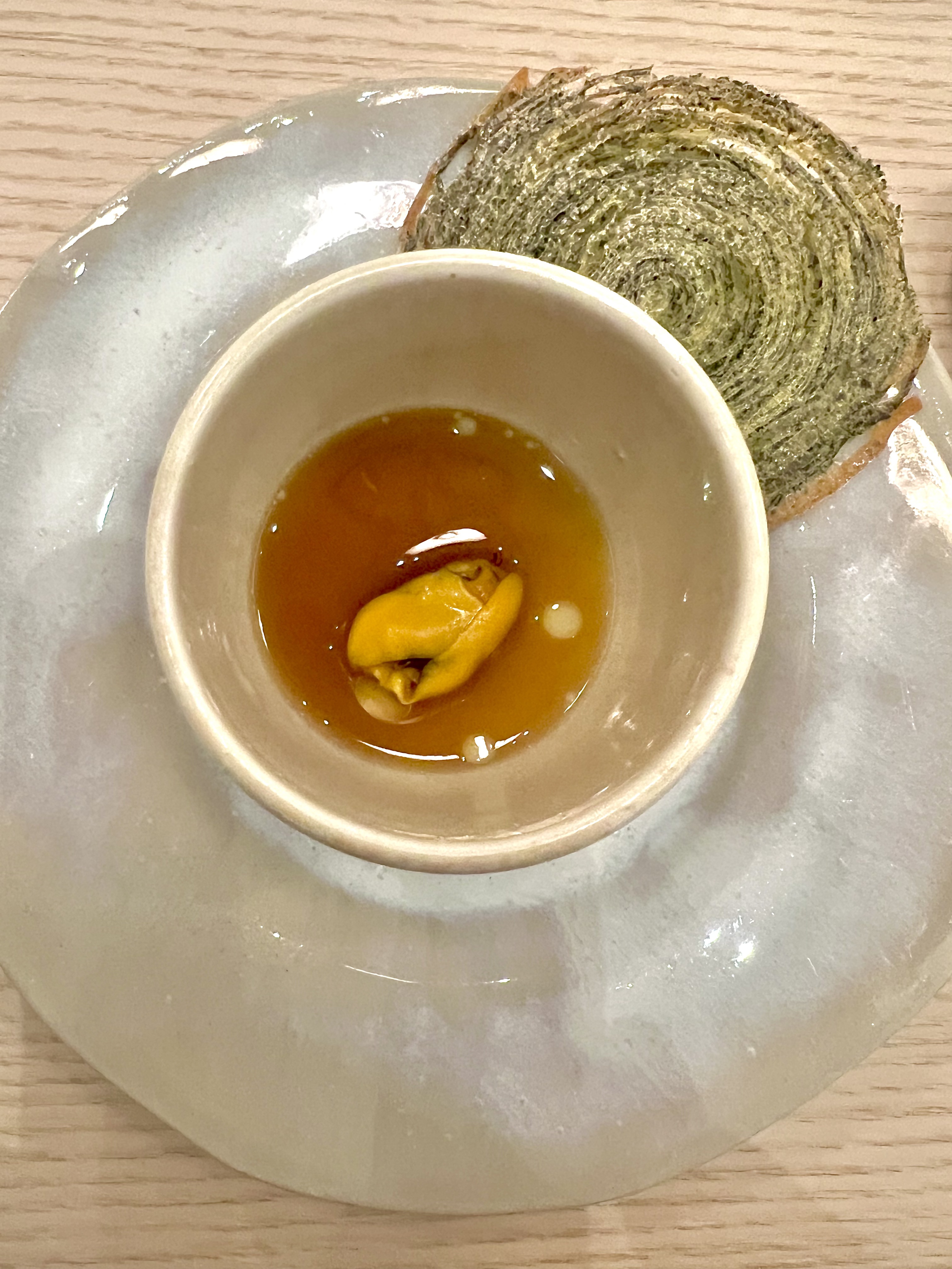 En pré-entrée, le Royal Dashi est l’essence parfaite de cette fusion des deux cultures culinaires qui se font parfaitement échos. La cuisine d’Escoffier rencontre ainsi les traditions ancestrales et spirituelles de la cuisine japonaise avec ce Royal dashi qui touche le coeur des français et fait référence à la très classique Royale et émeut les japonais de sa texture fragile, tremblante et réconfortante du traditionnel Chawanmushi (littéralement cuit à la vapeur dans un bol de thé). Monté au dashi (bouillon souvent à base d’algues Kombu et infusé de katsuobushi, les flocons de bonite séchés), ce flan sophistiqué, ici à la saveur d’un bouillon de viande iodé, a sidéré une moule ouverte au saké et gingembre. L’arlette de pomme de terre aux algues vient cadencer de sa saline croustillance.