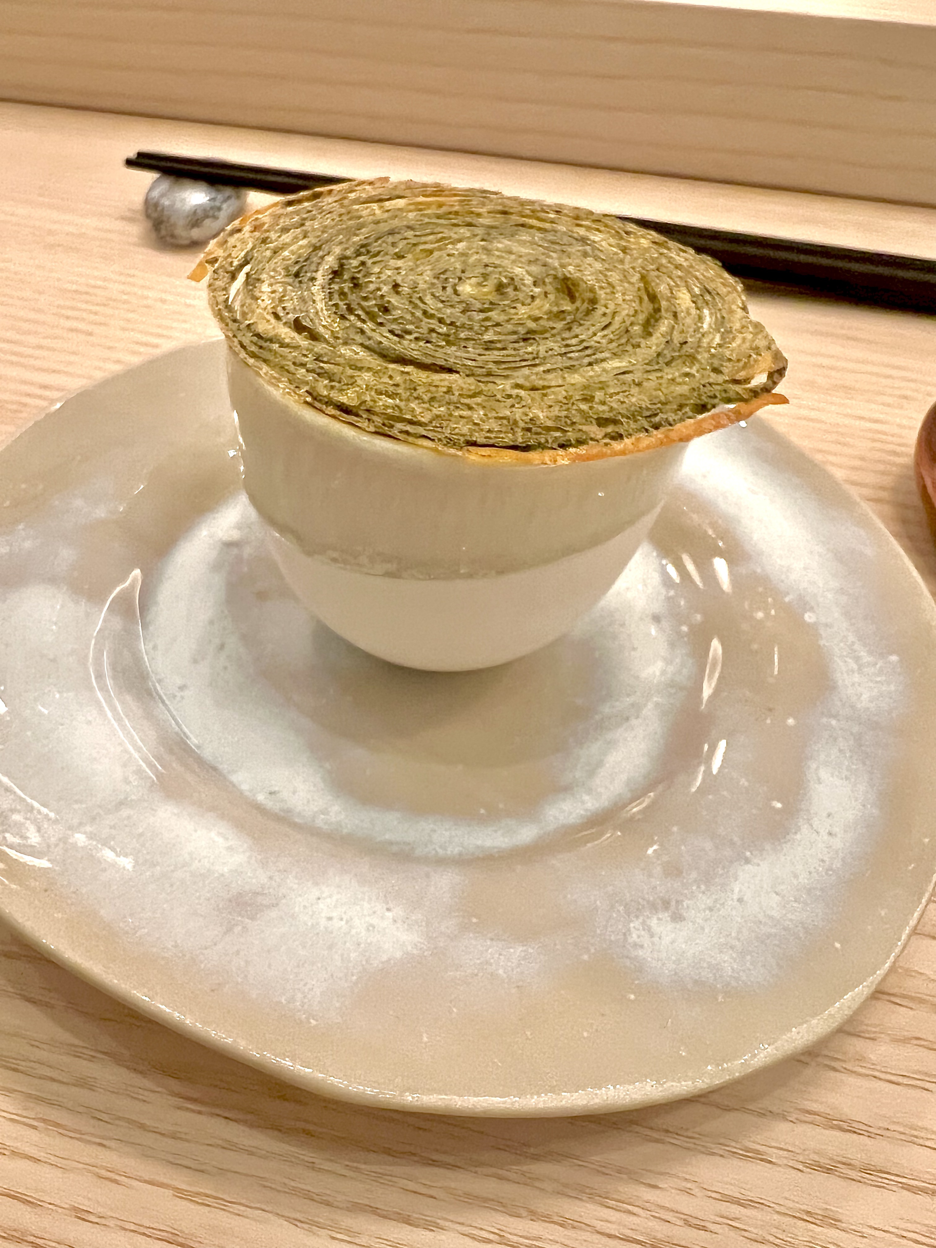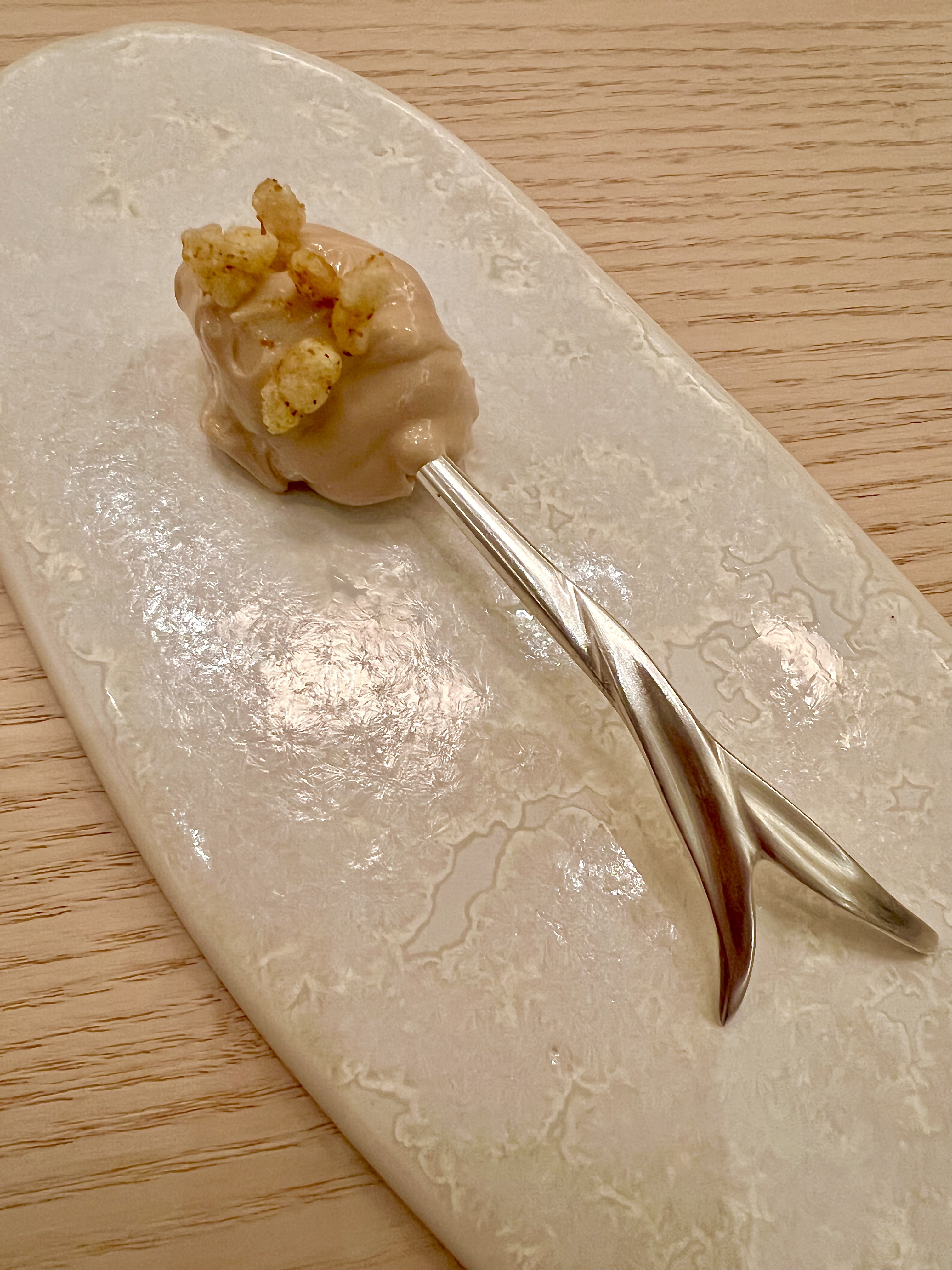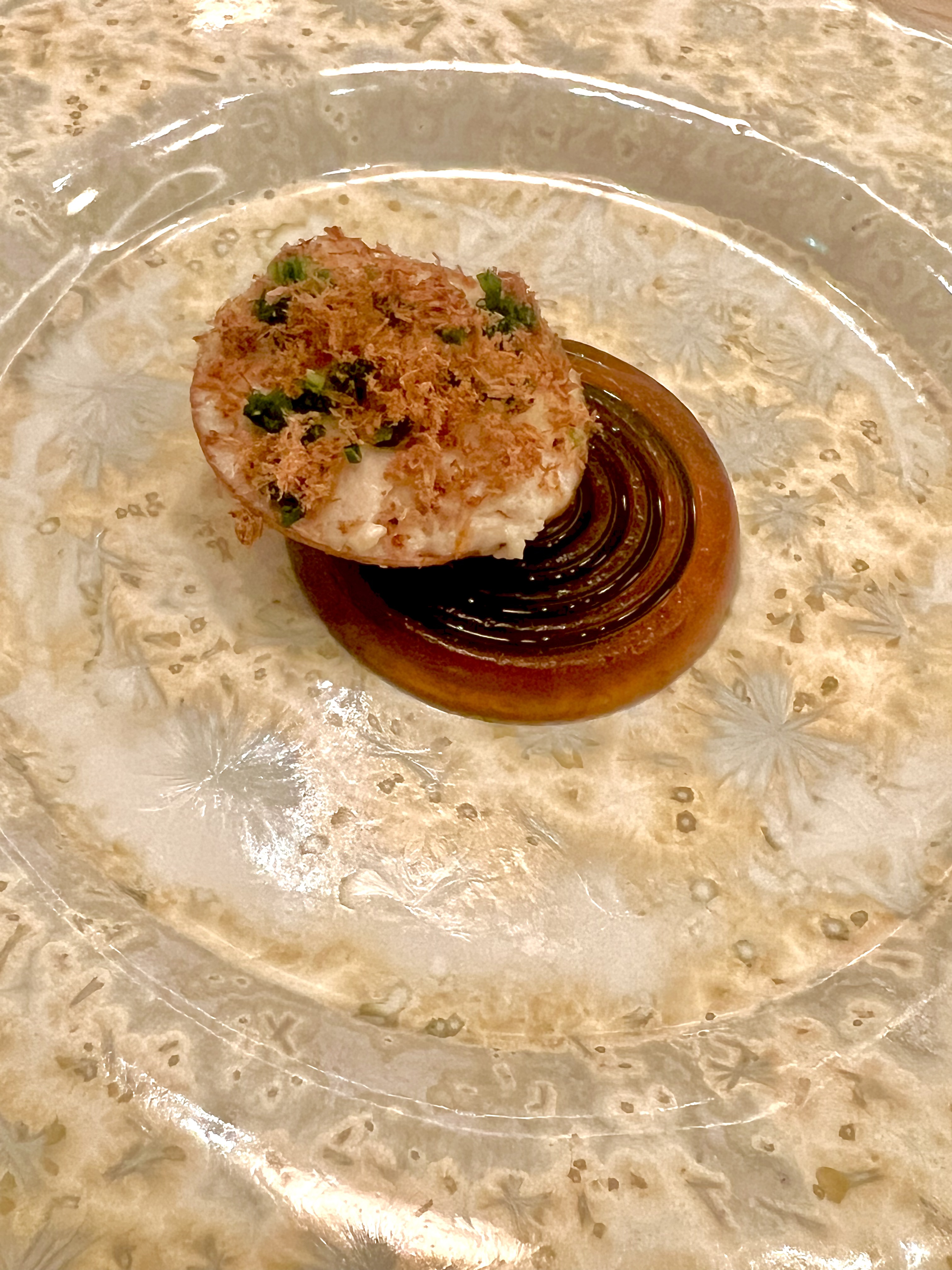 En pré-entrée, le Royal Dashi est l’essence parfaite de cette fusion des deux cultures culinaires qui se font parfaitement échos. La cuisine d’Escoffier rencontre ainsi les traditions ancestrales et spirituelles de la cuisine japonaise avec ce Royal dashi qui touche le coeur des français et fait référence à la très classique Royale et émeut les japonais de sa texture fragile, tremblante et réconfortante du traditionnel Chawanmushi (littéralement cuit à la vapeur dans un bol de thé). Monté au dashi (bouillon souvent à base d’algues Kombu et infusé de katsuobushi, les flocons de bonite séchés), ce flan sophistiqué, ici à la saveur d’un bouillon de viande iodé, a sidéré une moule ouverte au saké et gingembre. L’arlette de pomme de terre aux algues vient cadencer de sa saline croustillance.