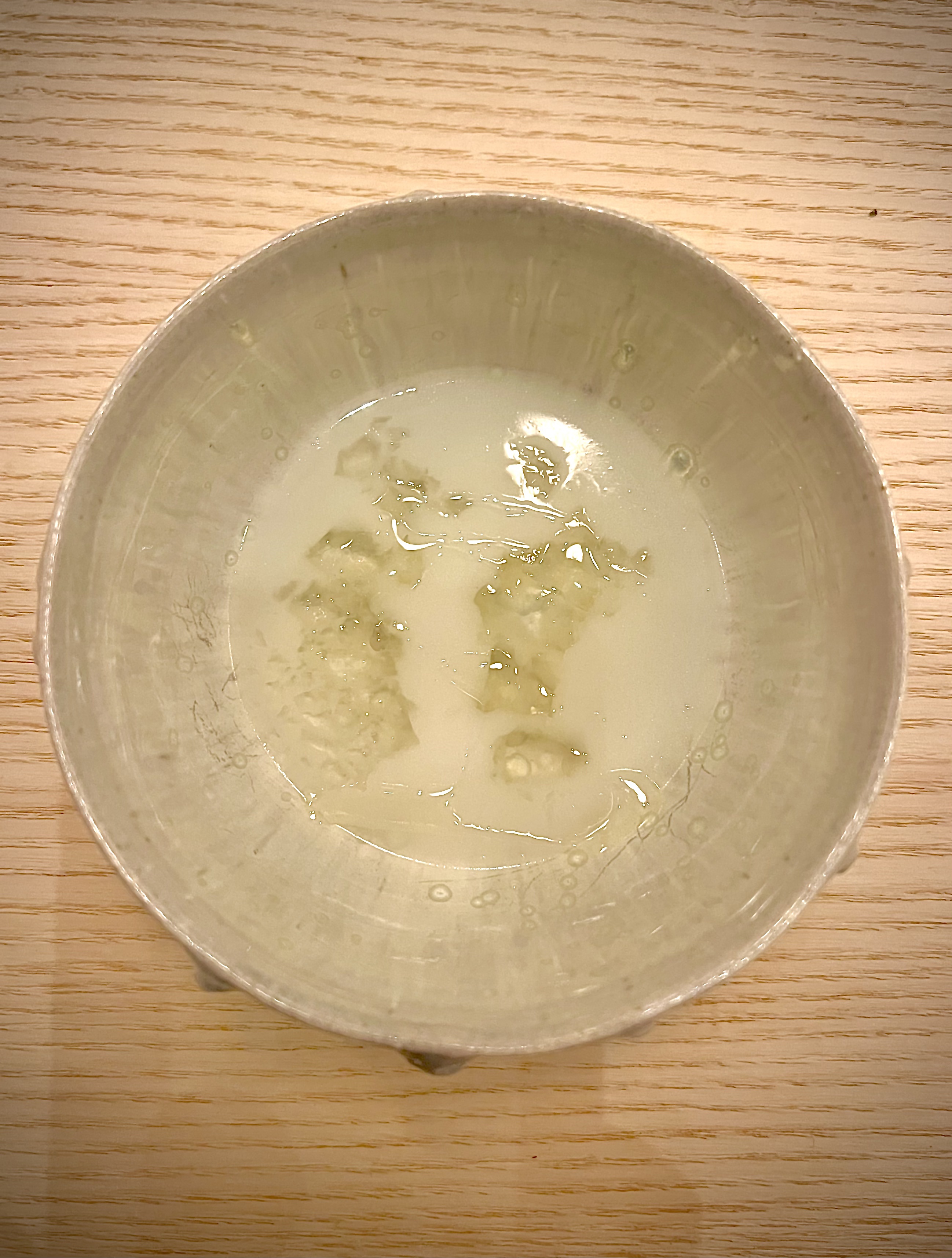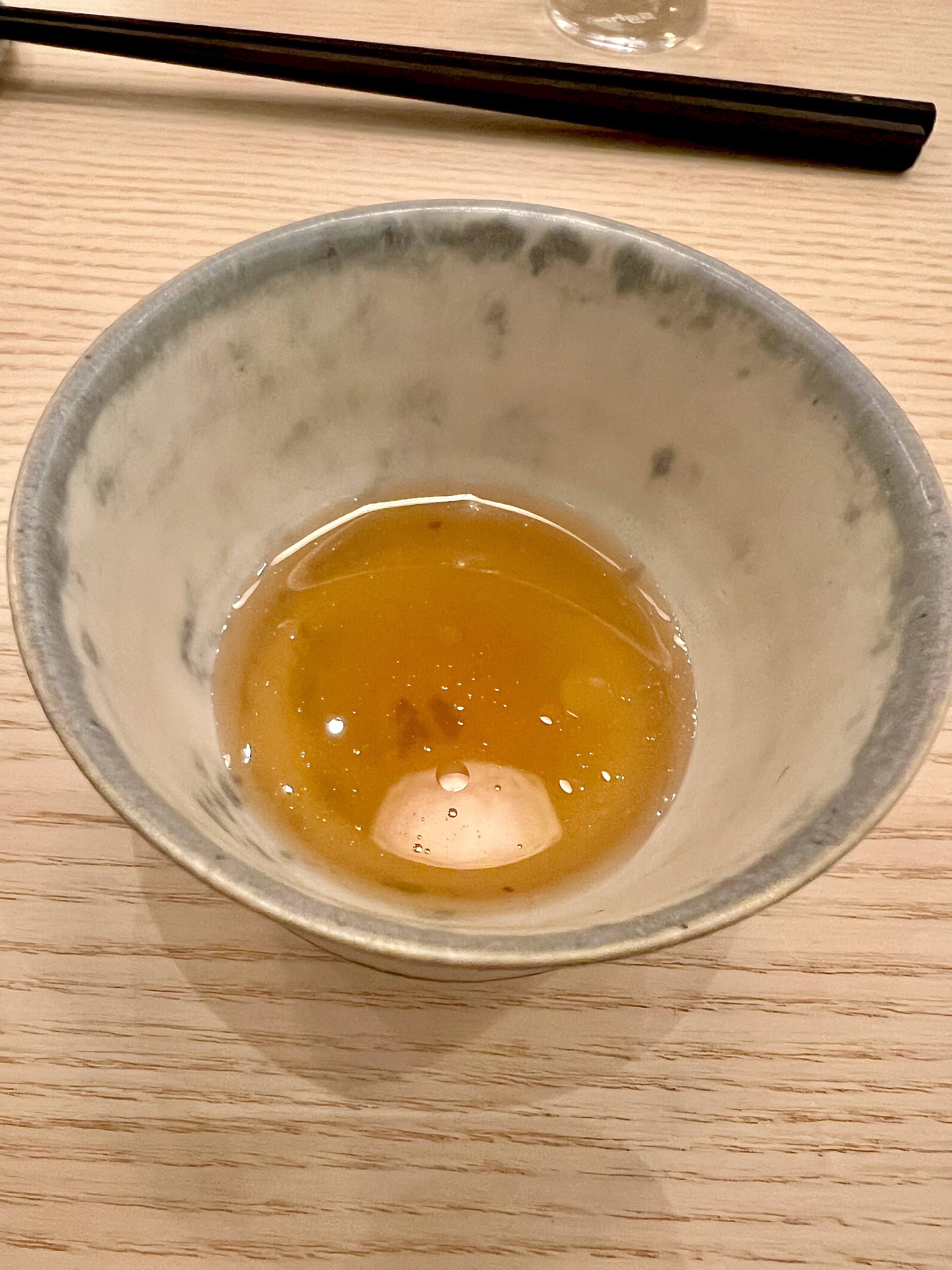 l’Éloge de la neutralité, une sole entière exprimée : la neutralité est une référence en tradition du Japon pour débuter les repas avec un bouillon assez neutre qui permet de nettoyer, d’ouvrir l’appétit et de préparer le palais. Le chef a souhaité faire la même chose avec cette extraction de sole qui est exprimée dans son entièreté et dans toute sa splendeur concentrée. Pureté, délicatesse et suavité de cet incroyable « lait de sole » préparé à base du filet et du fumet du poisson. Le collagène naturel délivre une aérienne texture gélatine et les gouttes d’huile d’amande viennent apporter le relief, la rondeur et la gourmandise. L’ensemble est d’une subtilité déconcertante.