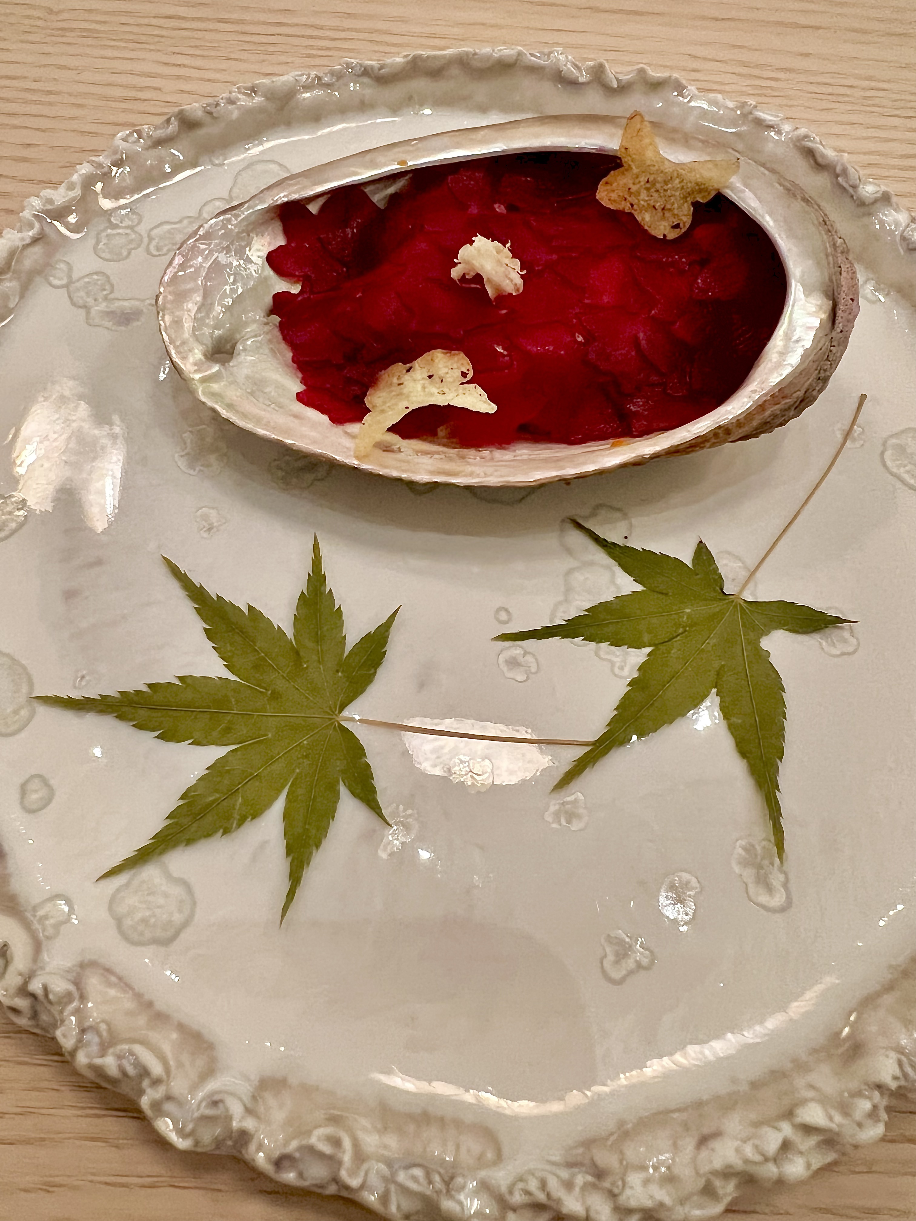 Murex trempé, pétales de légumes acidulés : le murex, ce coquillage méditerranéen à la spectaculaire parure de sa coquille aux longues épines squelettiques, est un délicat cousin du bulot. Il est préparé en deux services : le premier se savoure en un yakitori qui instille le palais de sa saveur unique, la chair est travaillée et glacée d’une mayonnaise de foie gras à la sincère rondeur et le riz soufflé est un condiment qui « crisp » judicieusement en bouche. Le second, présenté dans un coquillage d’ormeau, est vivifié d’une fraîcheur vinaigrée et du craquant de la salade et du chou blanc imprégnés du jus de cuisson du murex et du dashi. Le voile de pickles de betteraves délivre un univers jardin-marin bien emmené.