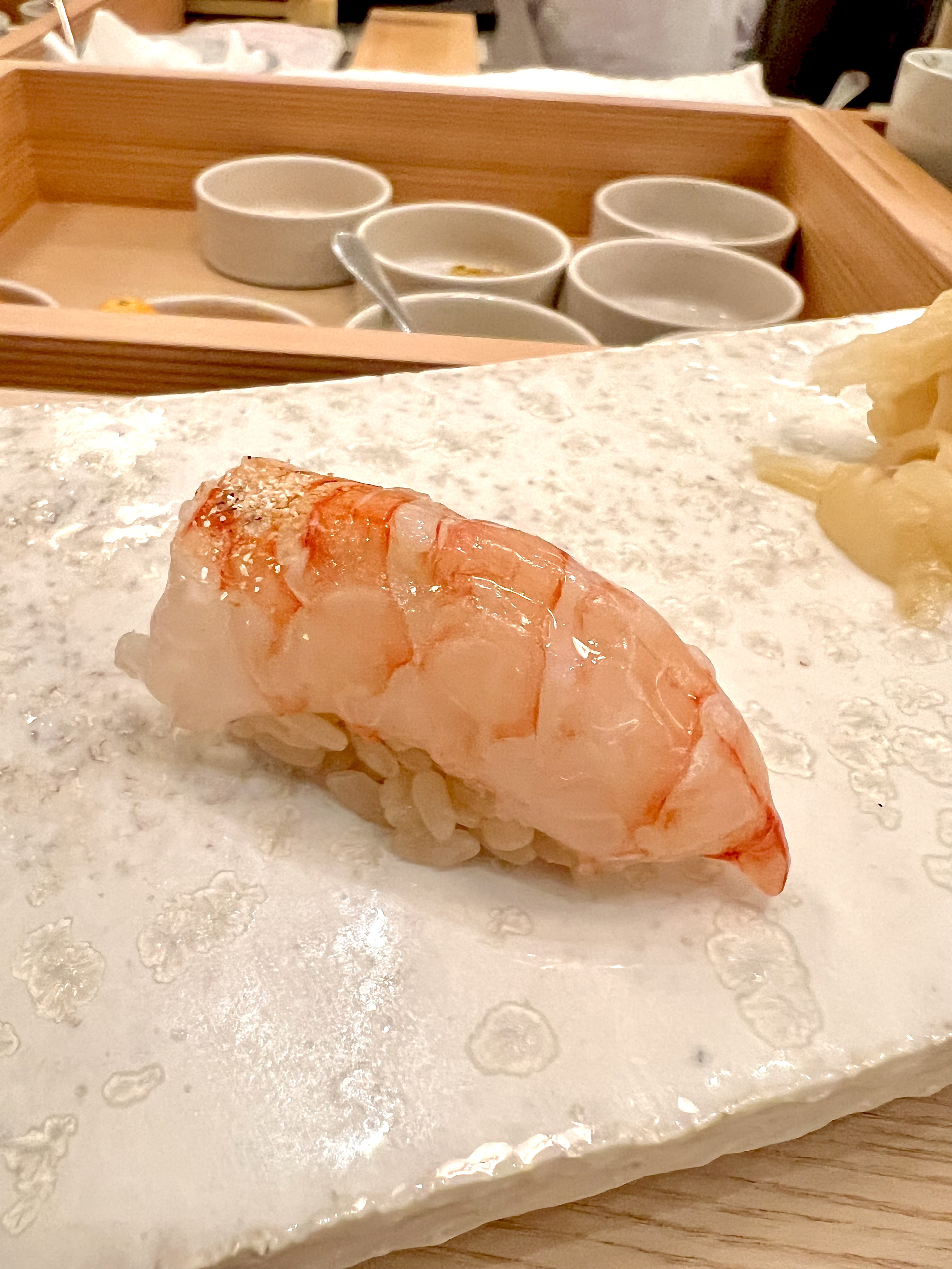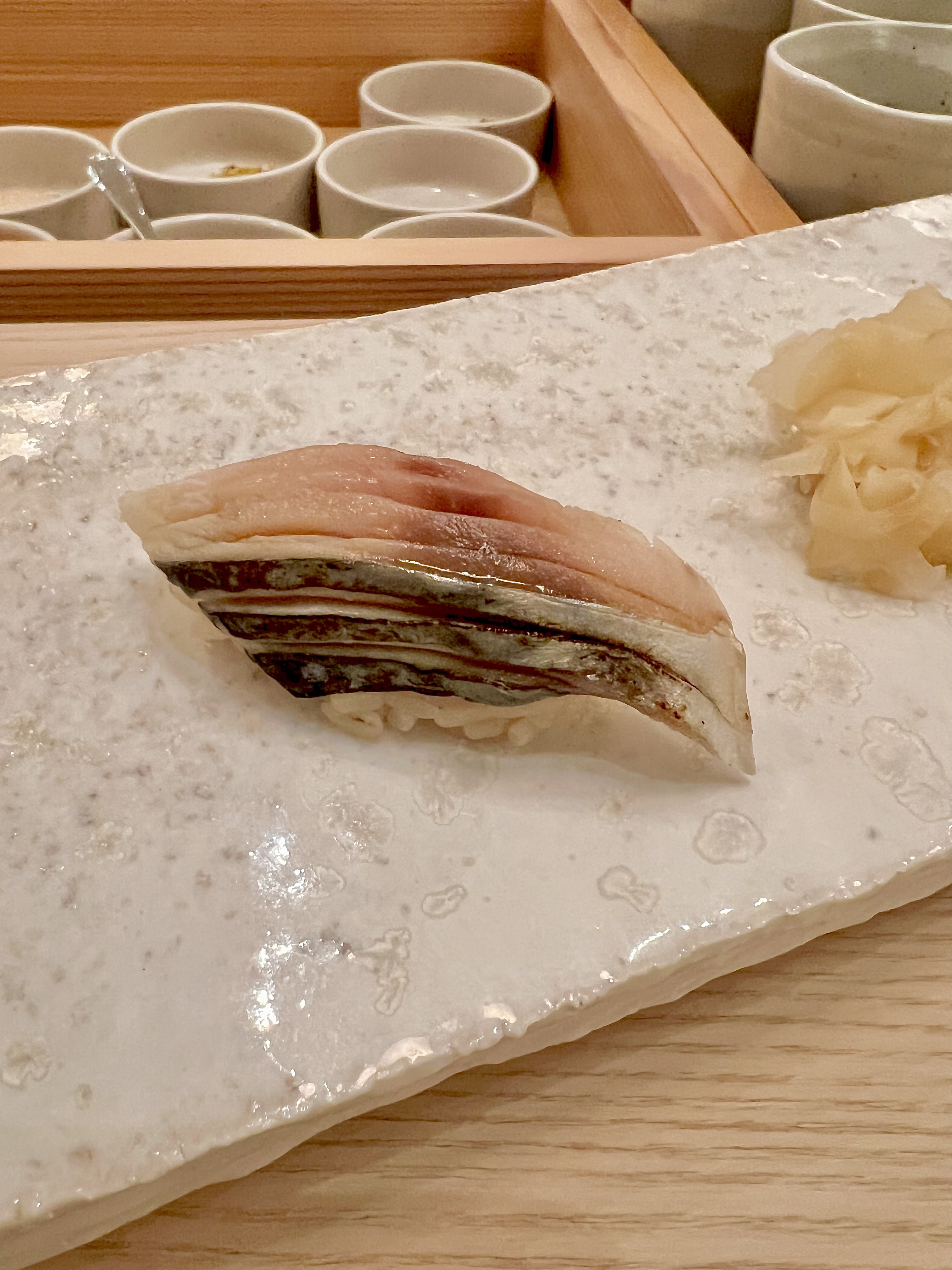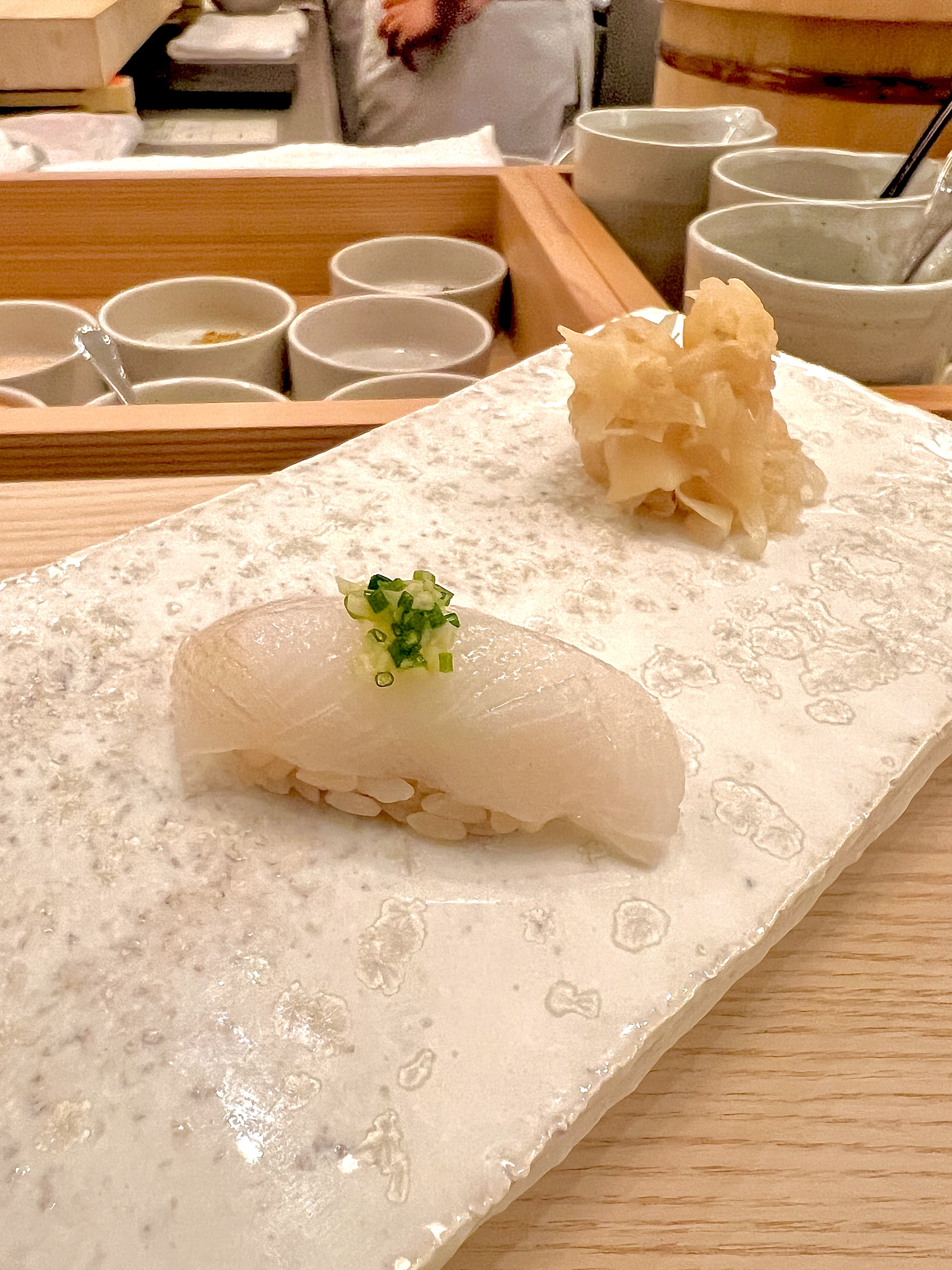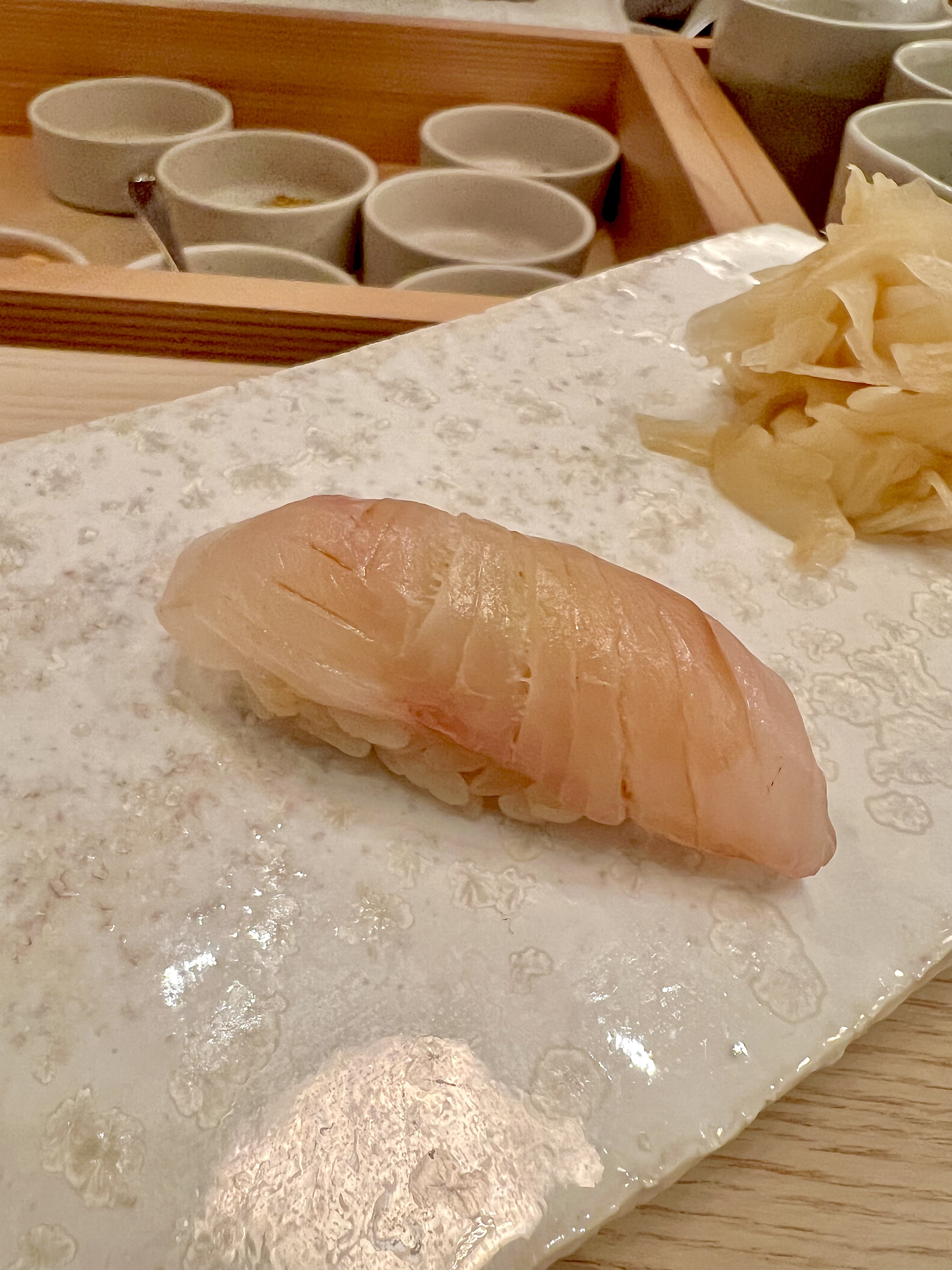 Quelques recommandations avant la dégustation, pas de baguettes uniquement le bout des doigts, pas de sauce soja, pas de wasabi à rajouter, juste prendre cette pièce formée pour vous à la main. L’oshibori (serviette rafraîchissante) est là pour se rincer au fur et à mesure, et le gingembre sur le côté de l’assiette permet de nettoyer le palais entre chaque pièce, et c’est tout ! En effet, l’iode délicat et presque imperceptible de la fraîcheur et de la translucide finesse du poisson, se cadence du riz tiède assaisonné, non aggloméré, mais claquant de vie et le wasabi est juste là pour le relief à la saveur singulière d’un raifort herbacé.