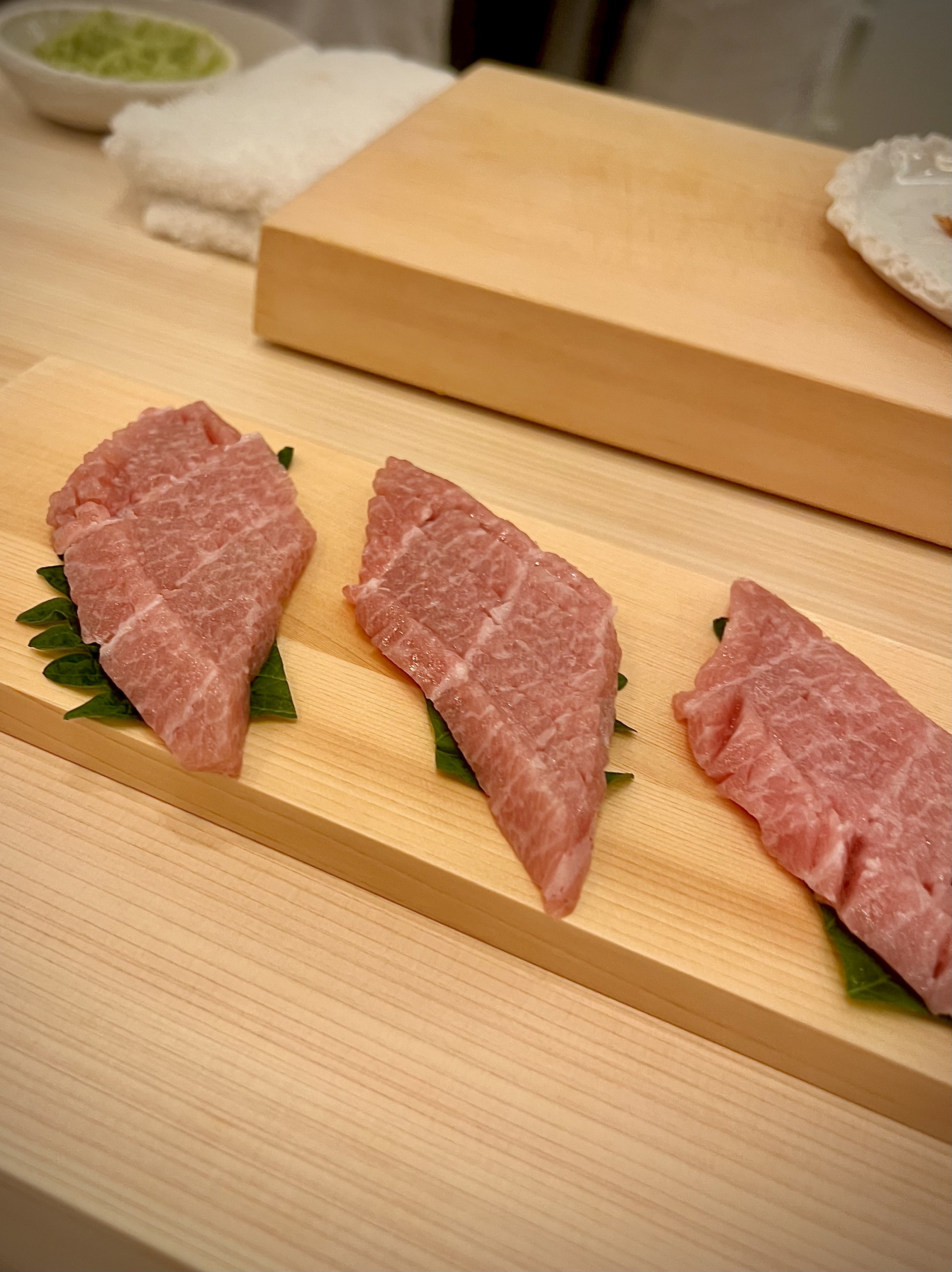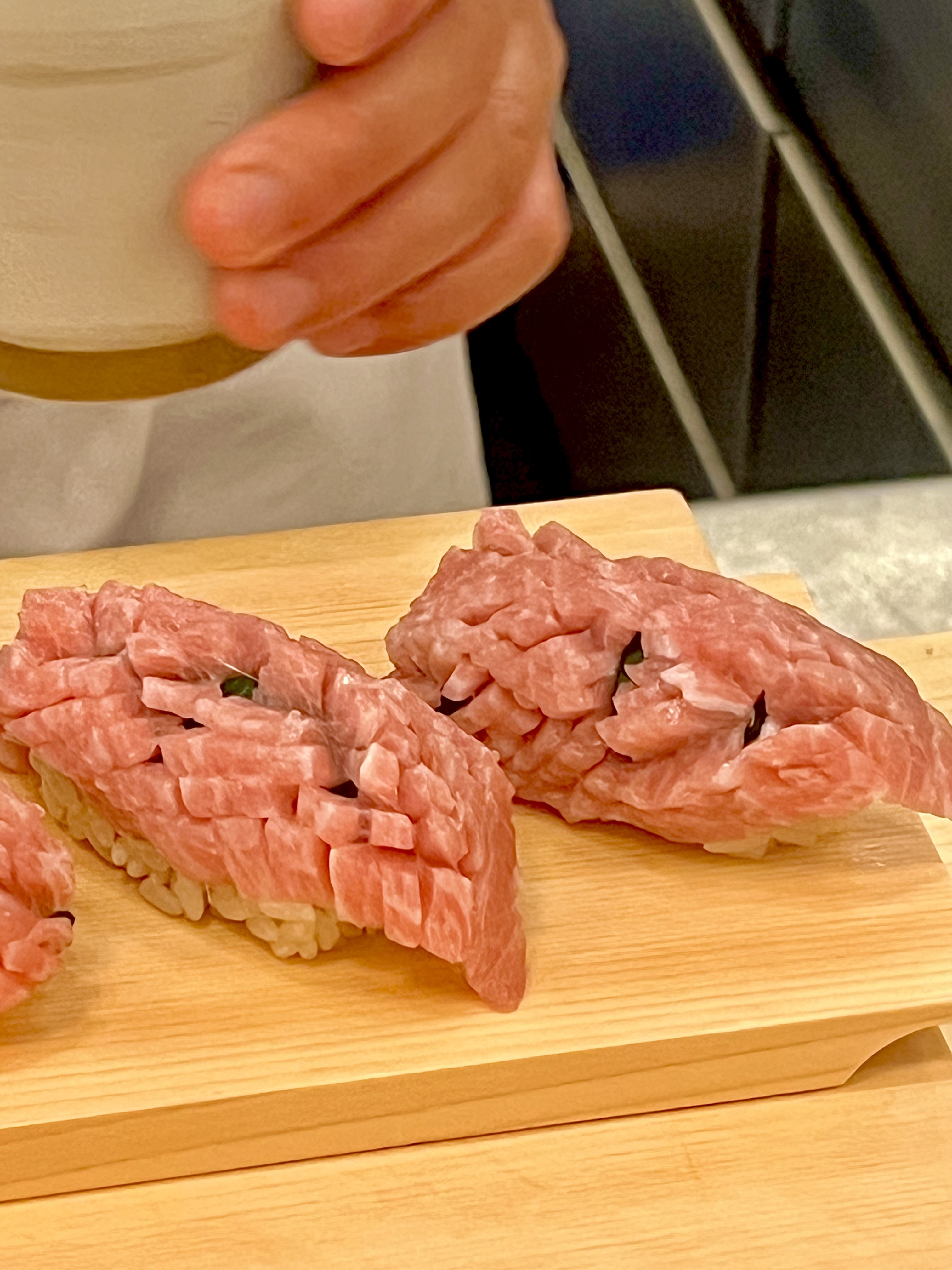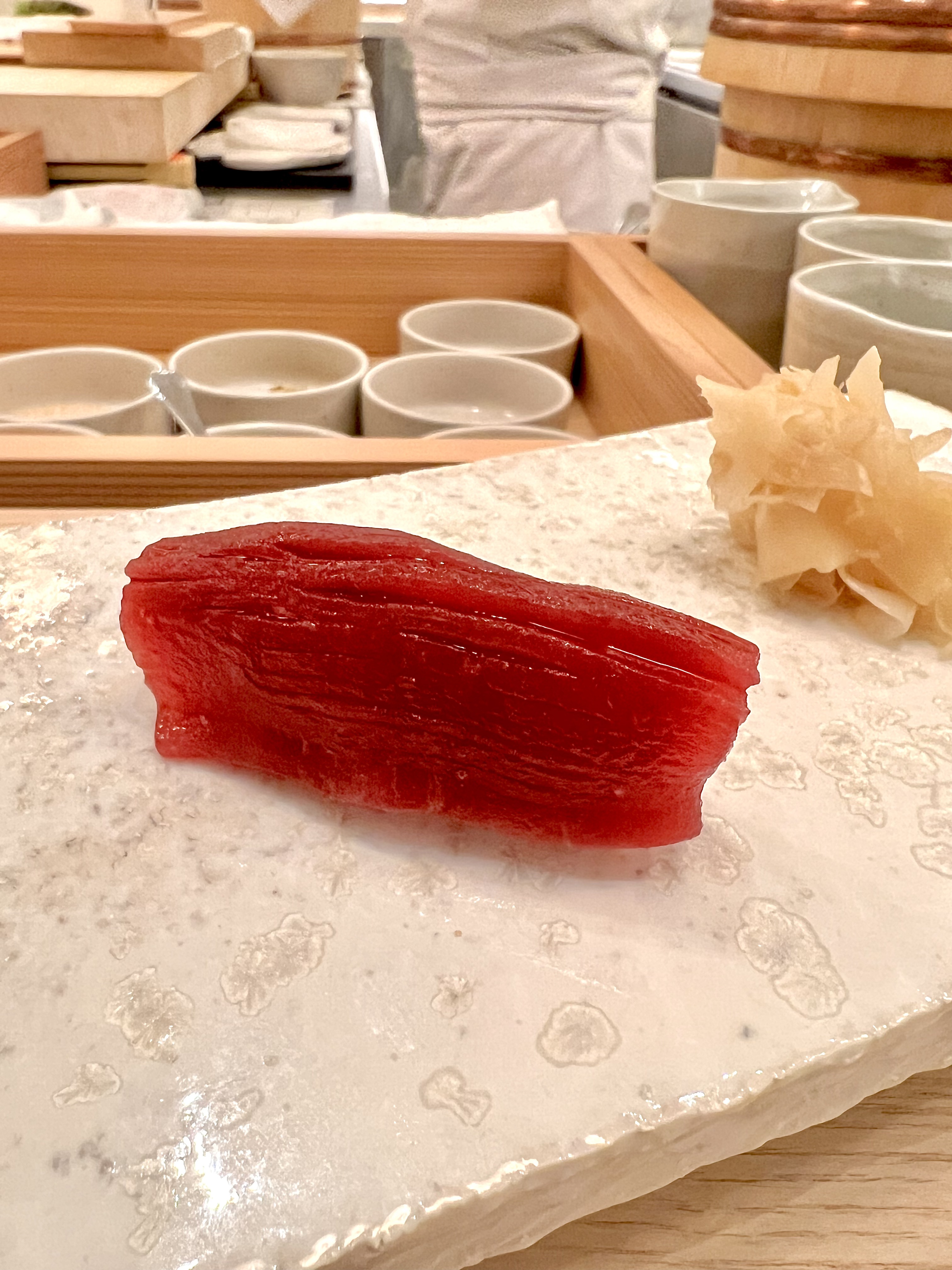 Le Thon rouge Akami contraste soudainement de sa couleur rouge vive, telle une tranche de boeuf qui recouvre pleinement le ballotin de riz qui, pour les poissons plus gras, est maintenu à une température plus élevée pour permettre au gras naturel de la chair de s’assouplir plus rapidement et de délivrer toute la valeur de ses saveurs.