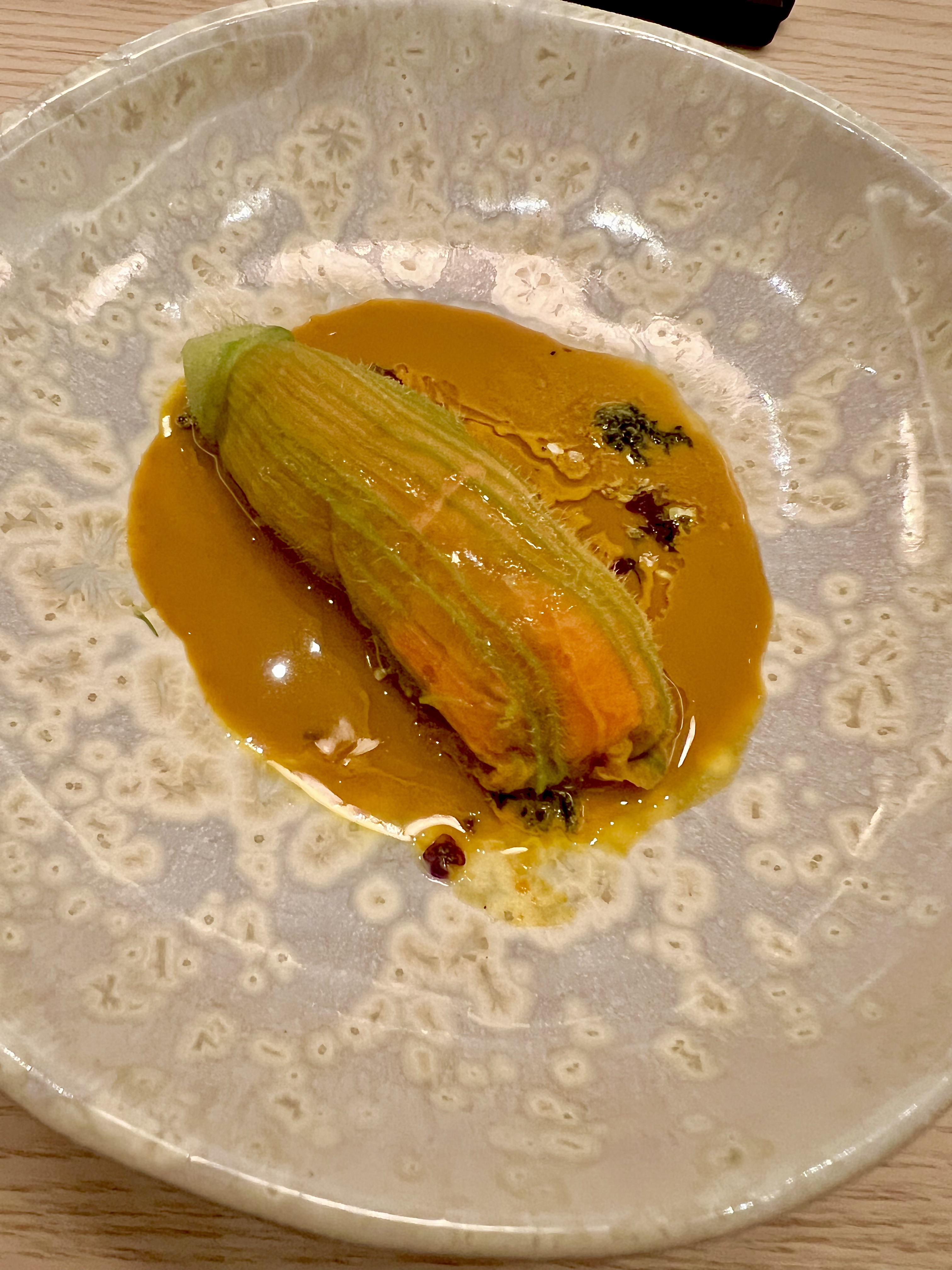 Le Rouget légèrement grillé de sa peau à la flamme du chalumeau s’énonce puissant, doux et raffiné, délicieusement troublant de sa double température et texture grillotée.