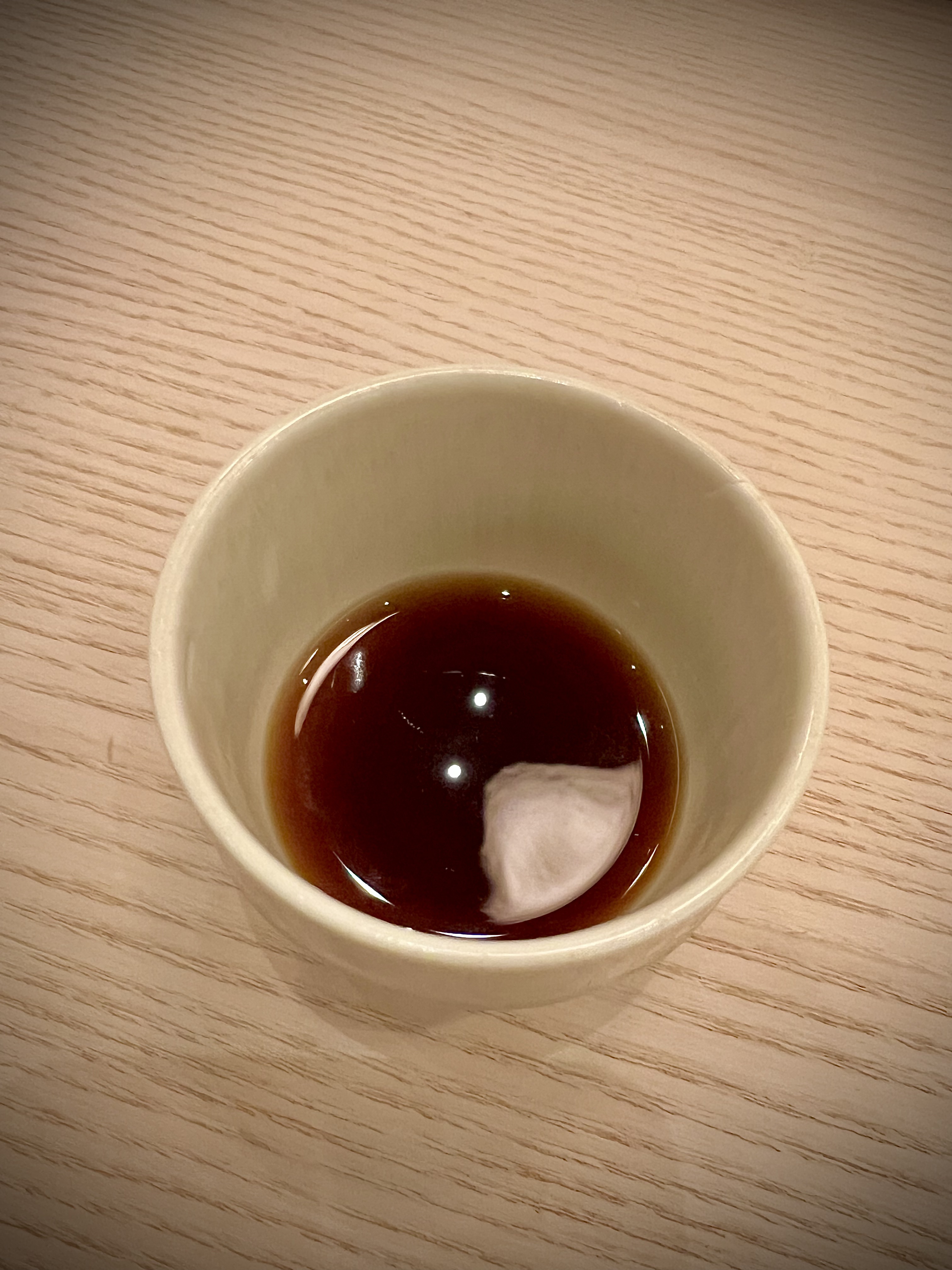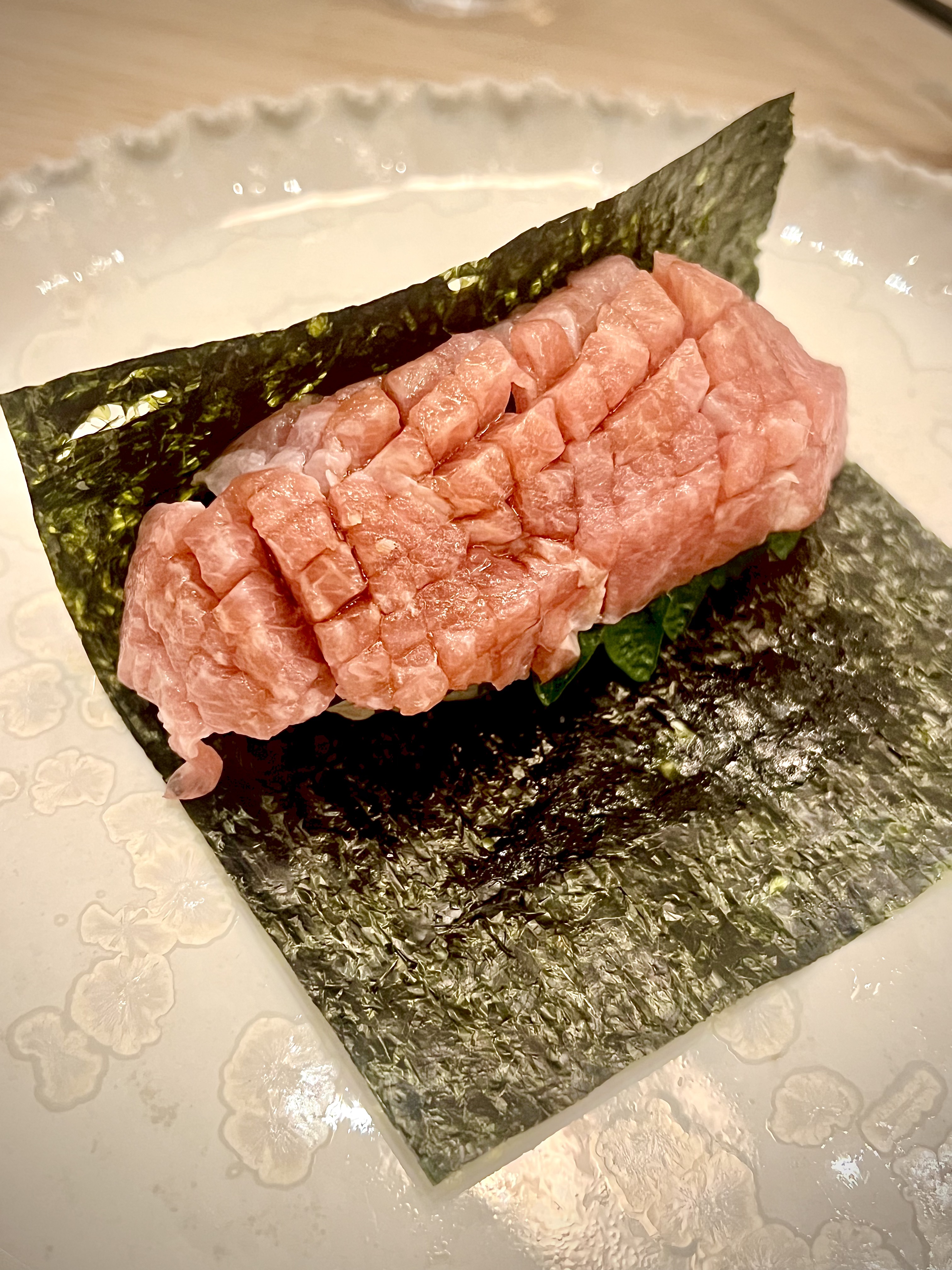 Enfin, le Temaki Otoro, de son inimitable couleur pale incroyablement persillée, comme une viande de Kobe d’une découpe quadrillée, se libère de toute sa force d’un caractère marin-noiseté; l’enveloppe de la feuille de Nori vient craquer en finesse de son inimitable goût d’une profondeur marine et de thé fumé : l’ensemble est totalement transcendant et enivrant.