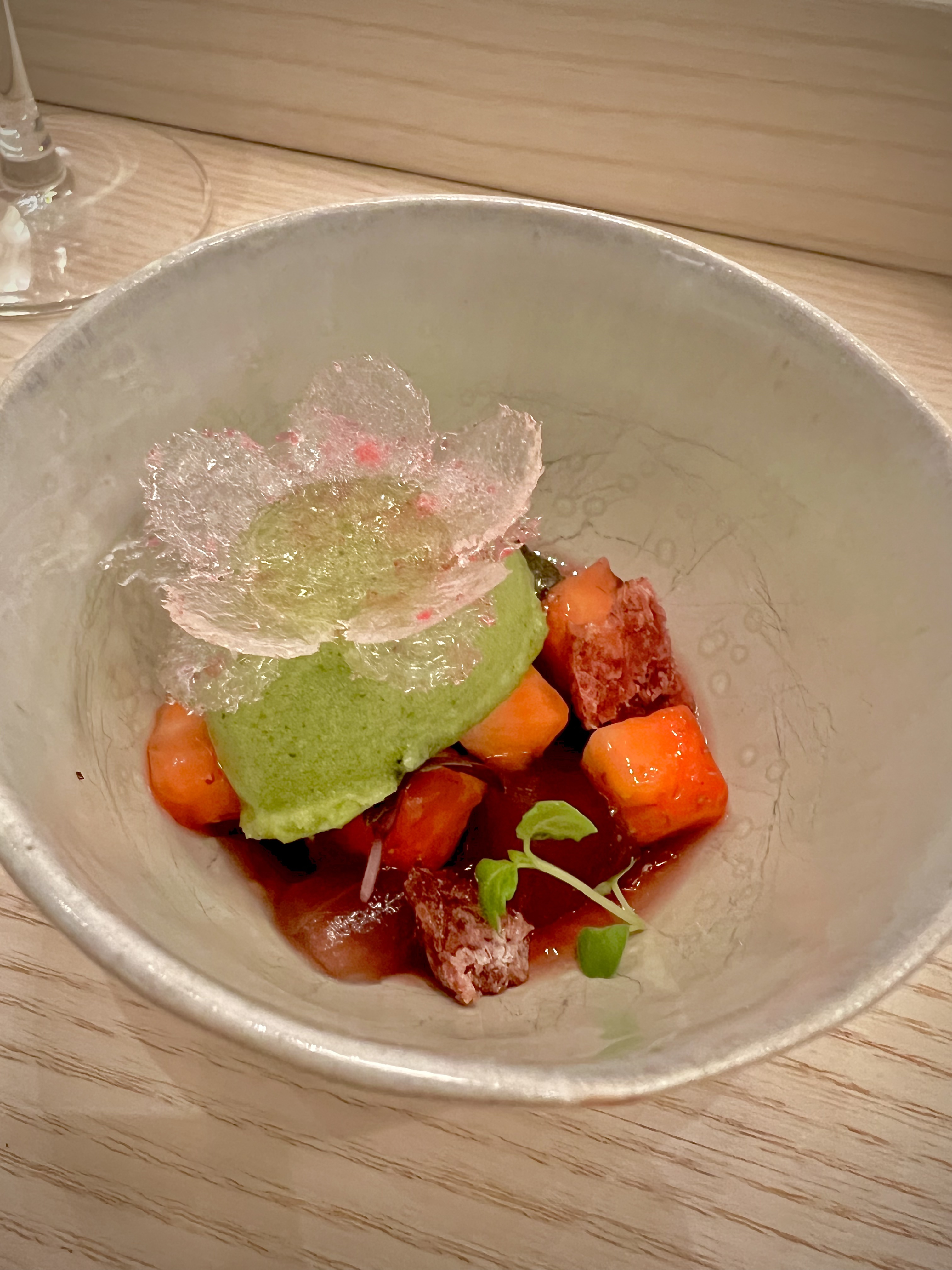 Fleur de sucre, fraises marinées à l’aloe vera et glacée au shiso : dessert rappelant les traditionnels wagashi, ces sucreries et pâtisseries aux 5 sens représentant les saisons. Ici, c’est autour de la fraise, elle est marinée à l’aloé vera, puis travaillée gelée avec ses extractions. Le très aromatique sorbet au shiso vert vient activer de sa pertinence herbacée poivrée cette délicieuse assemblée fraisière. La fleur de fraise en opaline permet, en la cassant, d’accorder tous les arômes en bouche. Une maîtrise parfaite des éléments.