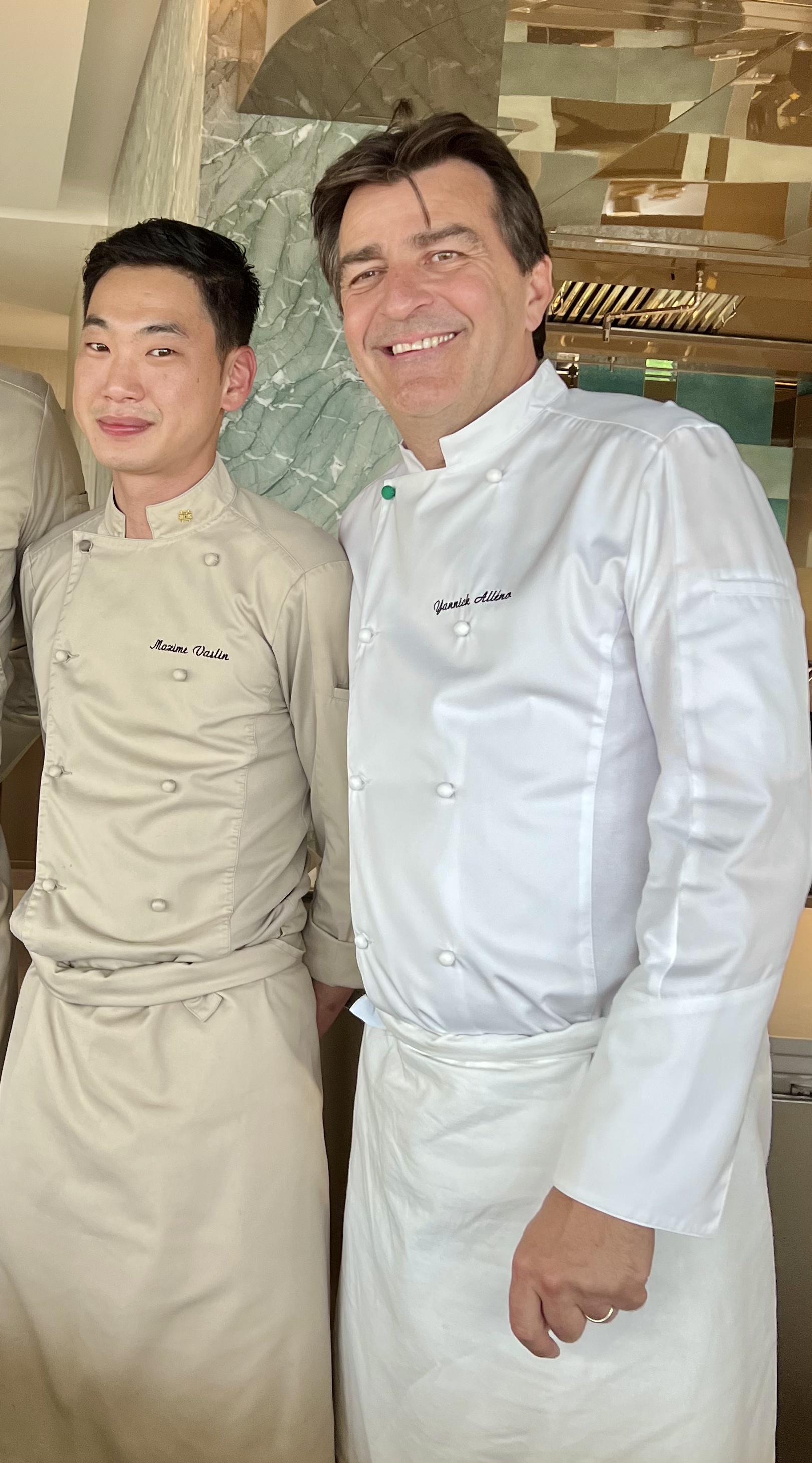 C’est à l’occasion d’un passage à Tokyo que Yannick Alléno rencontre Yasunari Okazaki, alors Maître Sushi dans un établissement du quartier de Ginza. Celui-ci lui redonne l’envie de proposer à Paris une table gastronomique hybride des deux cultures en parfait dialogue, portée au plus haut niveau de l’excellence et du savoir-faire français et japonais. Il lui propose alors de venir en France.