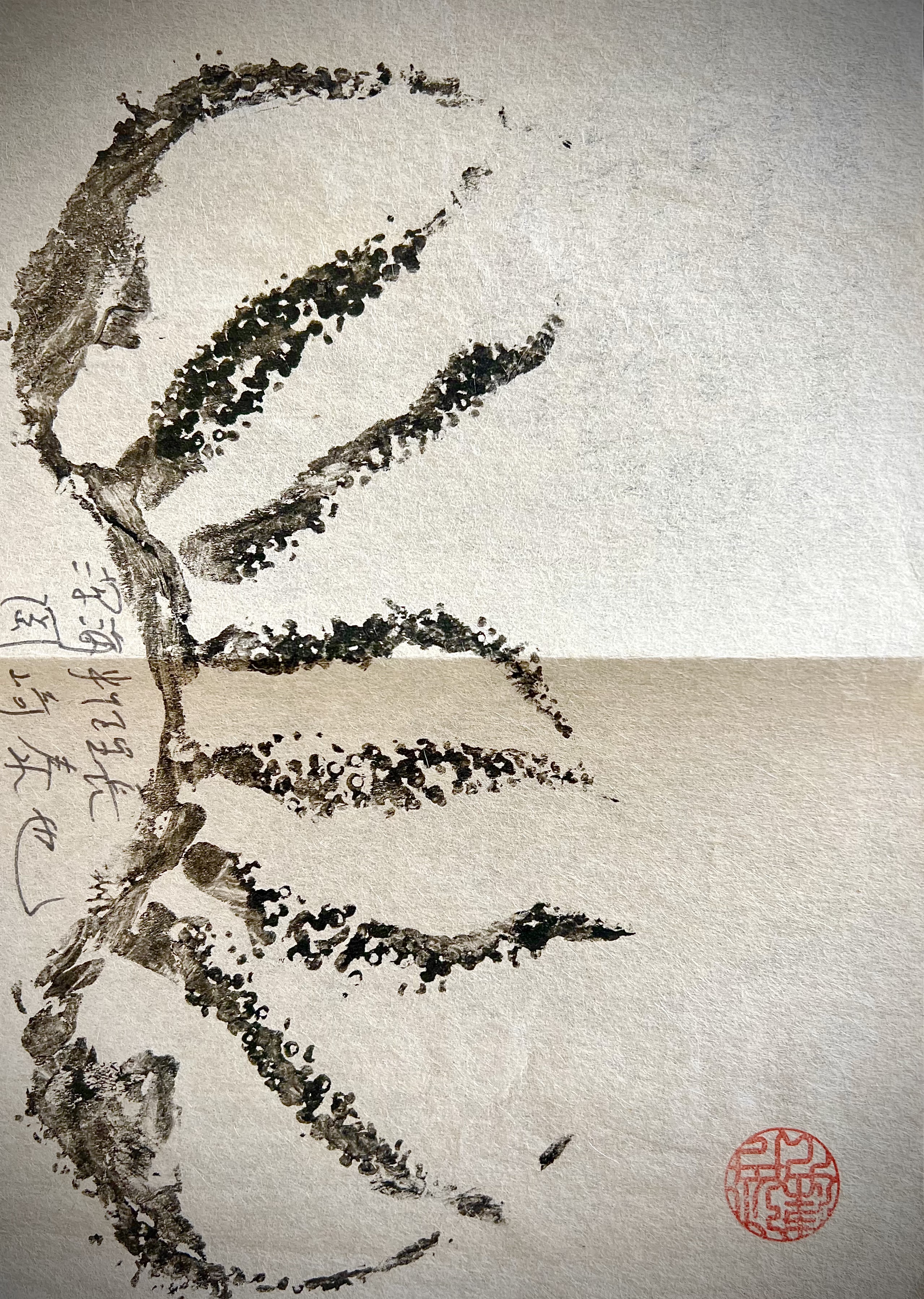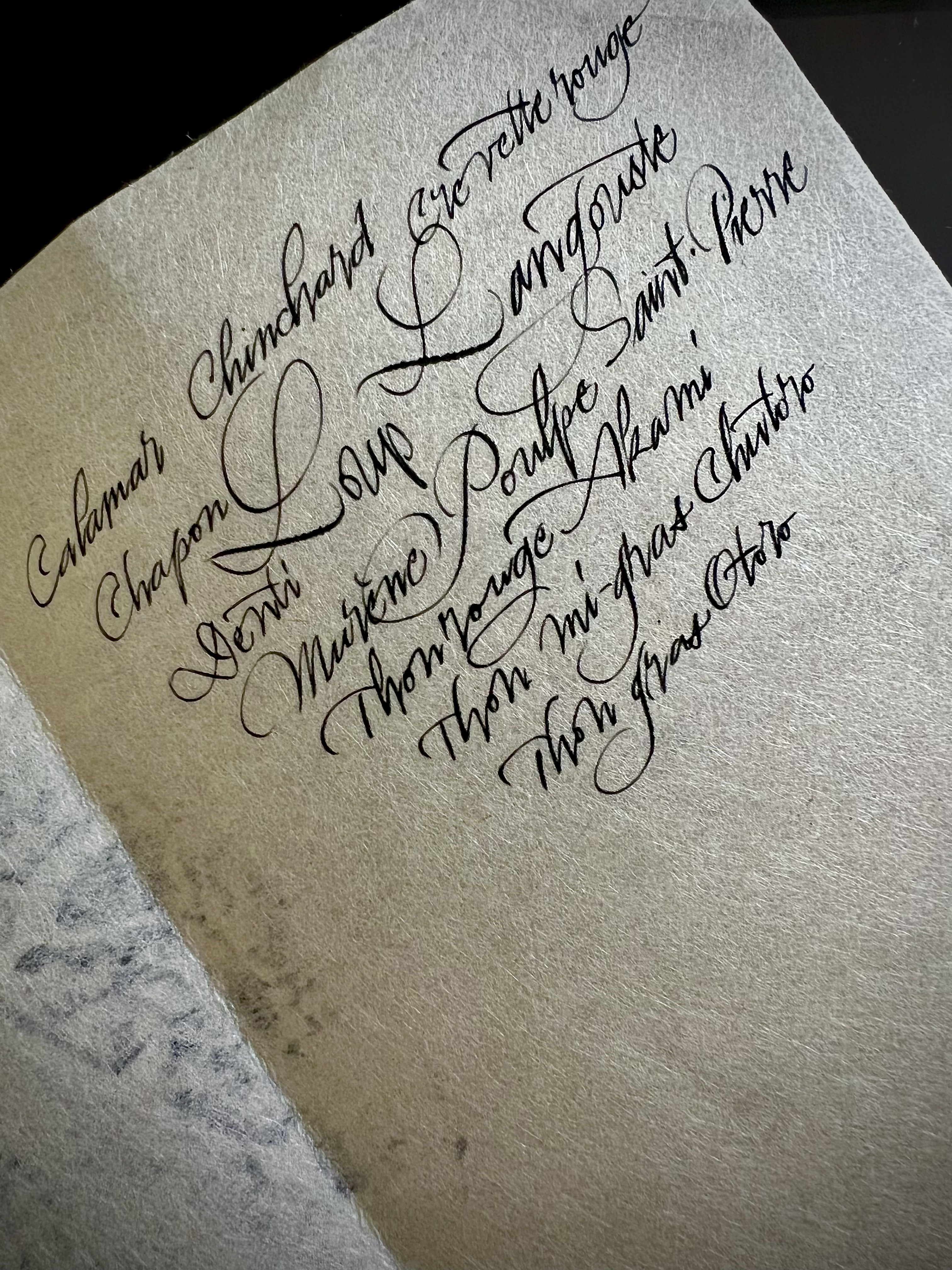 Pour illustrer cette dégustation, le chef vous offre un gyotaku, cet art qui consiste à reproduire des empreintes de poissons sur différents supports, tels que du papier ou du tissu. Développée par les pêcheurs, cette technique japonaise permettait autrefois de conserver un souvenir et une preuve de leurs prises, en appliquant de l’encre de seiche sur le poisson avant de l’apposer sur du papier washi. Tous les matins, le chef fait de même avec la pêche en souvenir du poisson dégusté le jour-même. Chaque pièce, qui est unique, est une oeuvre d’art qui raconte une histoire, celle des profondeurs de la Méditerranée.