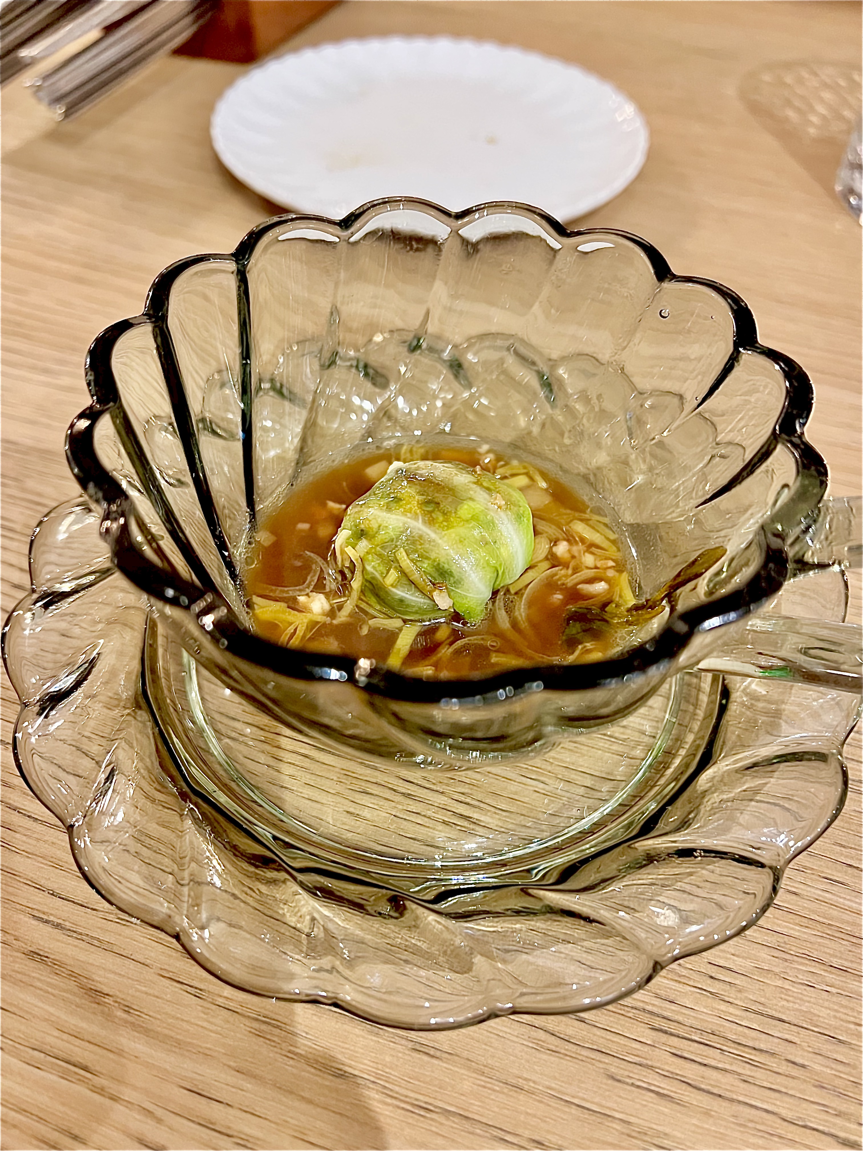 Puis arrive le tourbillon des cinq délicates bouchées, Du bout des doigts, qui ont cette chaleur hivernale et réconfortante, comme ce Mini-chou farci et son bouillon à la conviviale densité d’un potage taillé en trio : lard, poireaux, pomme de terre, comme celui d’une grand-mère un dimanche soir. Ce chou farci minutieux qui est braisé se fait bonbon moelleux mettant parfaitement en exergue l’appétit.