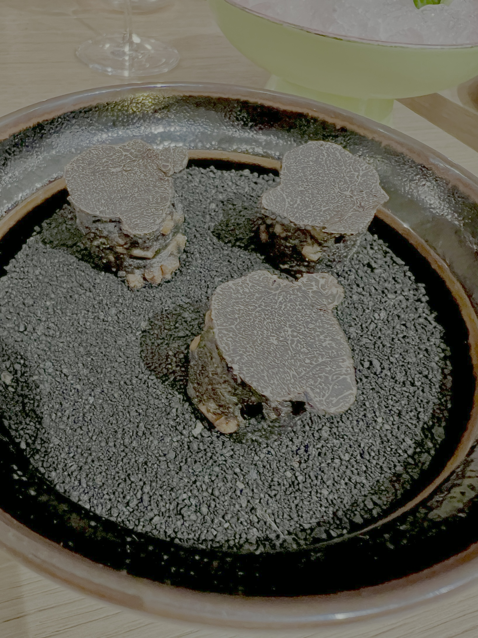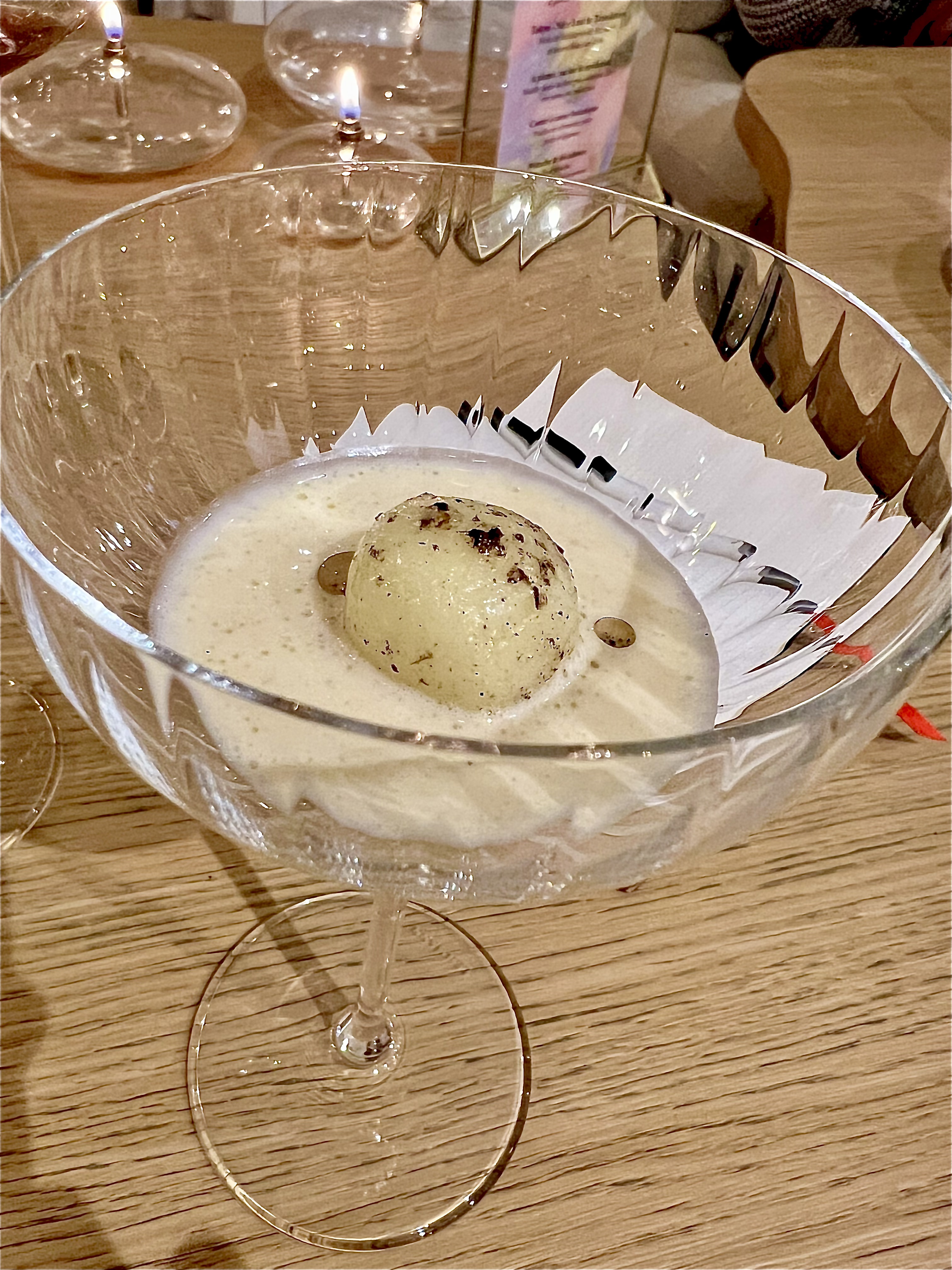 Pomme Dauphine à la truffe : hivernale bouchée de pomme de terre en texture des pépites de topinambours d’une saveur artichaut. La truffe vient saupoudrer et trancher de sa noble valeur terreuse.