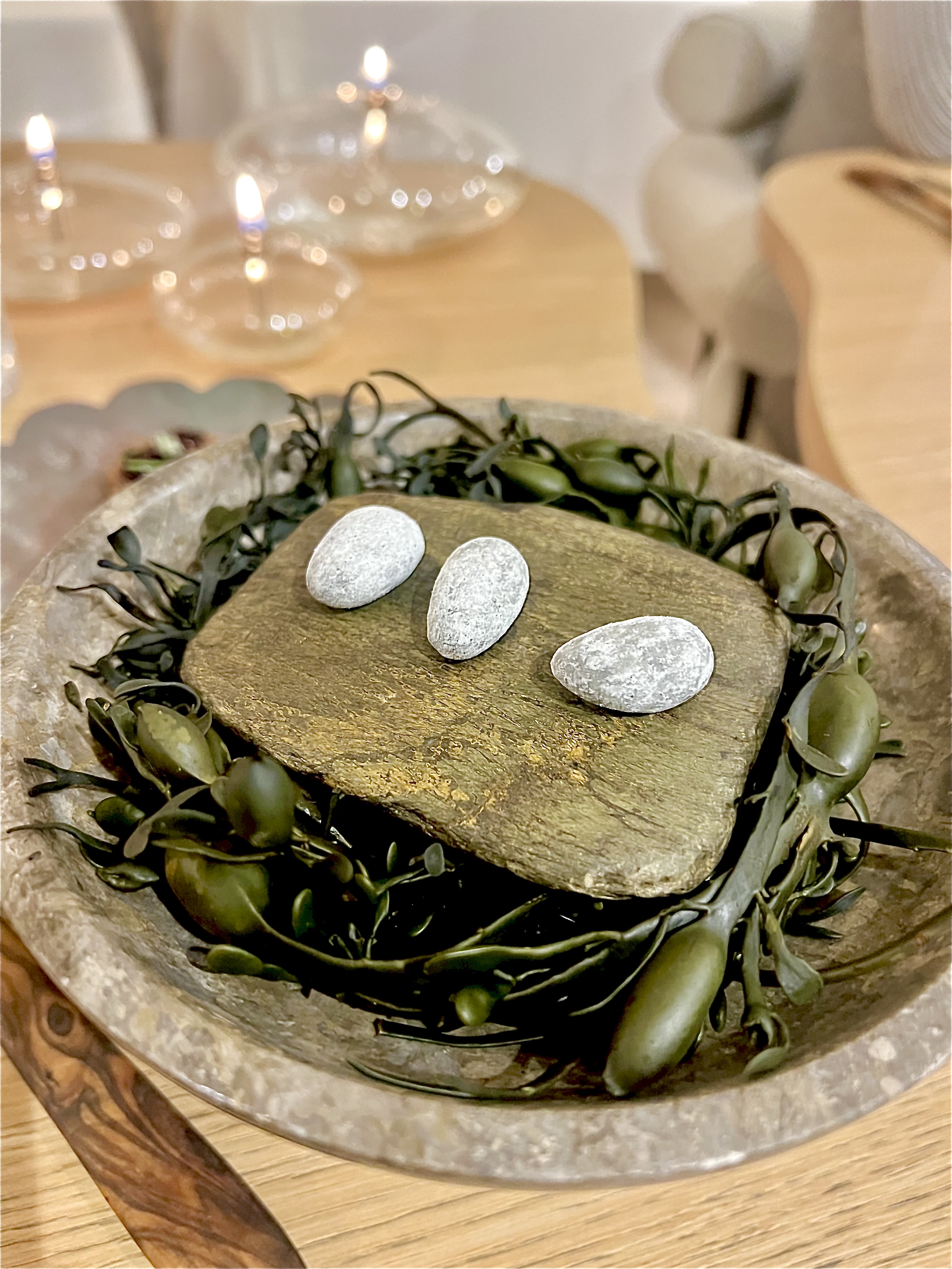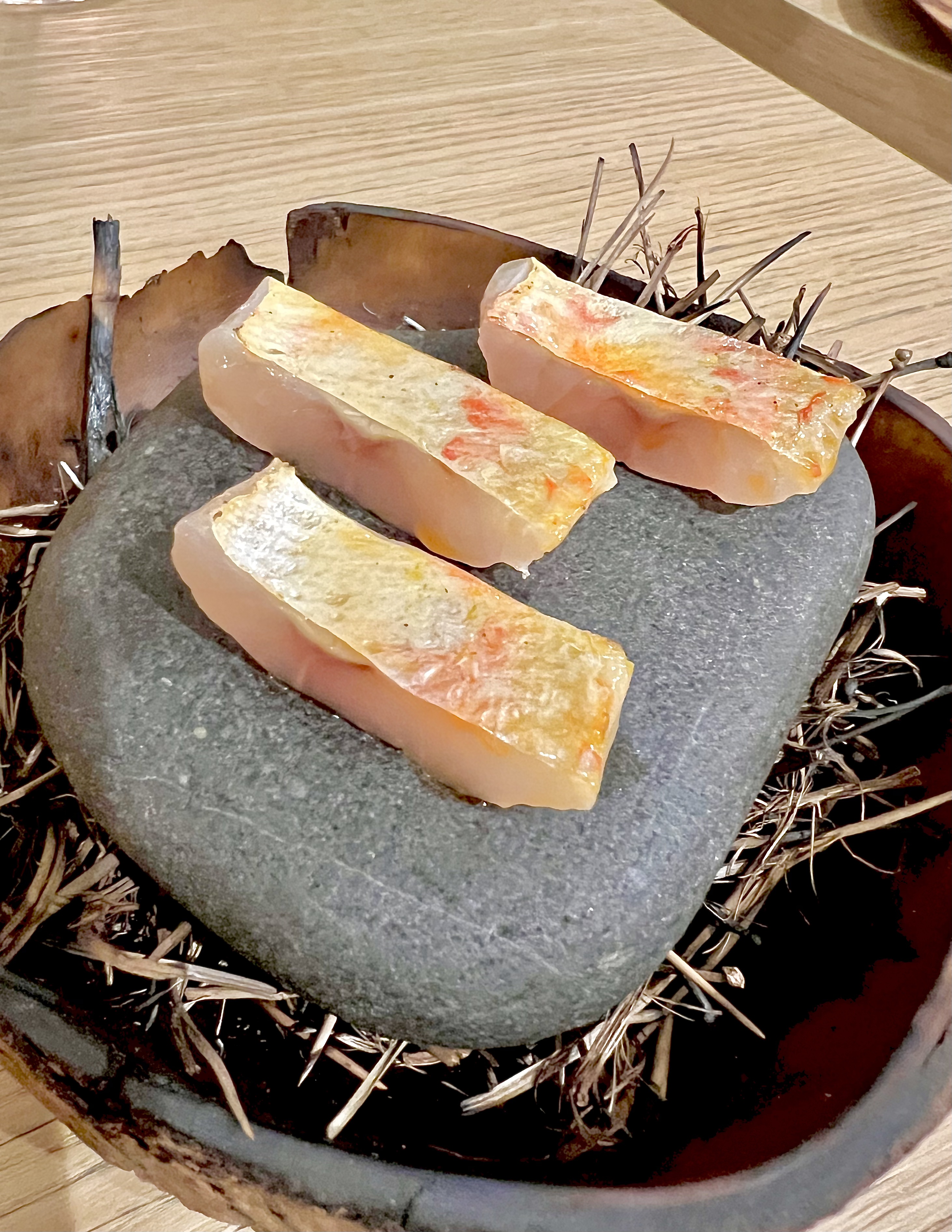 Charcuterie de Rouget sur galet : rarement travaillé à cru, le rouget est ici salé, puis fumé aux épines de pin et devient ainsi charcuterie. Posé sur un galet, ce poisson, à la force iodée si typique, se régule de la salaison et du fumage qui lui apportent gras et densité.