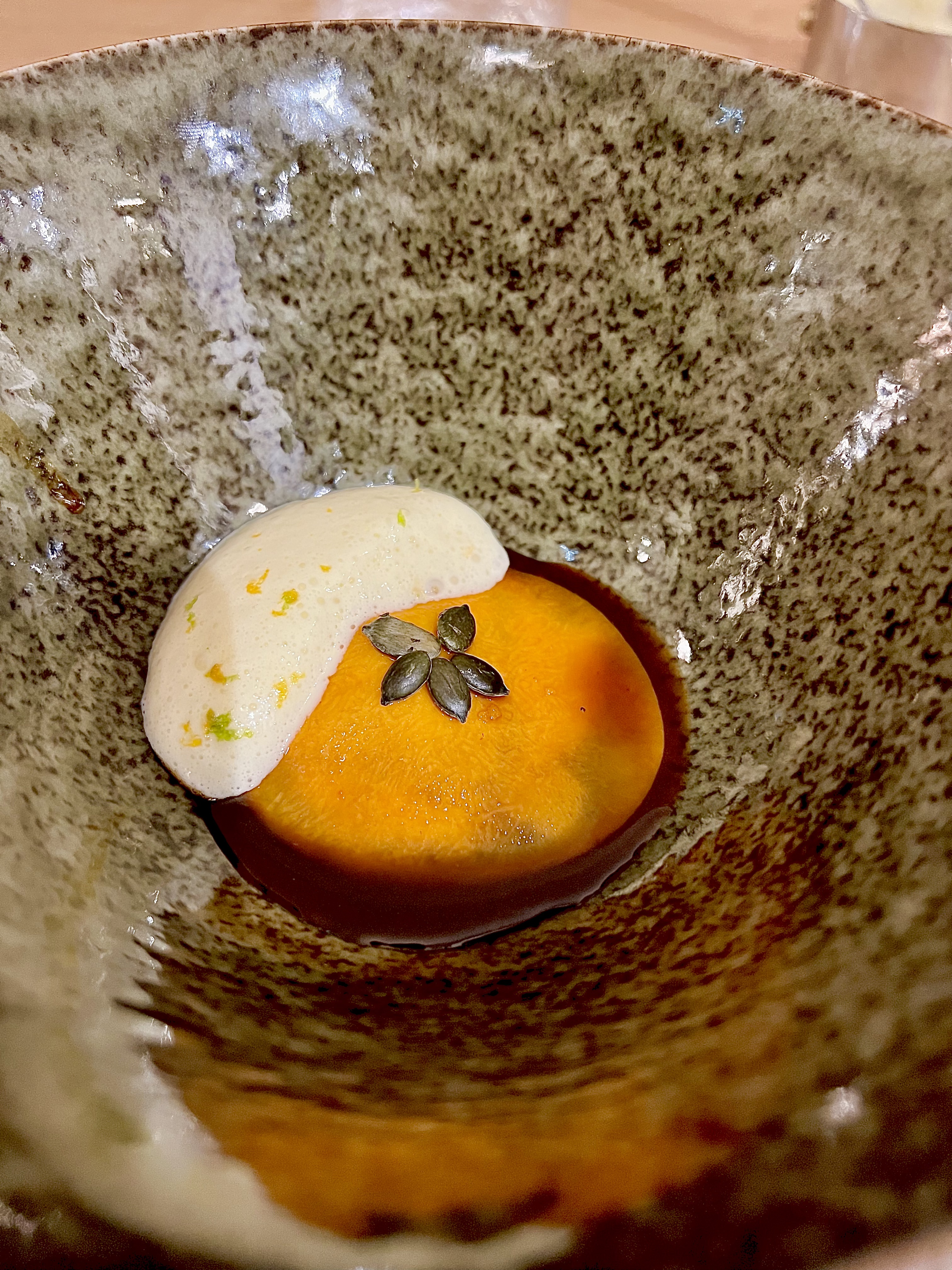 Courge fleurie, fleur d’oranger de Vallauris & réduction d’une sauce bigarade : assiette cratère, la courge de Nice, glacée avec le jus d’un canard à l’orange, se niche de sa fine tranche au coeur d’un volcan d’une crème de potimarron idéalement structurée d’un pralin de graines de courges et de pain croustillant. L’expressive concentration de la sauce bigarade donne la cadence et la pêche à l’ensemble, quant au suave et très aromatique sabayon de fleur d’oranger, il émulsionne avec acuité les envies. Tout est là, en parfaite osmose et enrobe avec amour le palais, entre puissance et délicatesse. À chaque bouchée, vous avez cette folle envie que ce moment ne se termine jamais.