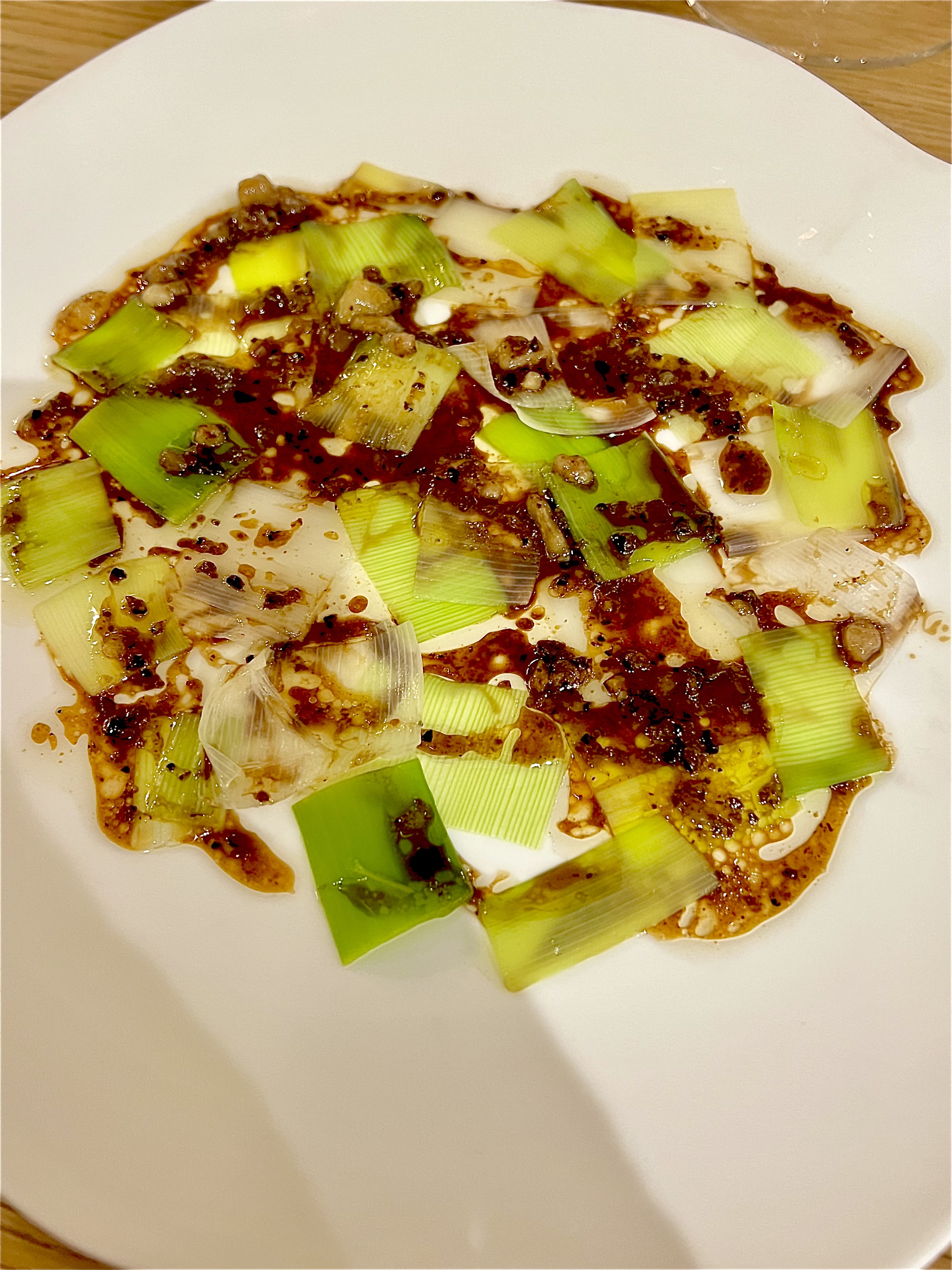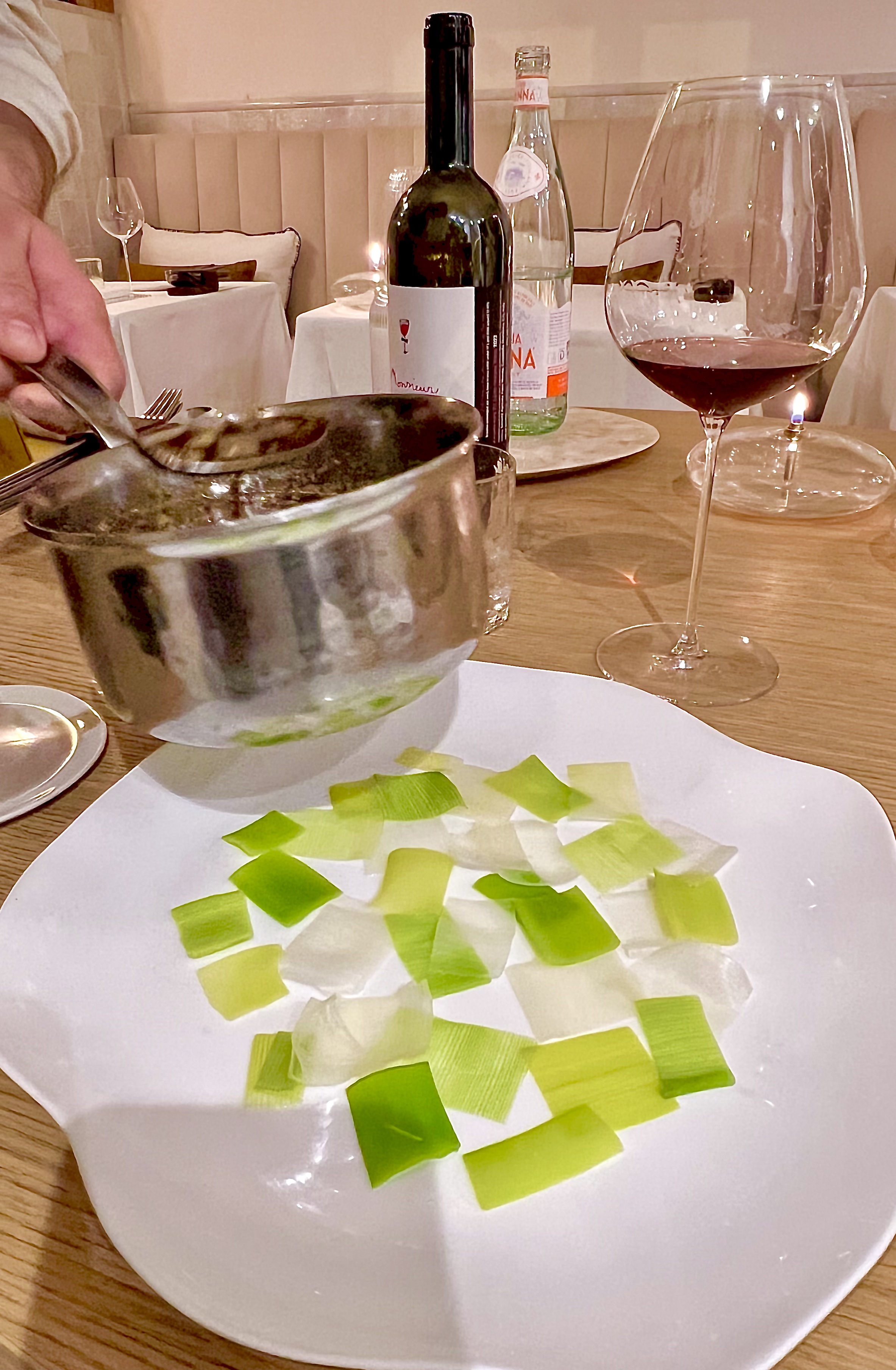 Les Poireaux en mosaïques : de Guérard à Bocuse. Cet effeuillé de poireaux, cuits à la vapeur et en pureté végétale du vert et du blanc, s’animalise en passion d’un vigoureux bouillon de pot-au-feu à la moelle et à la truffe Melanosporum. Ce plat, qui au début semble simpliste et nu, change totalement de destinée au versement de la sauce. Un plat vivant et évolutif, où le healthy se nourrit de l’héritage culinaire et s’engourmandise de la force du terroir. Bluffant, brillant d’efficacité et totalement addictif.