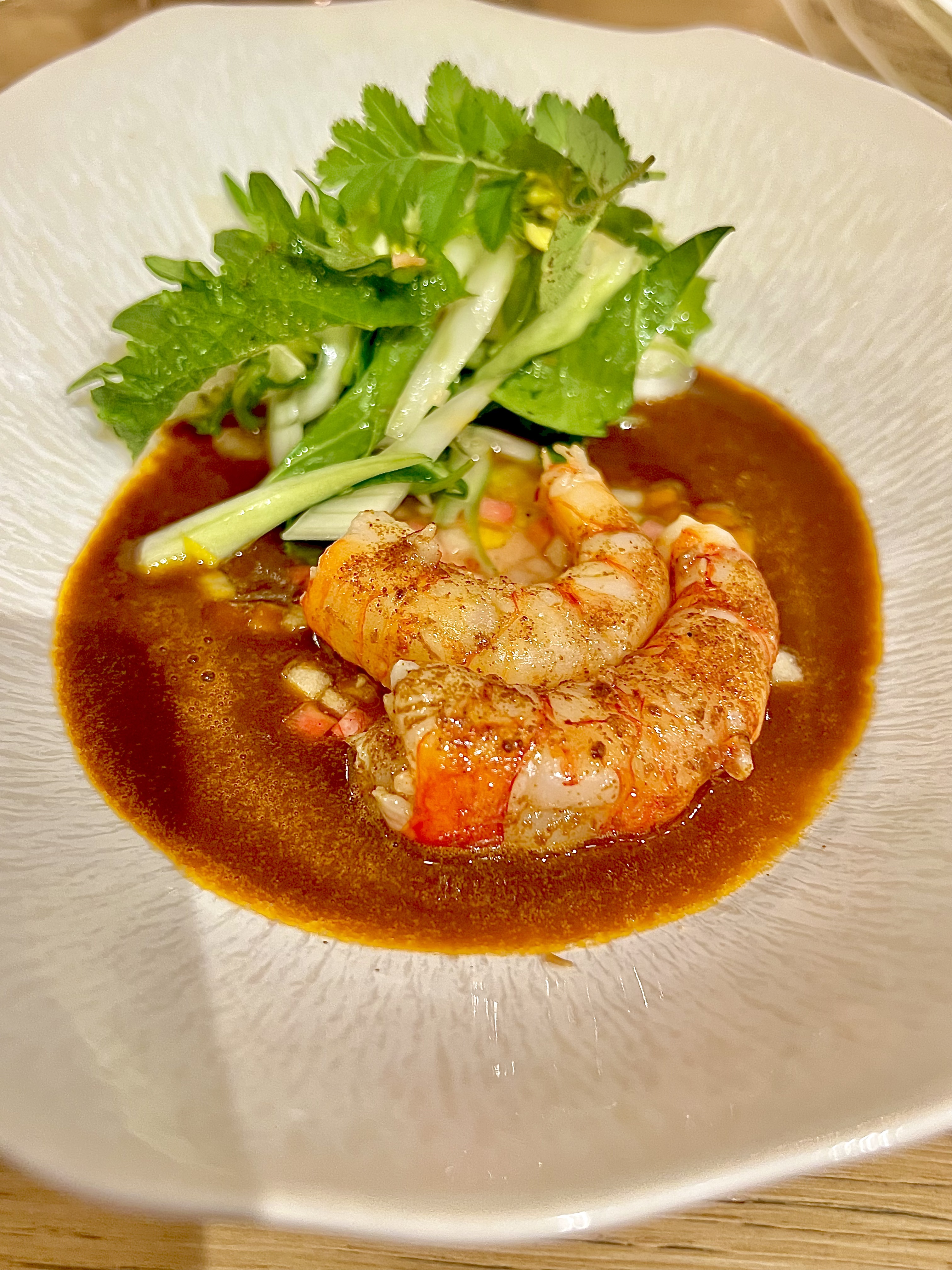 Bouquet d’azur, labyrinthe de légumes, vinaigrette shiso et gamberoni des grands fonds : lorsque les mythiques et italiennes gamberonis s’acoquinent des saveurs des marchés d’Asie. À peine flashées pour garder de leur matière, elles nagent de bonheur dans la sublime extraction des têtes et carapaces, qui a cet inégalable et puissant goût de ces têtes que l’on succionne avec ardeur et attention. Le Cime di Rapa (pousses de brocoli), le pissenlit, l’oxalis et la citronnelle sont la fraîcheur et la croque attendus. Les pickles de radis s’émancipent de leur sucrosité et la vinaigrette de shiso extériorise pleinement sa vivacité herbacée pour titiller et sublimer ce captivant écosystème culinaire.