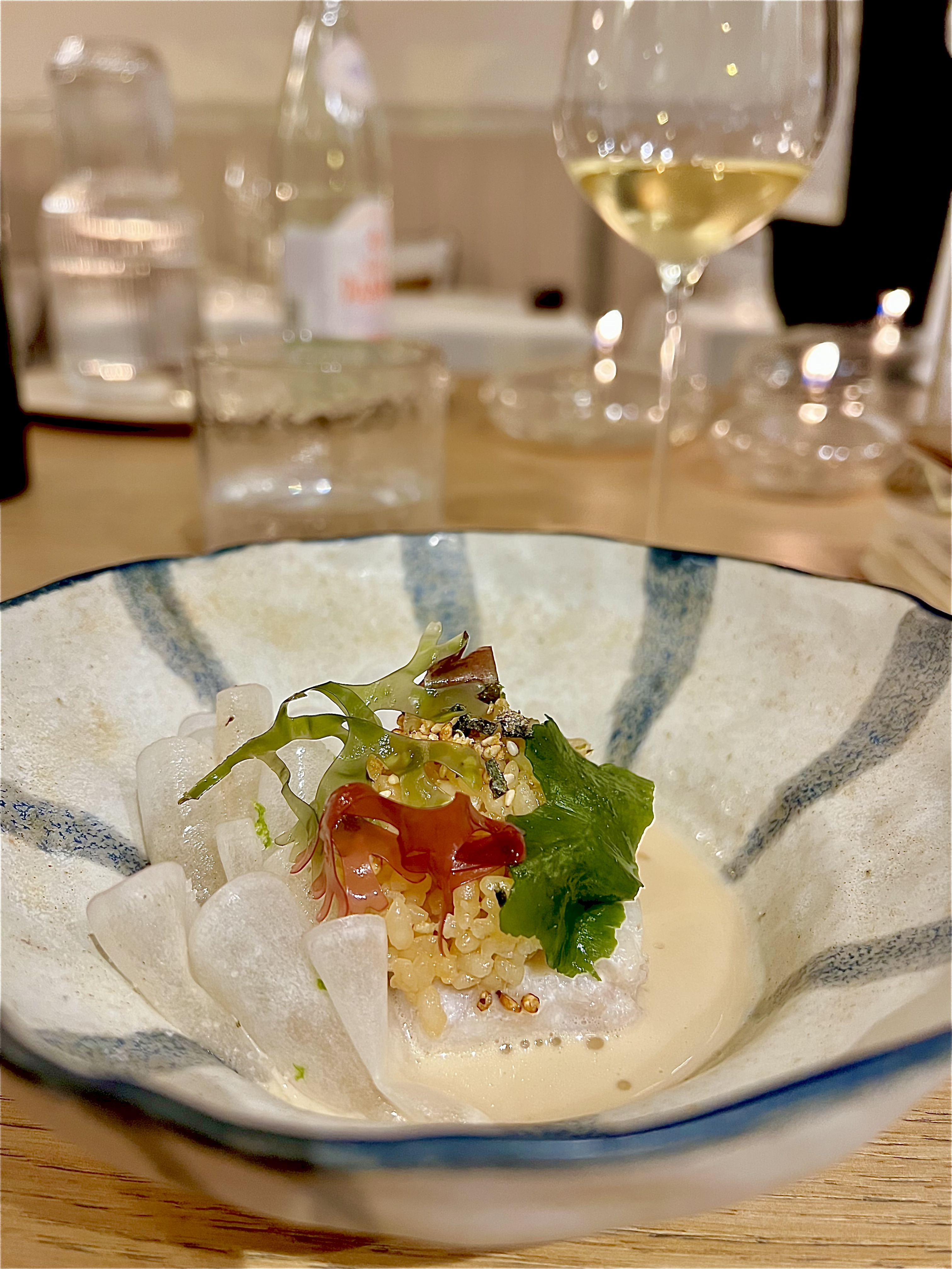 Tokyo – Nice Lost in Translation, Pêche de Méditerranée, riz, navet et beurre blanc au dashi : la pêche d’ici parle japonais de son noble riz koshihikari agrémenté de mirin et de furikake (condiment à base d’algues et de sésames). Le merlu est cuit en simplicité et perfection à la vapeur, le dashi (bouillon d’algues et flocons de bonites) est monté avec habileté au beurre et devient gourmande sauce d’une extrême finesse iodée qui régale le riz de sa souplesse. Le navet primeur, en tranches porcelaine, croque de sa virginité printanière. À nouveau, tout est en équilibre, aérien et incisif, et délivre un plaisir intense.