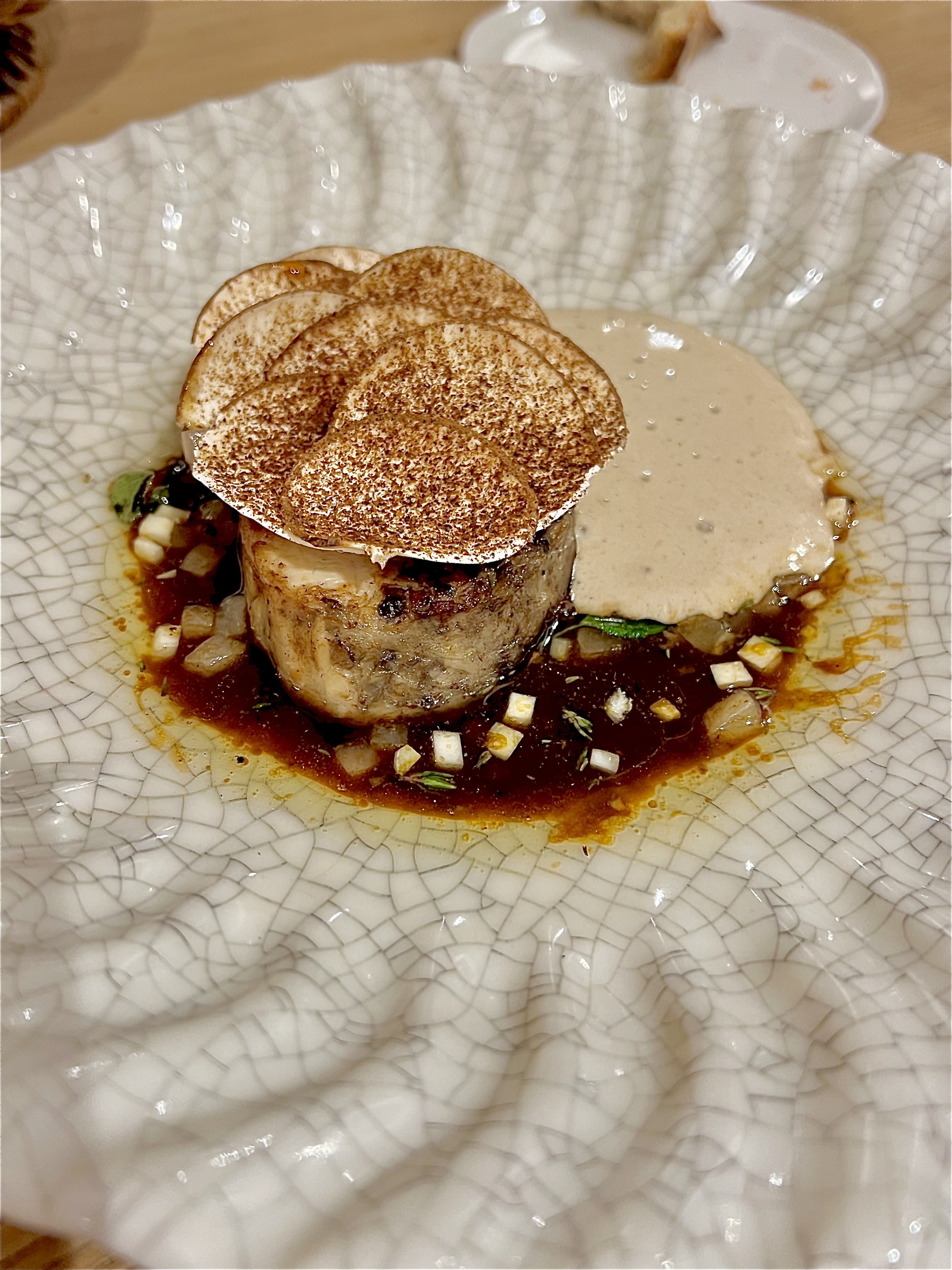 A plume, racine & oxydation, Volaille farcie au foie gras, sabayon céleri-vin jaune, jus malicieux : la fondante volaille chaponnée, colorée et nourrie de ferveur, s’exprime par ses suprêmes farcis des cuisses, des champignons et du foie gras. Les écailles de champignons de Paris se poudrent de la texture forestière d’un cacao de cèpes. Le très gourmand sabayon de céleri au vin jaune se délasse et s’enivre avec extase du généreux jus de volaille tranché de malice du lard de Colonata, dans l’idée du poulet rôti du dimanche qui se sauce sans aucune retenue.