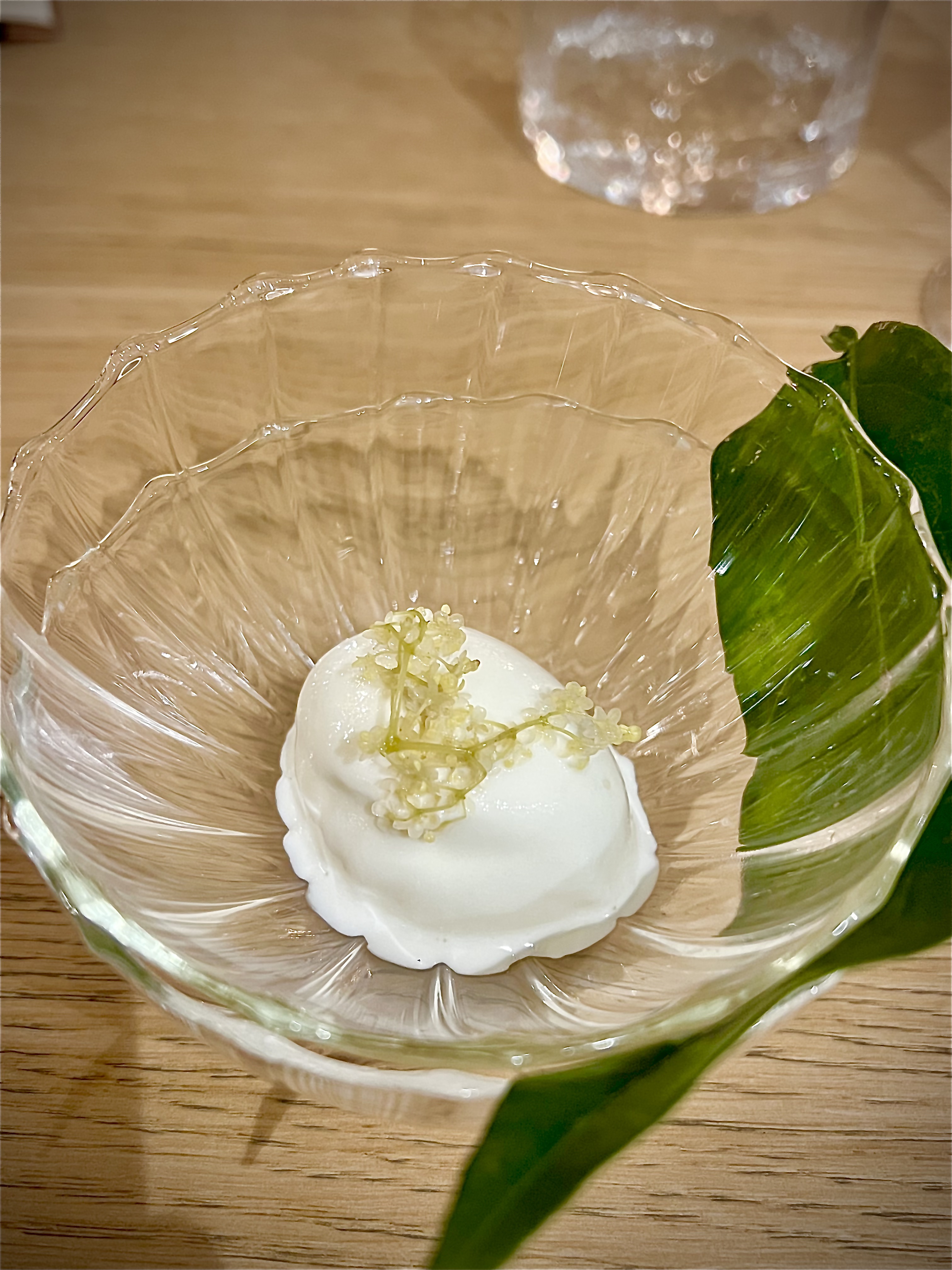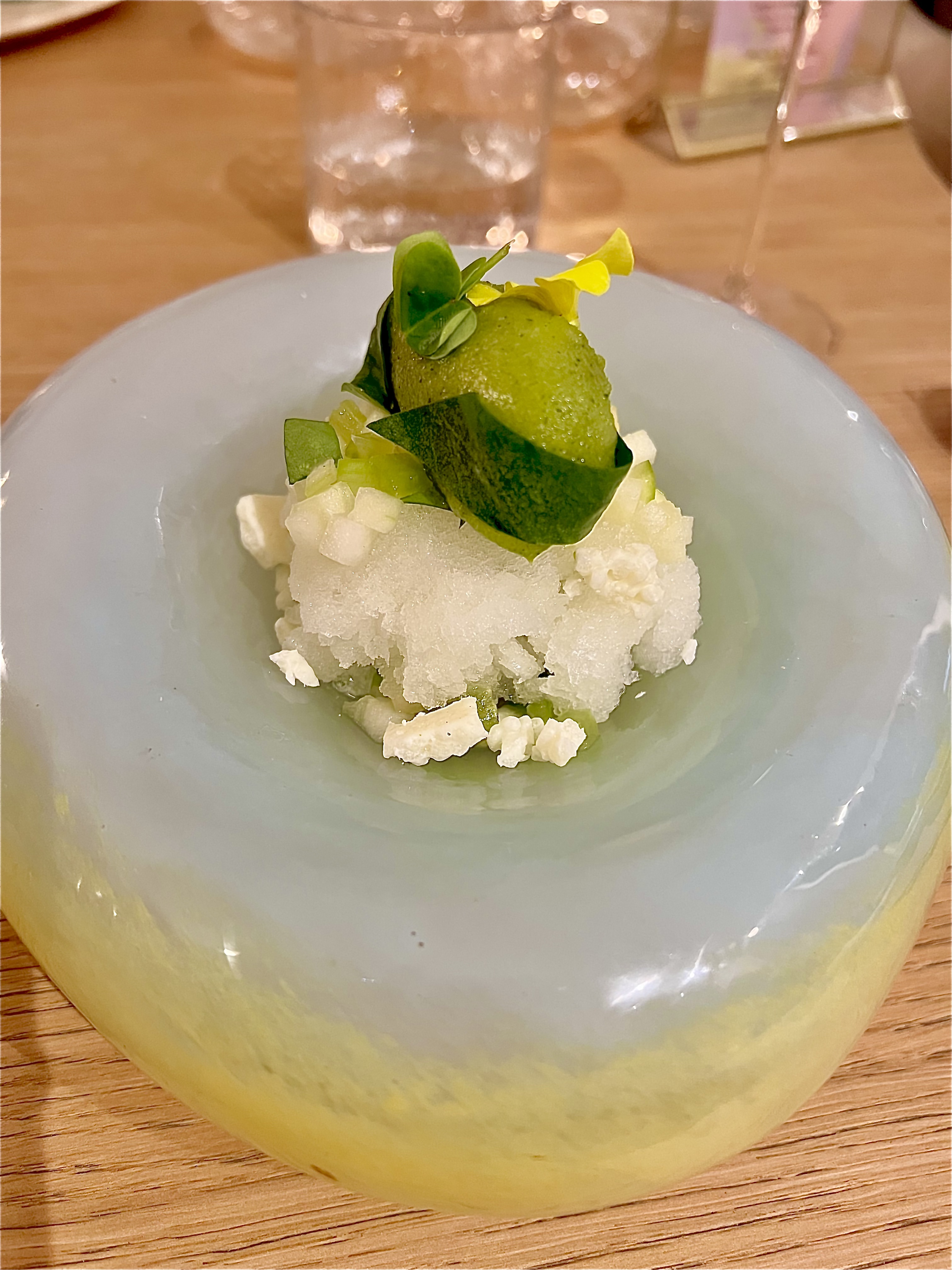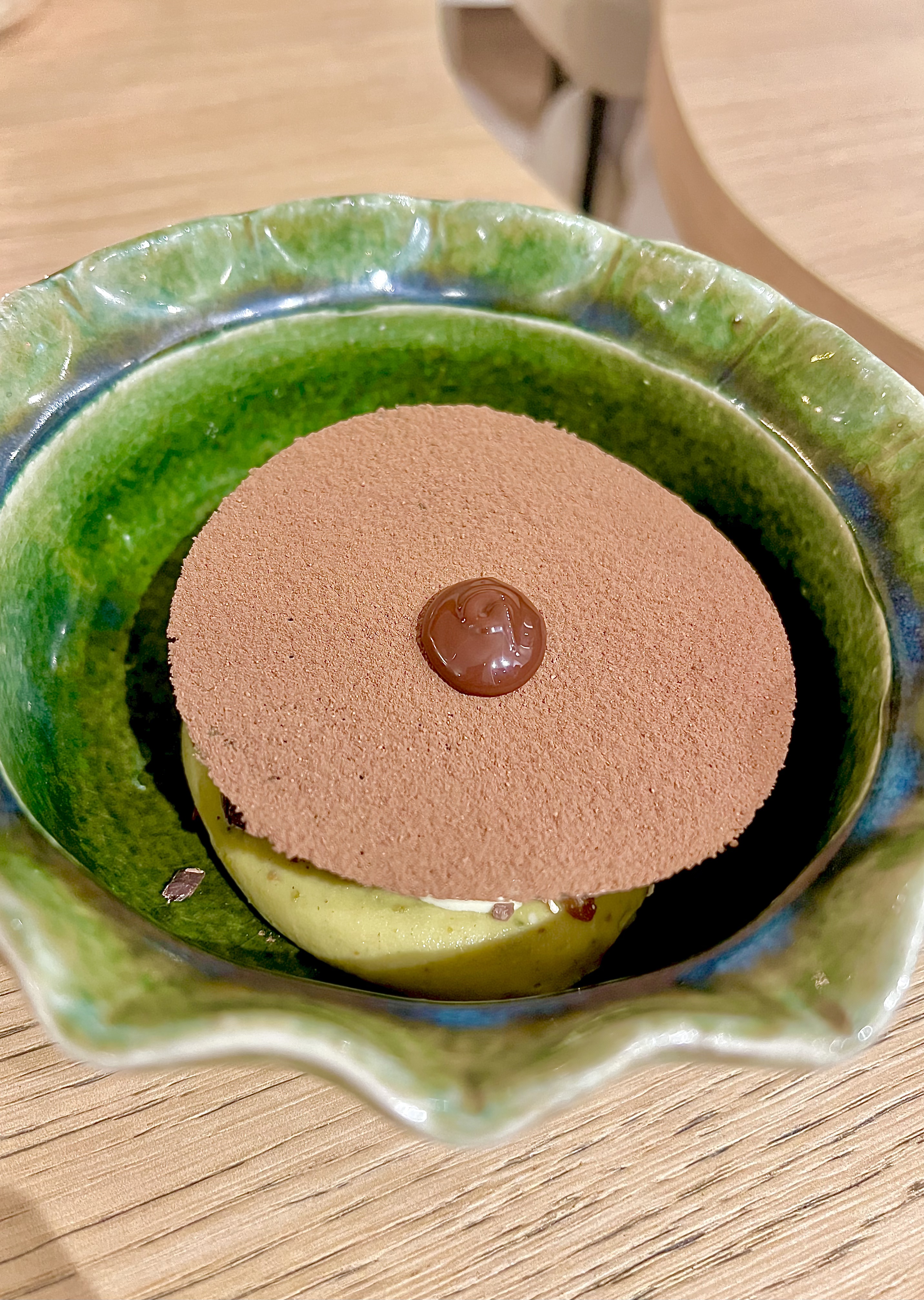 Les desserts balancent entre pimpance et réconfort, comme avec le Coeur à coeur botanique, feuilles de citronnier, poire fruits et légumes : véritable claque de fraîcheur en strates qui réveille les papilles. On y retrouve le citron, l’oxalis, la pomme et le kiwi pour la matière. Le granité se fait croustillant glacé à la douceur de la poire et le sorbet à la feuille de citronnier arrondit de son toucher velours et recentre avec sa saveur agrume-herbacée.