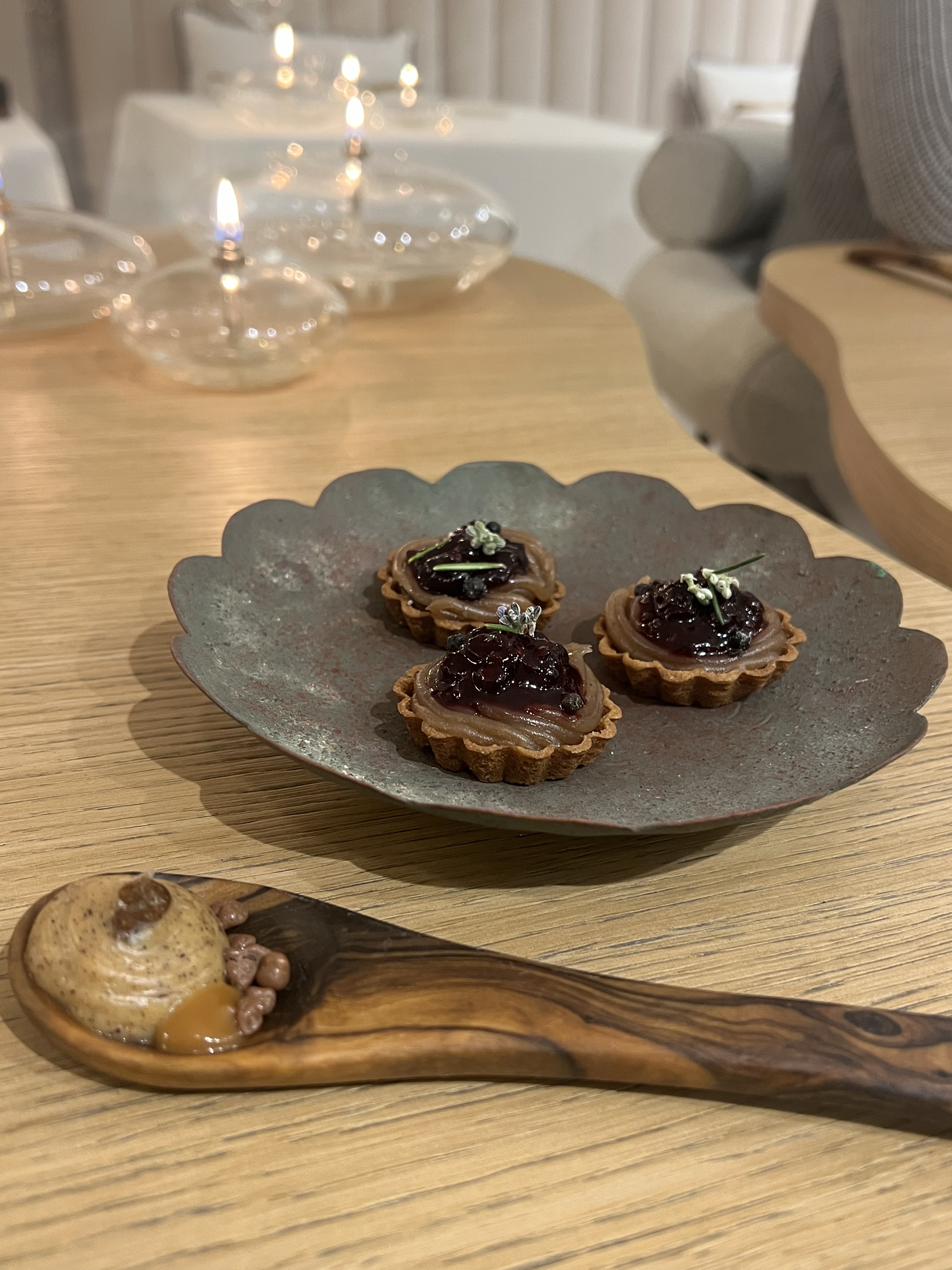 Tartelette dans l’idée d’un Mont-Blanc, crème de marron en acidité du cassis, Galet de Nice amande et chocolat, Autour de l’agrume orange, orange sanguine, mandarine et kumquat jus de la crêpe Suzette au Grand-Marnier, Glace à la fleur de Sureau et Cuillère crémeux et caramel de noisette et praliné au chocolat.