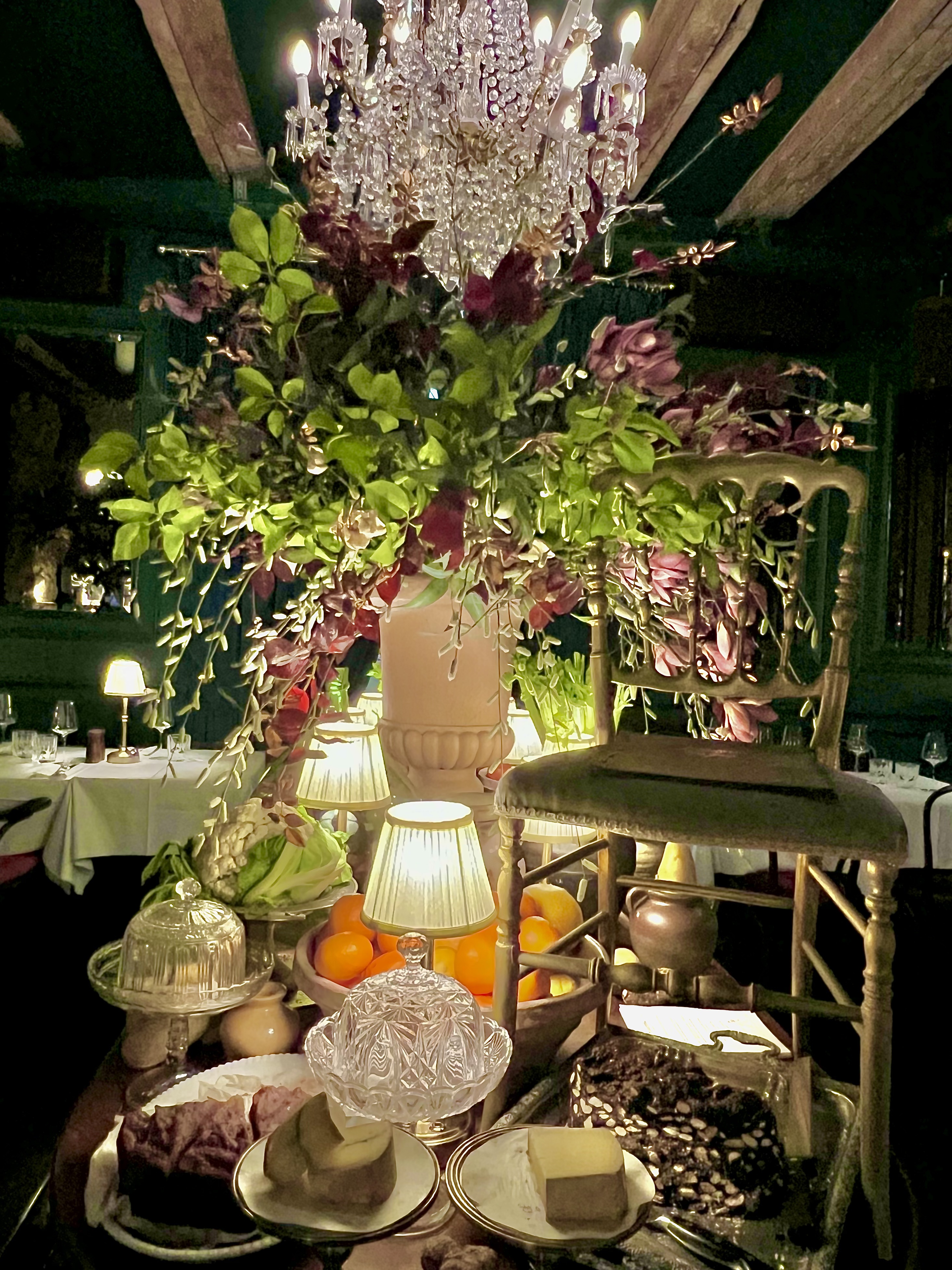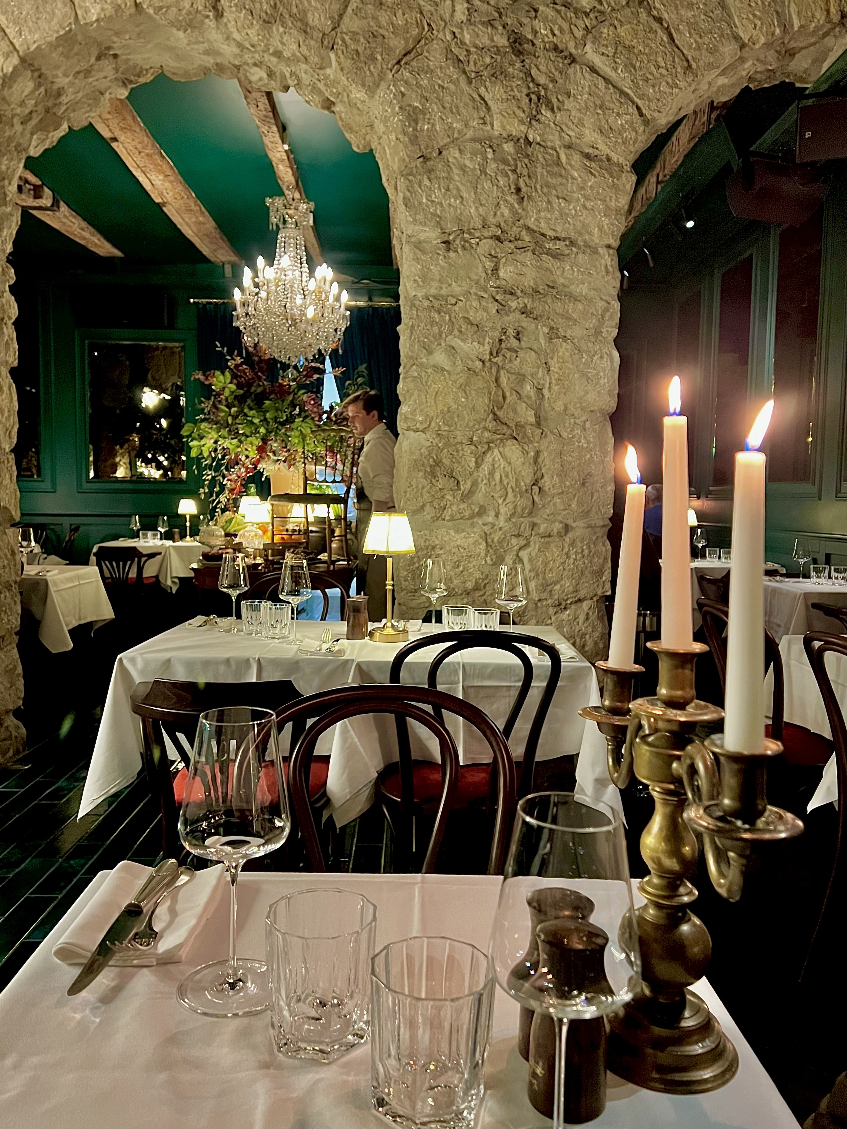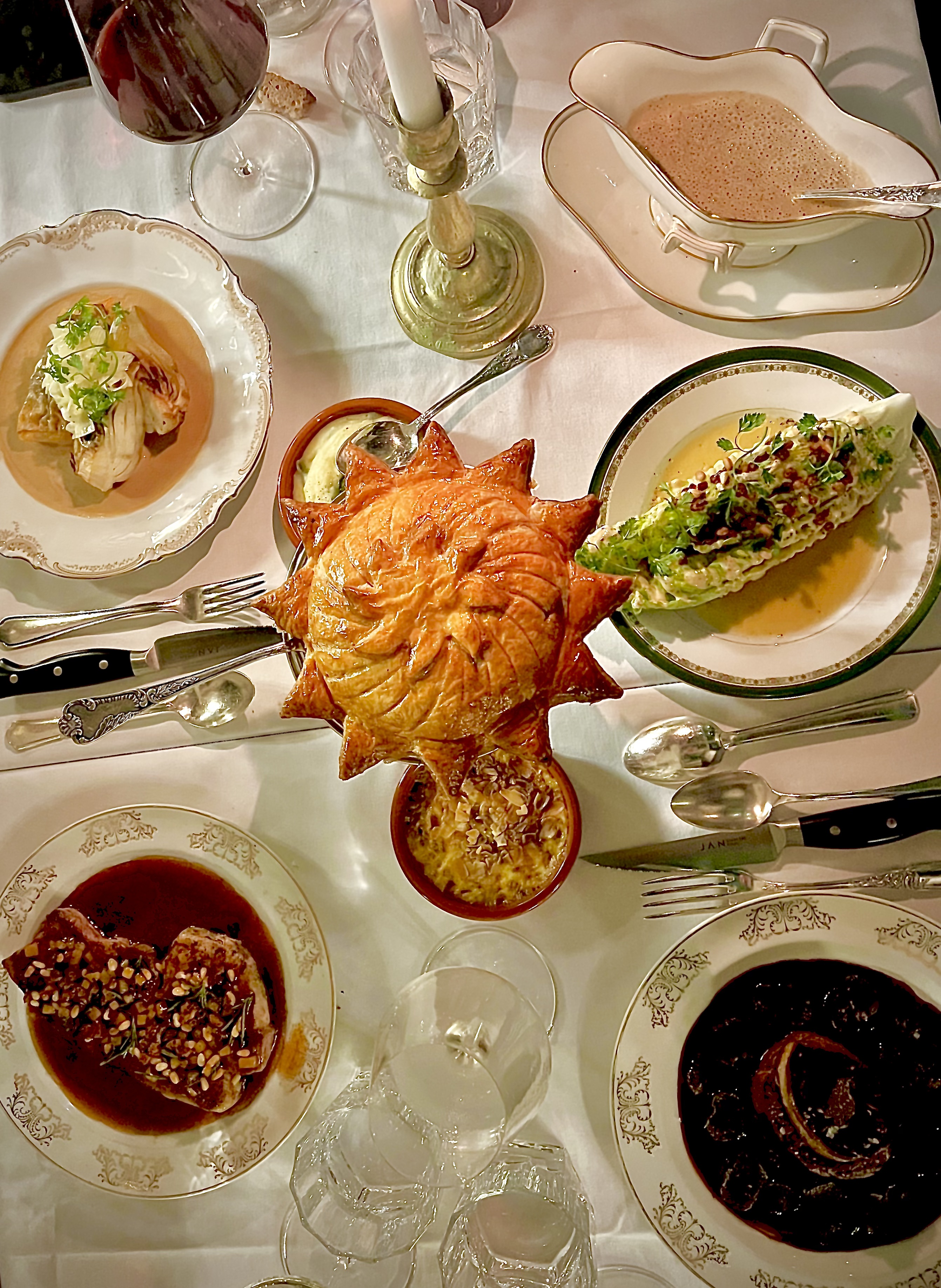 C’est en février dernier, qu’il a officiellement inauguré sa nouvelle adresse à Nice, située juste à côté de son restaurant gastronomique et étoilé. Toujours entre ses deux mondes, la Riviera et son pays natal, Le Bistrot de JAN, entièrement pensé de l’imaginaire du chef, est un fabuleux mélange des genres, entre audace et douceur onirique, aussi bien dans les assiettes que dans le décor qui éclate de vie et de rythmes des années folles. Un bistrot délicieusement « à la française », racé à l’atmosphère fantasque cocteauesque et tamisée à la bougie qui virevolte entre un tableau de Toulouse Lautrec et une soirée mondaine et exaltante d’un Hollywood baroque des années 30… Josephine Baker n’est sûrement pas très loin. Tout est parfaitement conçu avec goût et espièglerie. Une fois poussée la porte, on entre dans un autre monde, bien loin du quotidien, celui du glamour, de l’insouciance et de la franche et élégante gourmandise. Le vert foncé aux murs et les dorures en discrétion ne sont pas sans rappeler les couleurs du drapeau des origines de Jan. La musique jaillit d’un électrophone des temps modernes entre charleston, jazz et chansons populaires qui fait swinguer la salle en douce harmonie. Quant à la vaisselle rétro et la belle argenterie, elles donnent le ton de ce ballet gourmand.