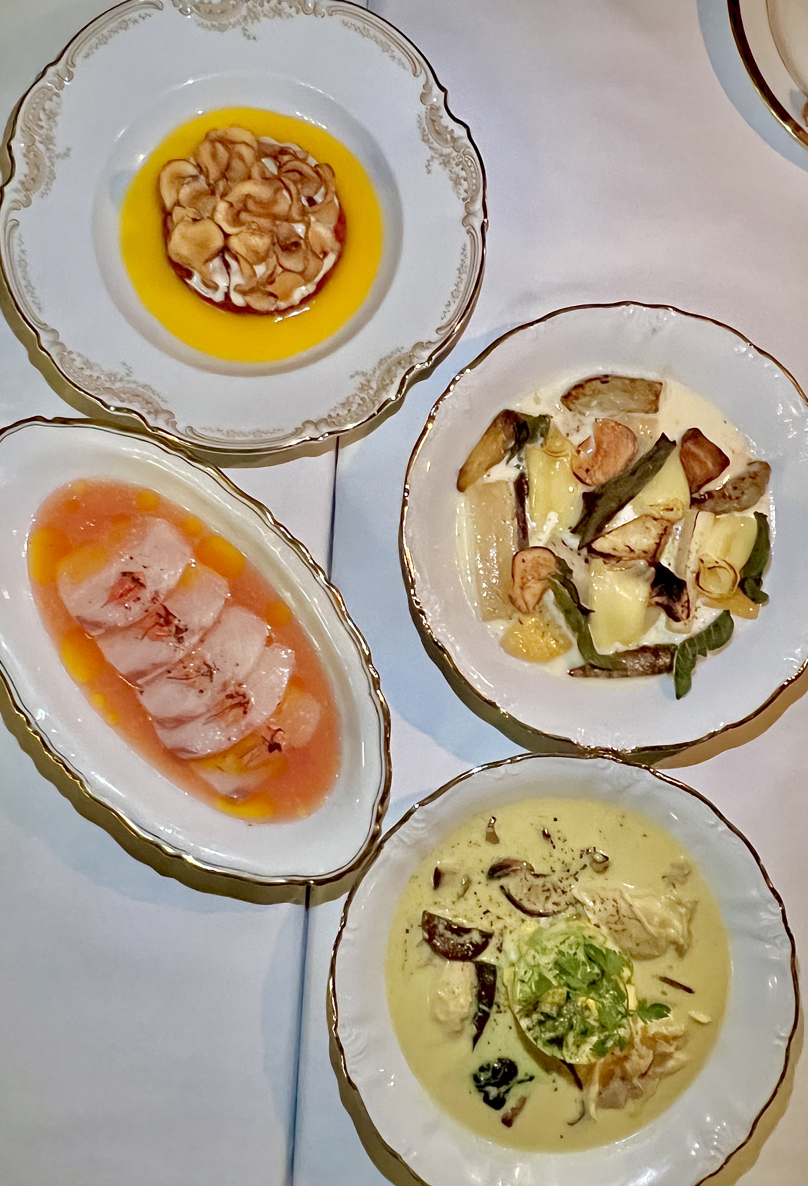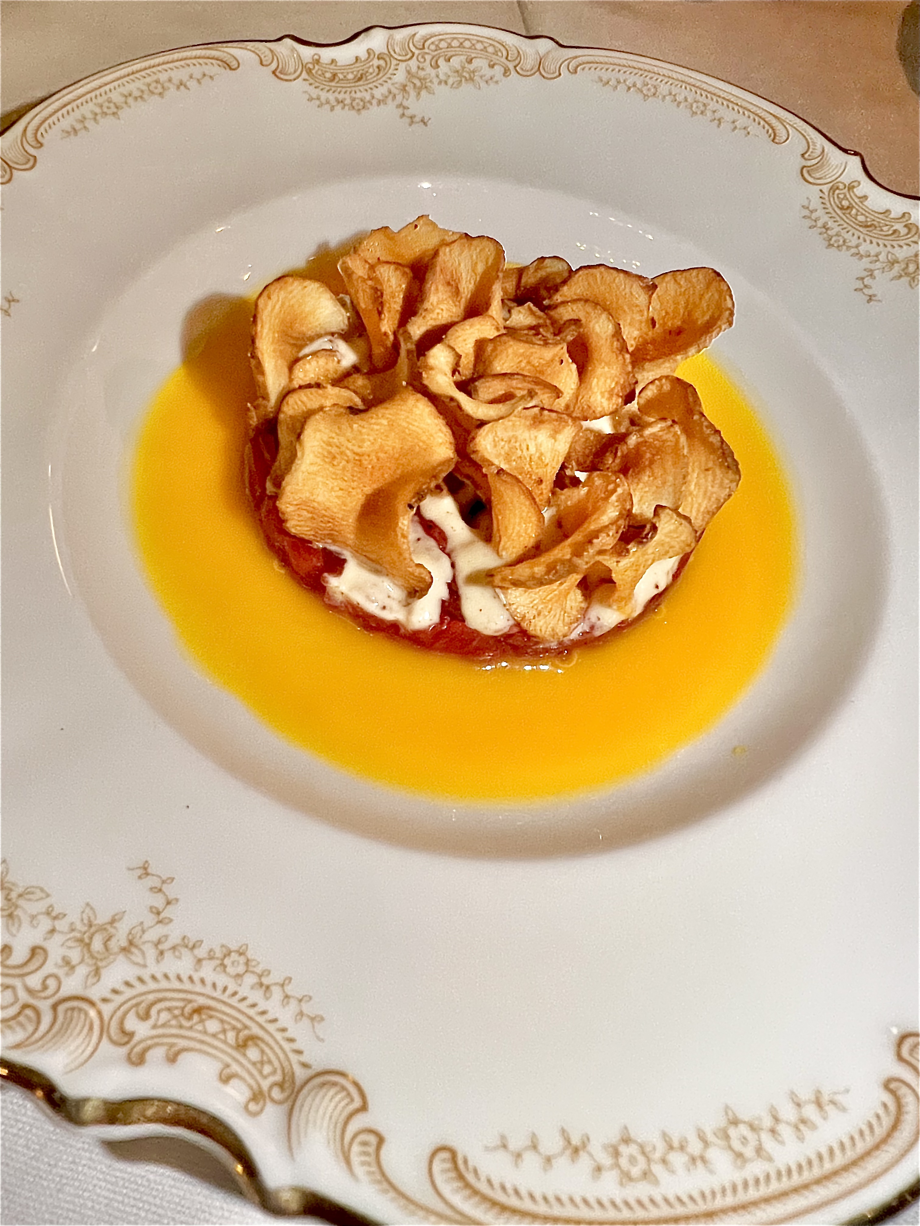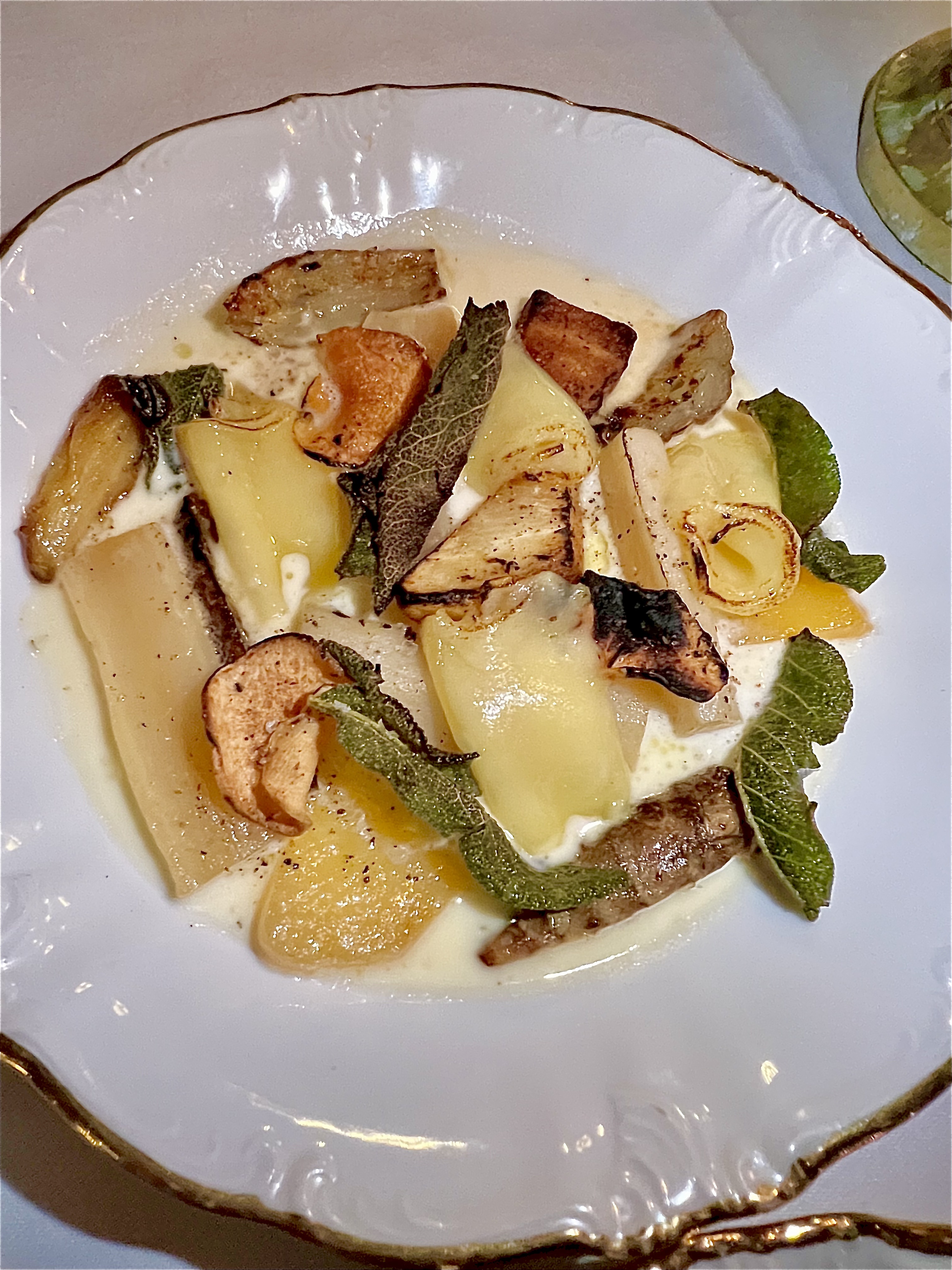 Les Légumes oubliés, comté, amasi et sauge : on croque de vie dans ces légumes oubliés (topinambours, crosnes et salsifis), le lait fermenté traditionnel sud-africain amasi vient velourer l’ensemble de son charme lacté et le comté engourmandise de son identité noisettée. La sauge, brûlée à la flamme juste avant de servir, tout comme les légumes et le comté, embaume de son ésotérique parfum. Une assiette qui fait plaisir par son côté régressif-moderne.