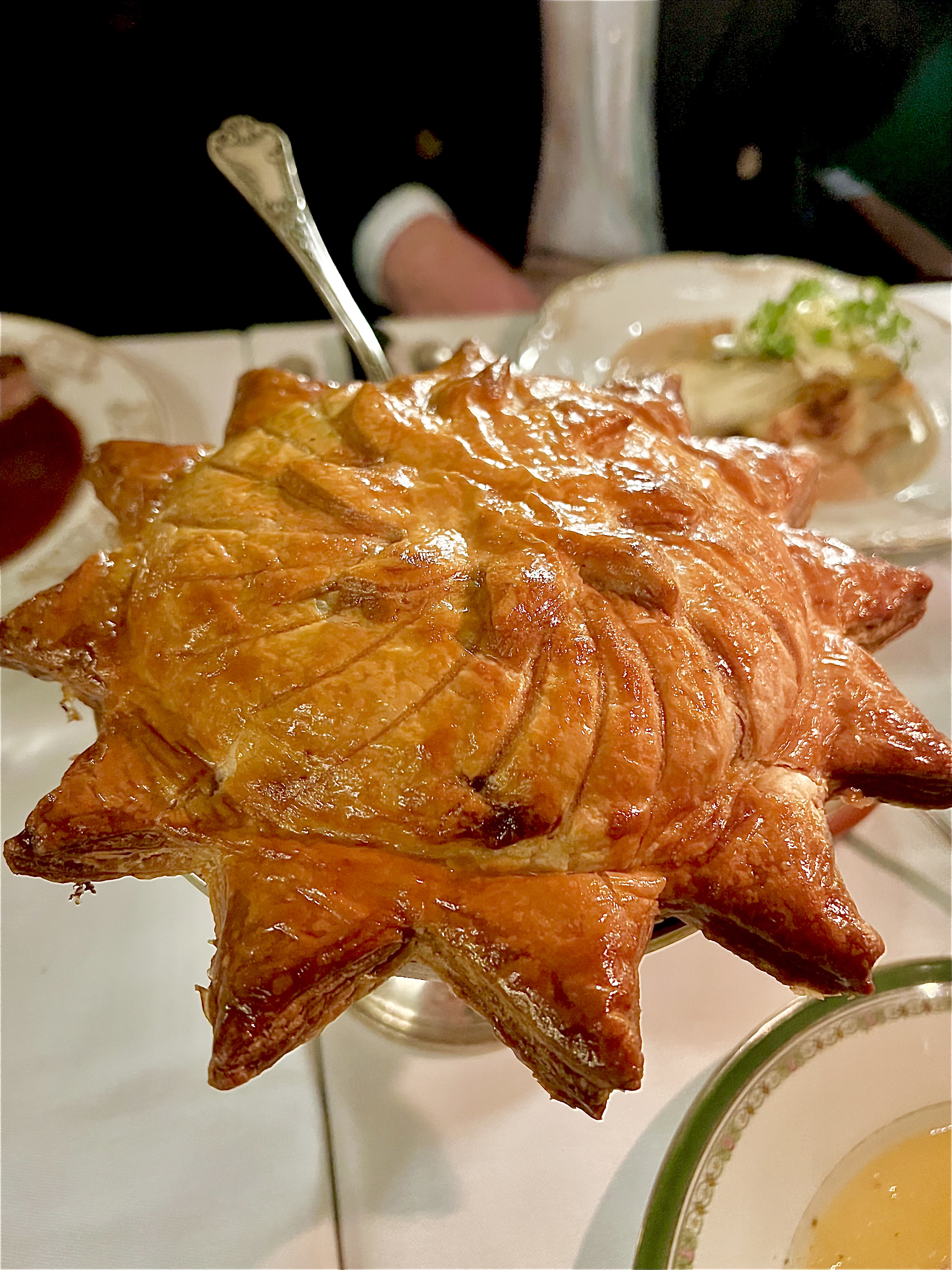 La Tourte au poulet sauce truffée est, déjà au visuel, d’une gourmandise absolue, en forme éclatante d’un soleil, de son luisant feuilletage qui donne cette irrépressible envie de découvrir son antre, son secret gardé et d’entendre son chant feuilletant à la découpe. Tous les sens sont en fébrile effervescence de découvrir cette rayonnante tourte. La première bouchée est un accomplissement absolu de tout, entre moelleux, crémeux, telle une indéniable blanquette de veau, ici au poulet, où tout est là pour le plaisir des sens. Chaque bouchée touche l’extase absolue renforcée de la sauce en émulsion de truffe : le nirvana gustatif n’est pas loin.