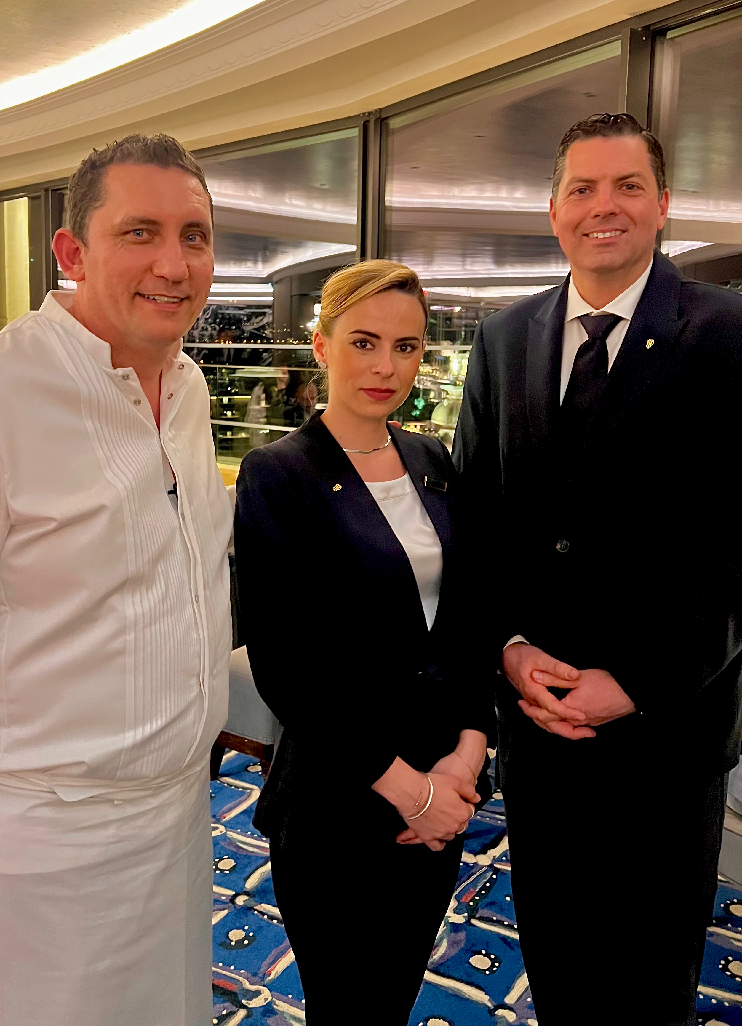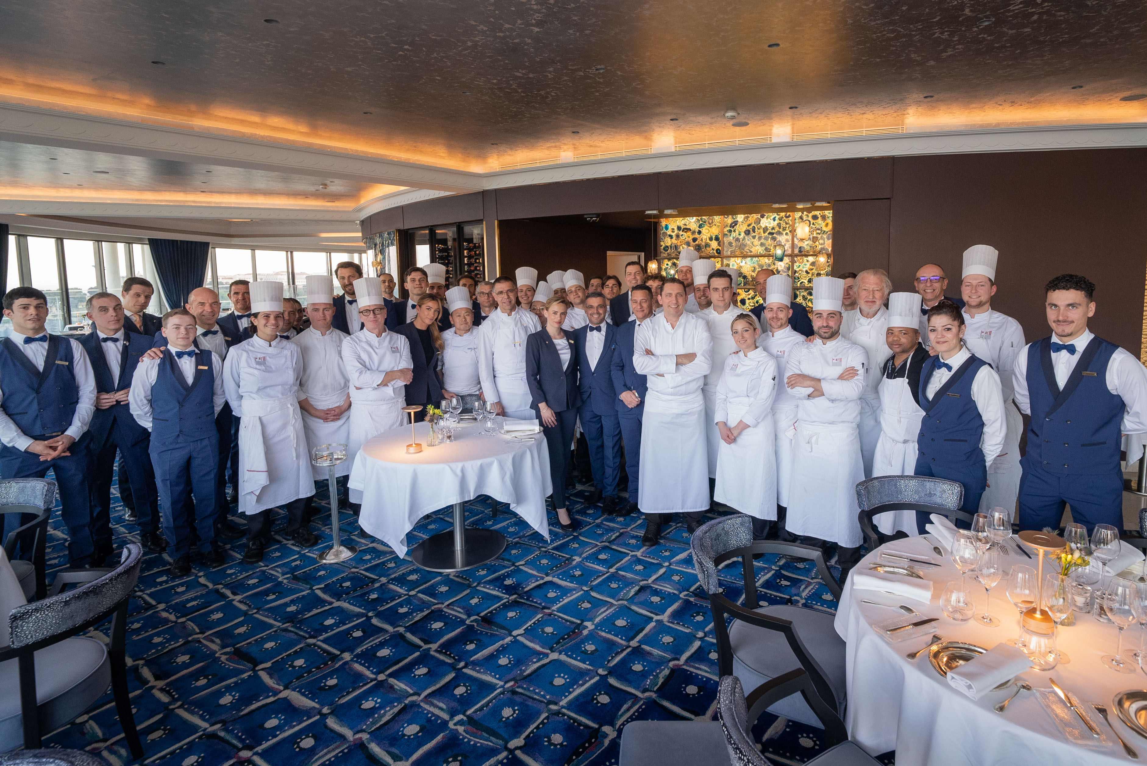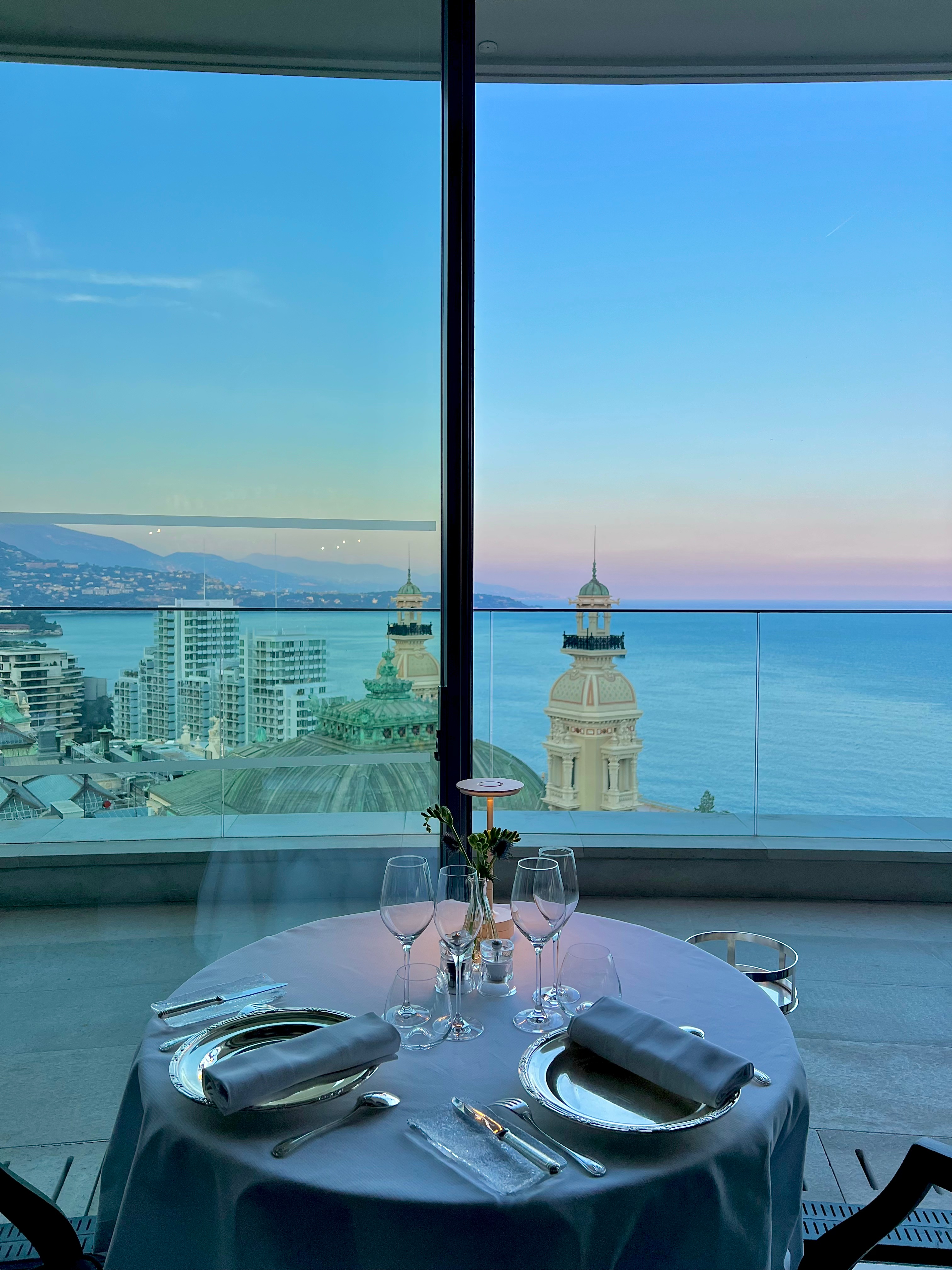 L’arrivée au 8ème ciel de l‘Hôtel de Paris est toujours un moment époustouflant, de cette vue azur d’une Méditerranée à l’infini et du Casino si proche qui vous donne une folle envie de toucher ses mythiques clochetons à bout de bras. Les tables le long de la baie vitrée en rotonde sont assurément spectaculaires et les cuisines ouvertes vous permettent de vivre toute la virtuosité des chefs en action.