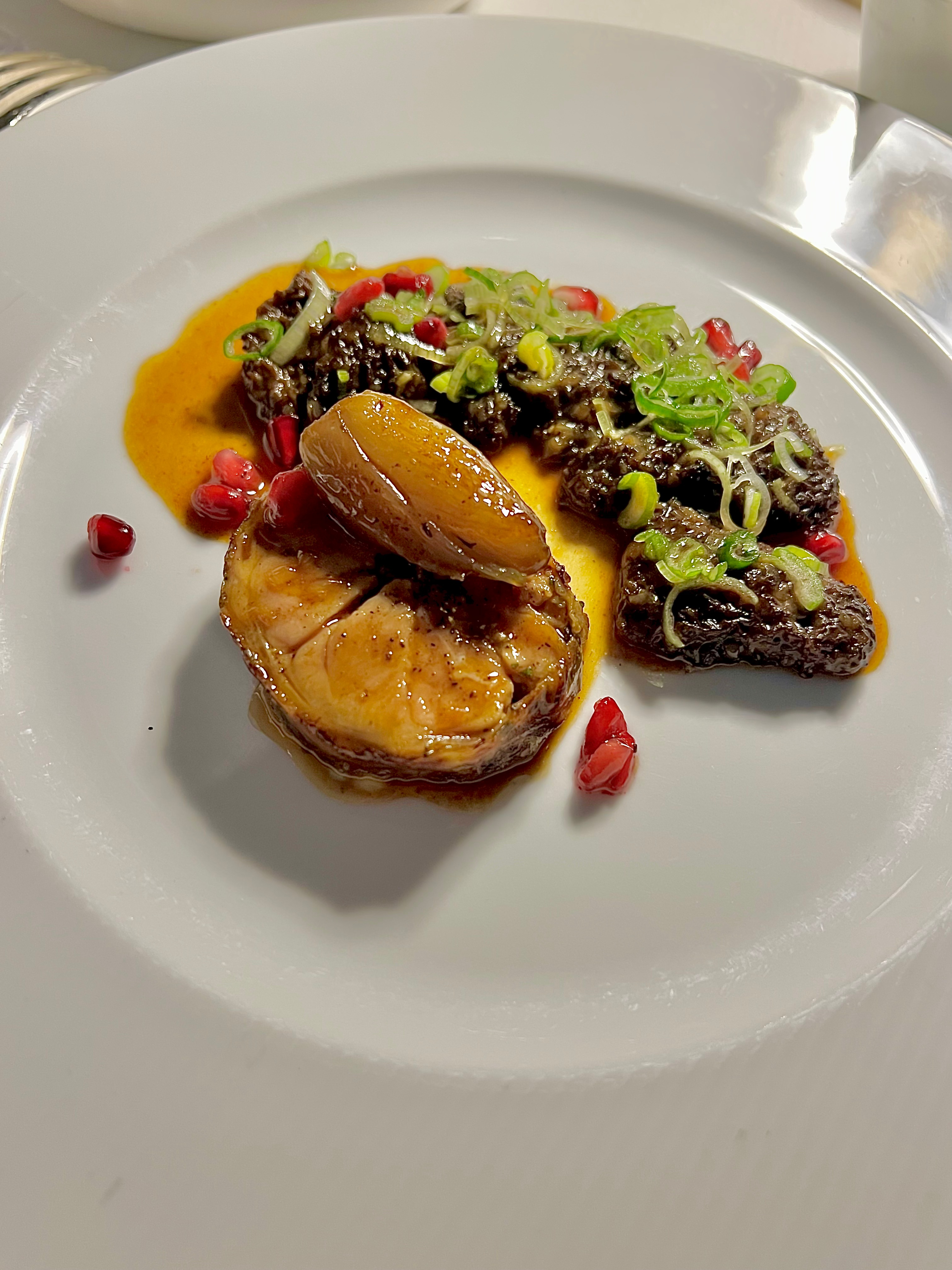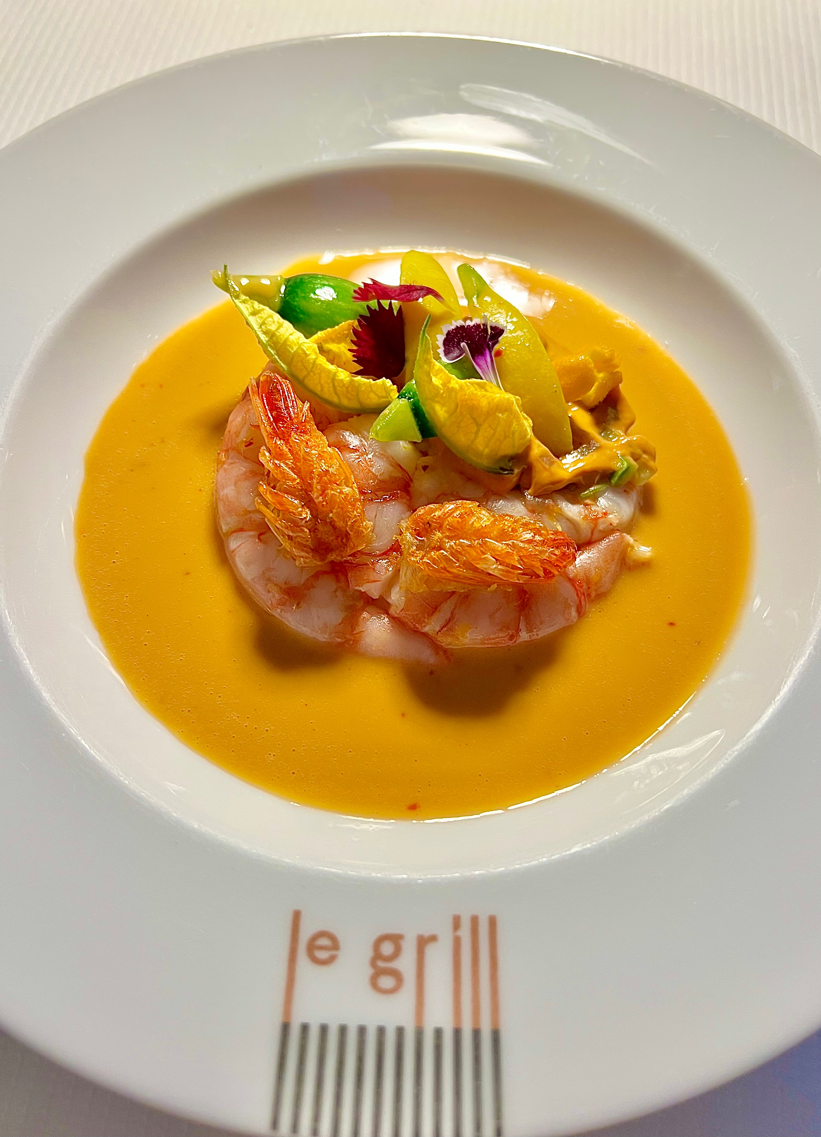 Pour suivre cette entrée, le chef a prouvé à nouveau son amour et son excellence pour la Riviera avec ces Gamberoni de San Remo juste marinés, primeurs, jus iodé. Second moment de grâce culinaire pour ces emblématiques crevettes à la mâche et à la saveur unique, pêchées à San Remo à quelques brasses de Monaco. Gardés intacte de vie, juste marinés, ils s’imprègnent d’un jus froid d’eux-mêmes à la saveur du cru. Les têtes finement ciselées et frites viennent cadencer la dégustation d’une céleste croustillance, et le corail des têtes travaillé en pommade se fait condiment exhausteur d’une puissance maîtrisée. Les mini-courgettes vertes et jaunes accompagnées de leurs pétales célèbrent le printemps et le soleil en croque de ce remarquable territoire. Une assiette à la fois délicate et prenante d’une suave longueur en bouche.