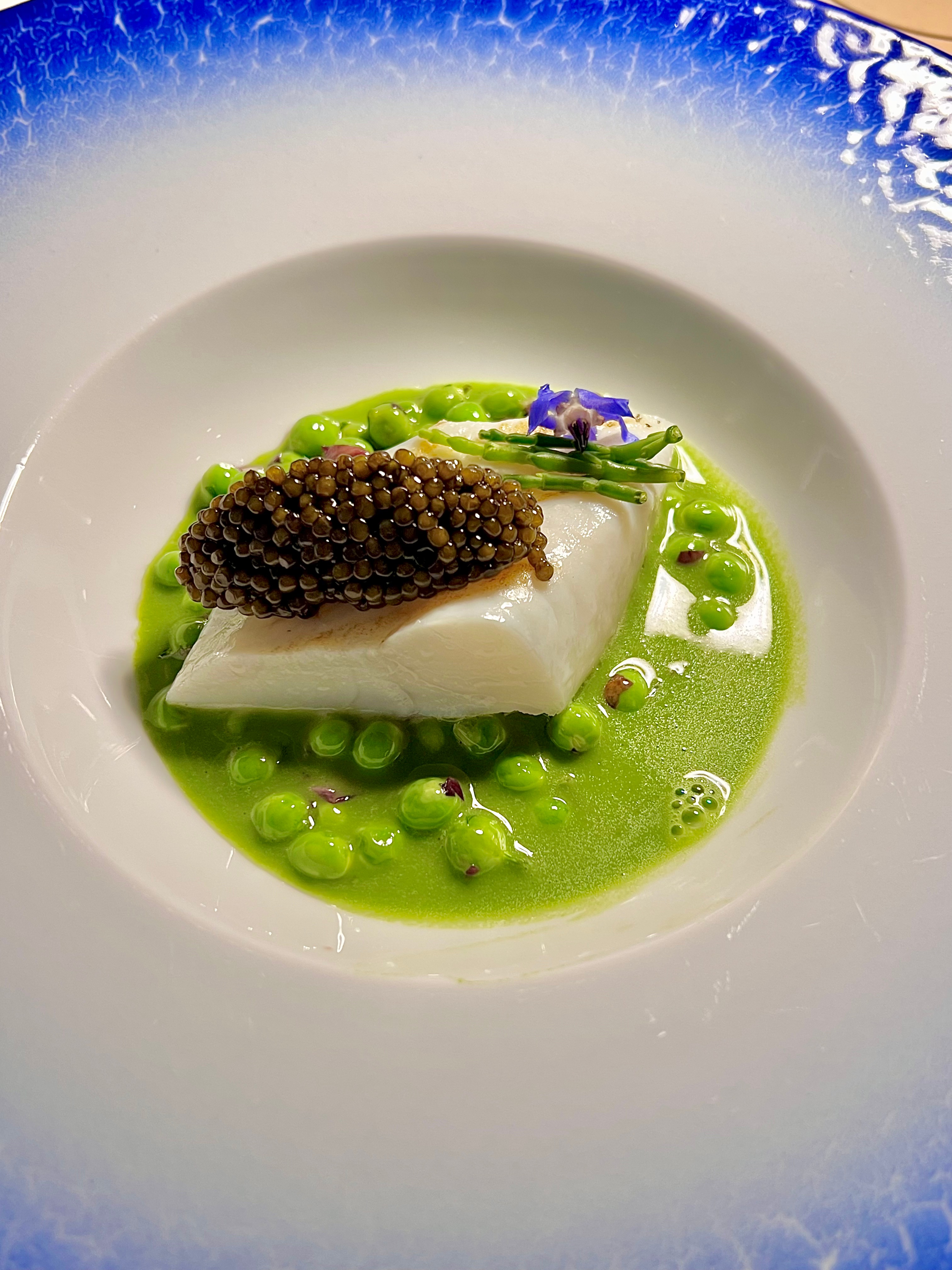 Saint-pierre côtier à la cheminée, petits pois, caviar et salades amères. Autre grand plat de ce dîner avec le Saint-pierre de Dominique Lory, véritable visionnaire des goûts, où tout est là dans une désarmante évidence de perfection. Ce noble poisson, grillé-marqué au feu de la cheminée en une sublime cuisson nacrée, s’escorte de la douce claquance printanière des petits pois vernissés de beurre. La salicorne est le croque-en-bouche salin, et le caviar délivrant ses notes iodées noisettées devient en toute simplicité un remarquable assaisonnement. Le jus de petits pois centrifugé et monté comme un beurre blanc est le ruban en gourmandise avouée de tous les éléments. Une assiette vibrante et saisissante de bonheur.