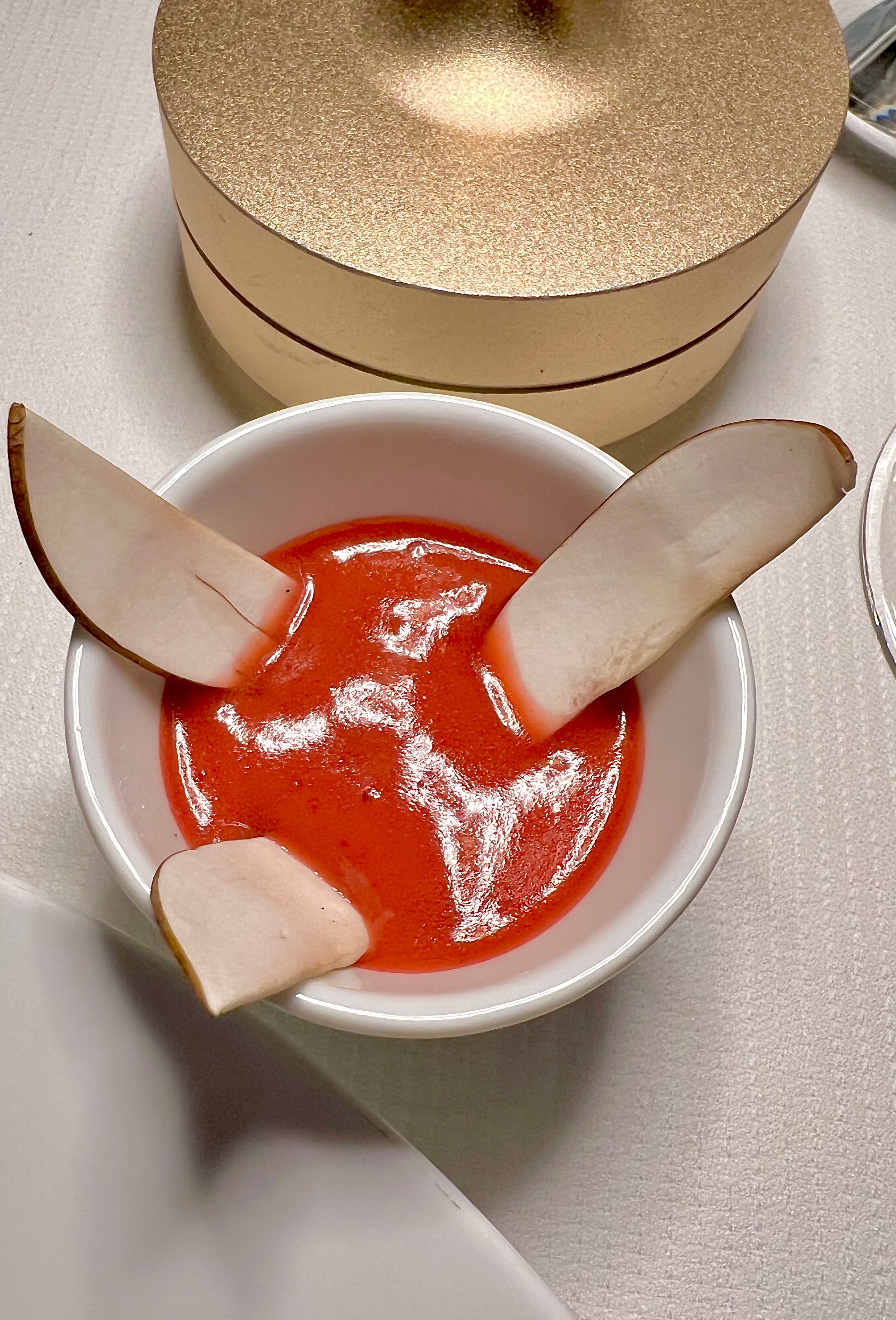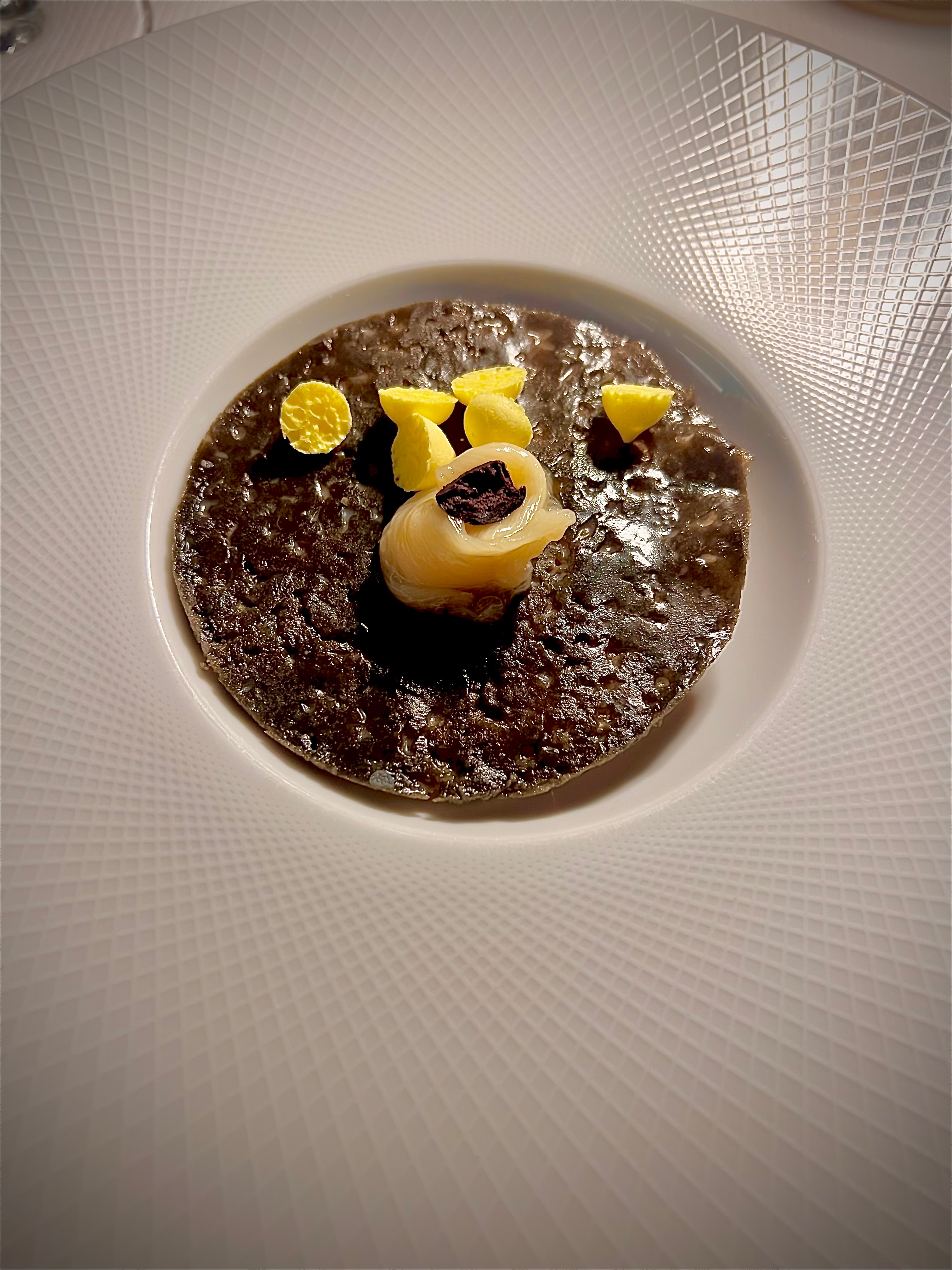 Pour les desserts, la Sévillane – Fraises des bois et poivrons rouges confits, crème prise rhubarbe, olives noires : que dire de ce dessert qui est assurément un moment suspendu dans le monde du chef Gagnaire. Une fois la tuile d’olives noires cassée qui donne de sa croustille corsée de l’olive noire, vous découvrez une douce crème de citron taquinée de morceaux de poivrons rouges confits, la rhubarbe se fait acidulée du bien et les mini-meringues se font bonbons ultra-aériens. Dessert déstabilisant, déroutant, mais tellement aimant et accompagnant à la fois. Une radicalité des associations de goûts à laquelle le palais a rarement été confronté, d’une telle maîtrise, que, dès la surprise passée, le mental gourmand délivre sa dopamine et vous demande d’y retourner au plus vite.