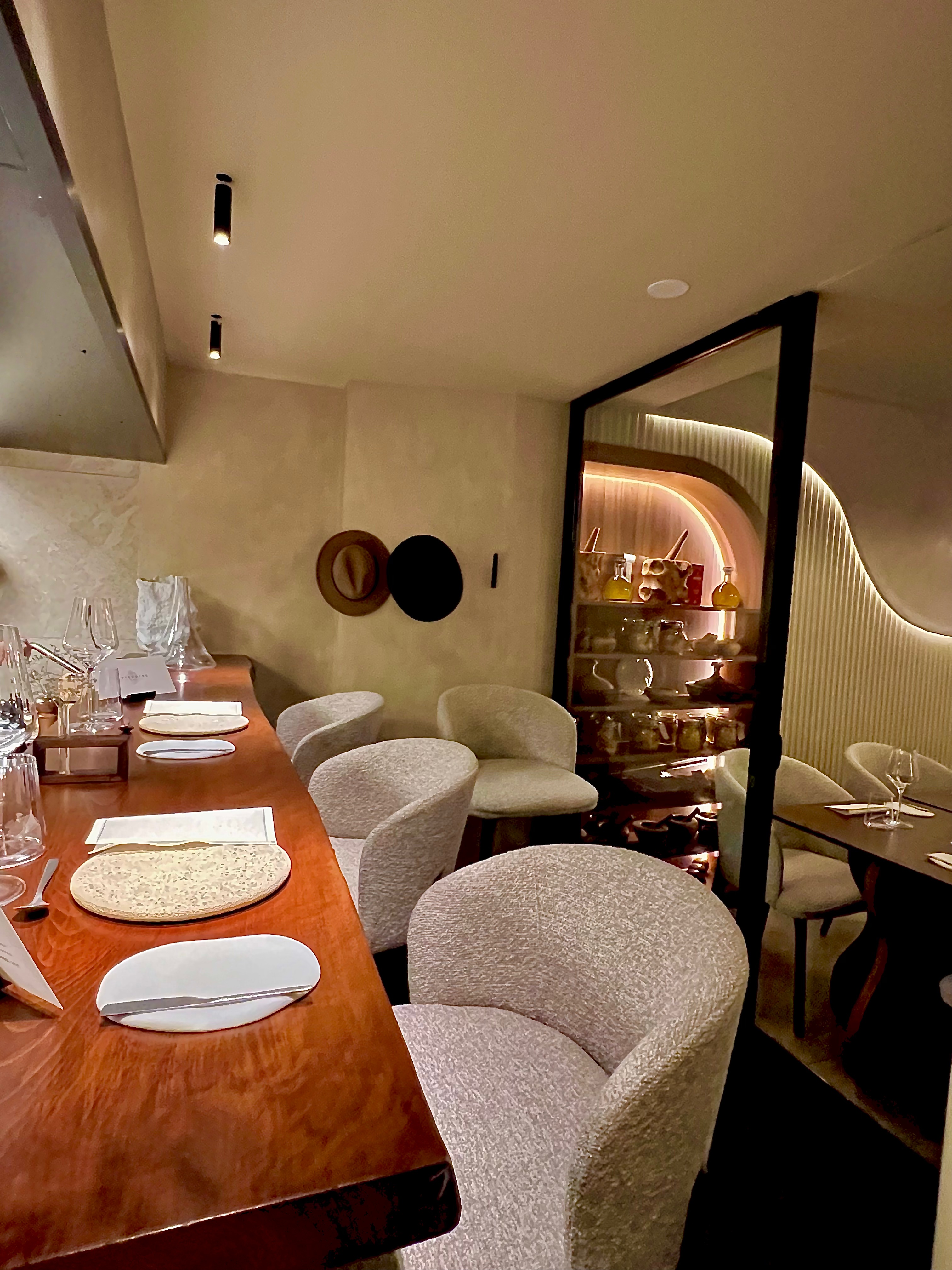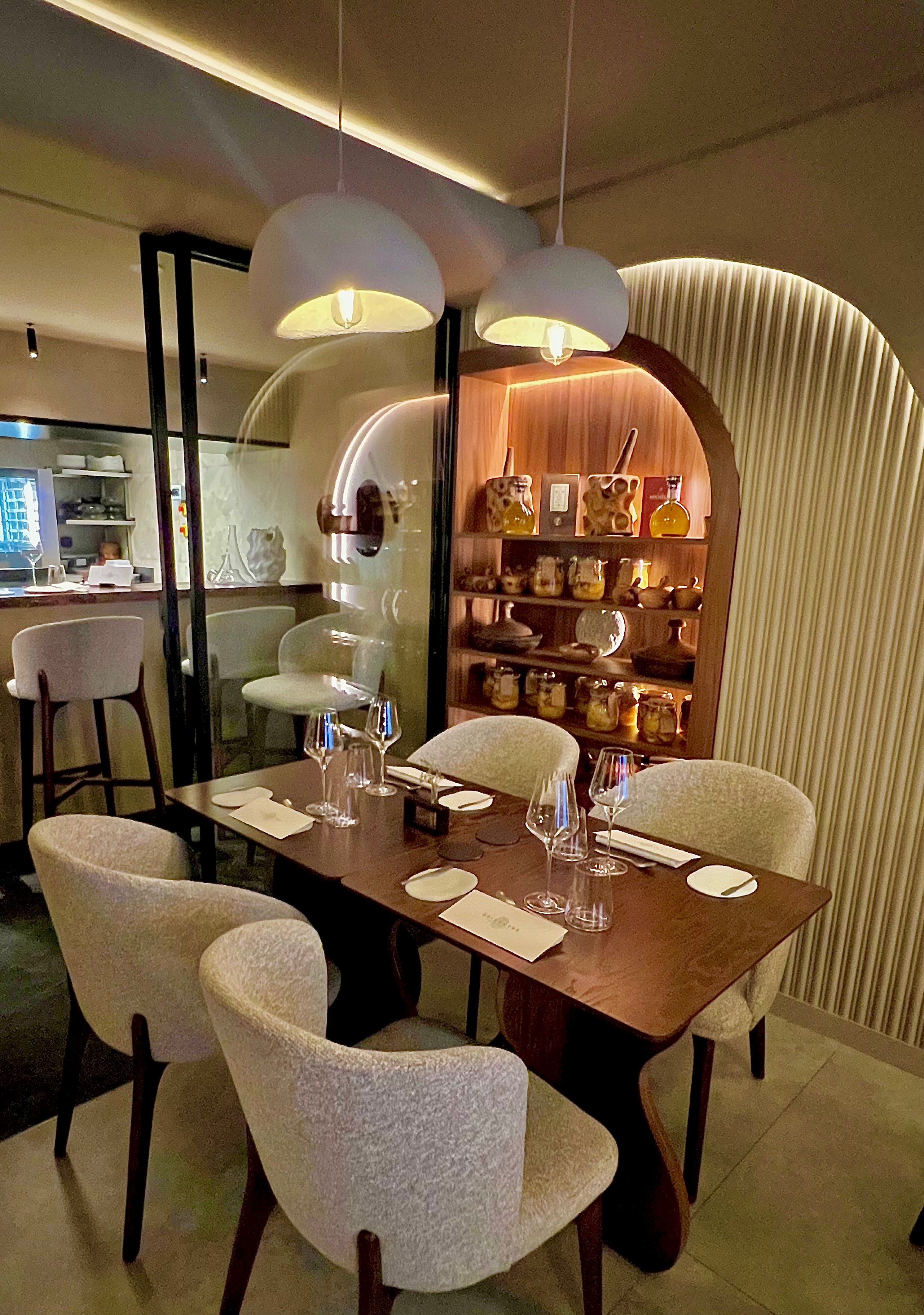 C’est le 27 février dernier qu’Épicentre ouvre ses portes. Pensé et souhaité comme un écrin ouaté, tout a été fait pour créer une atmosphère unique et immersive. La décoration est racée, organique et touche les sens : les courbes des murs, à l’allure presque troglodyte-chic, les matières, comme la chaux et le bois, la lumière diffuse et tamisée, délivrent cette sensation charnelle et sensuelle. La cuisine ouverte s’offre en spectacle de toute sa valeur. Sélim aime partager, raconter sa passion et invite ses hôtes à venir vivre ou goûter ses créations en direct, au cœur de l’action.