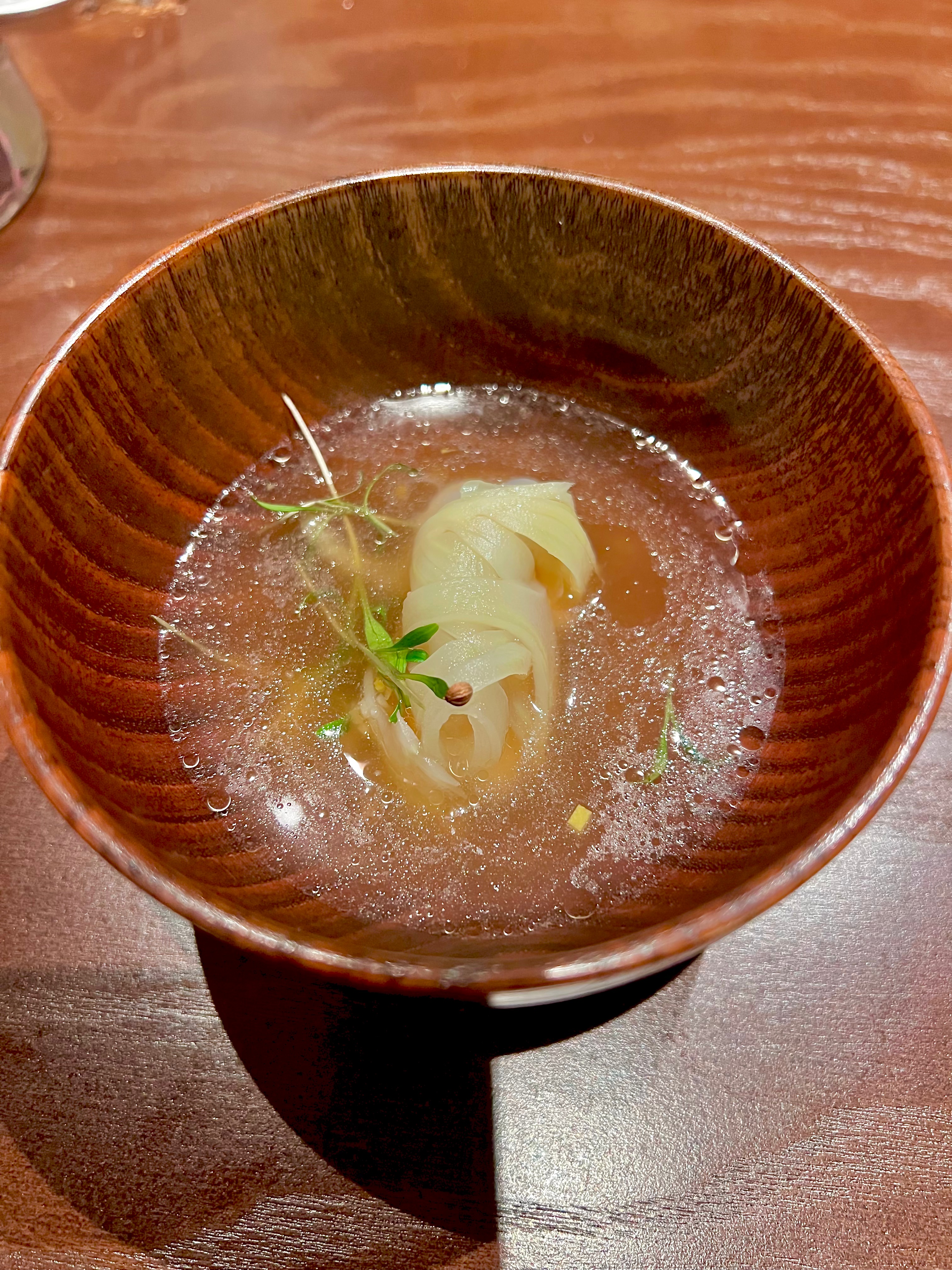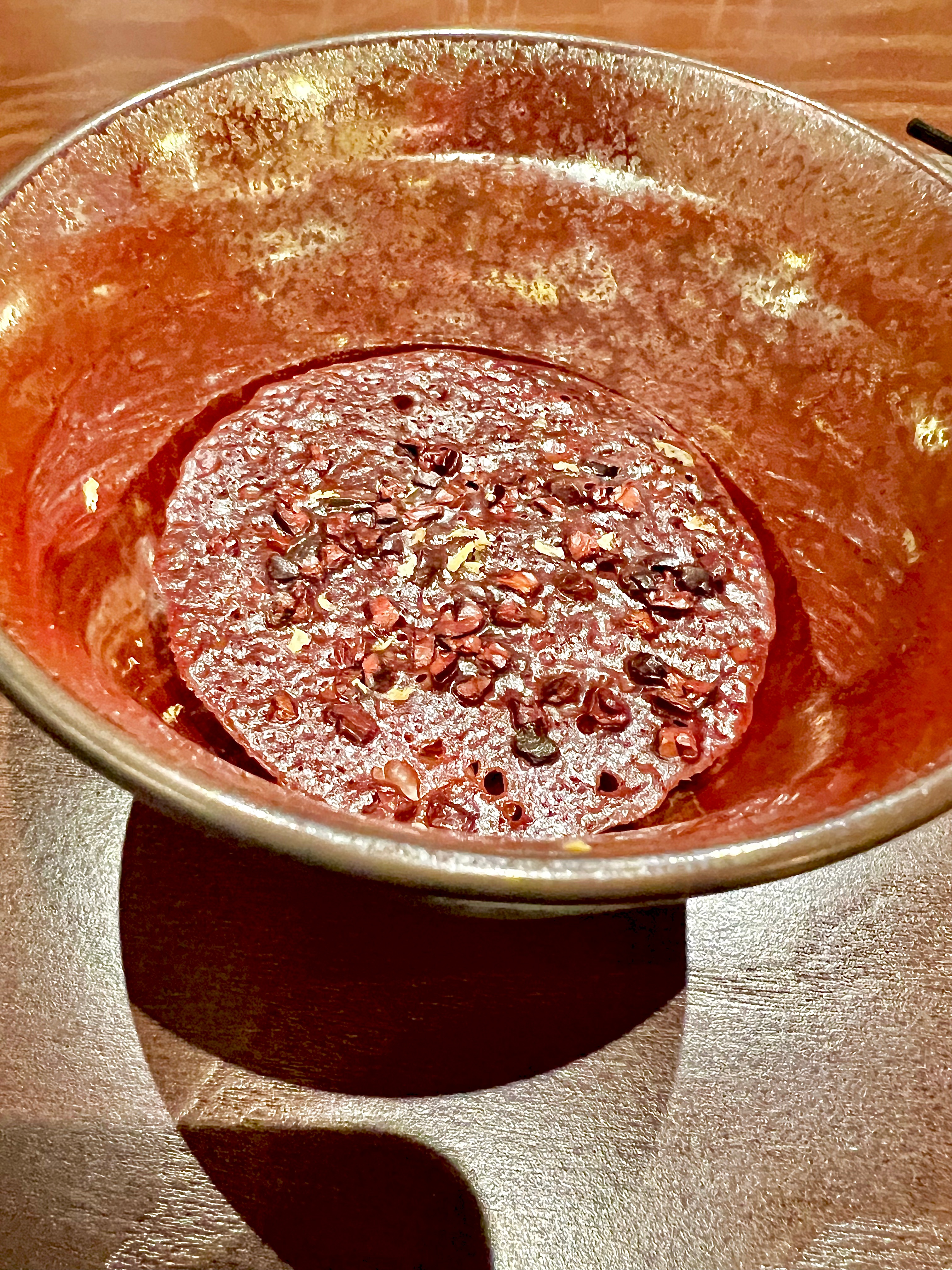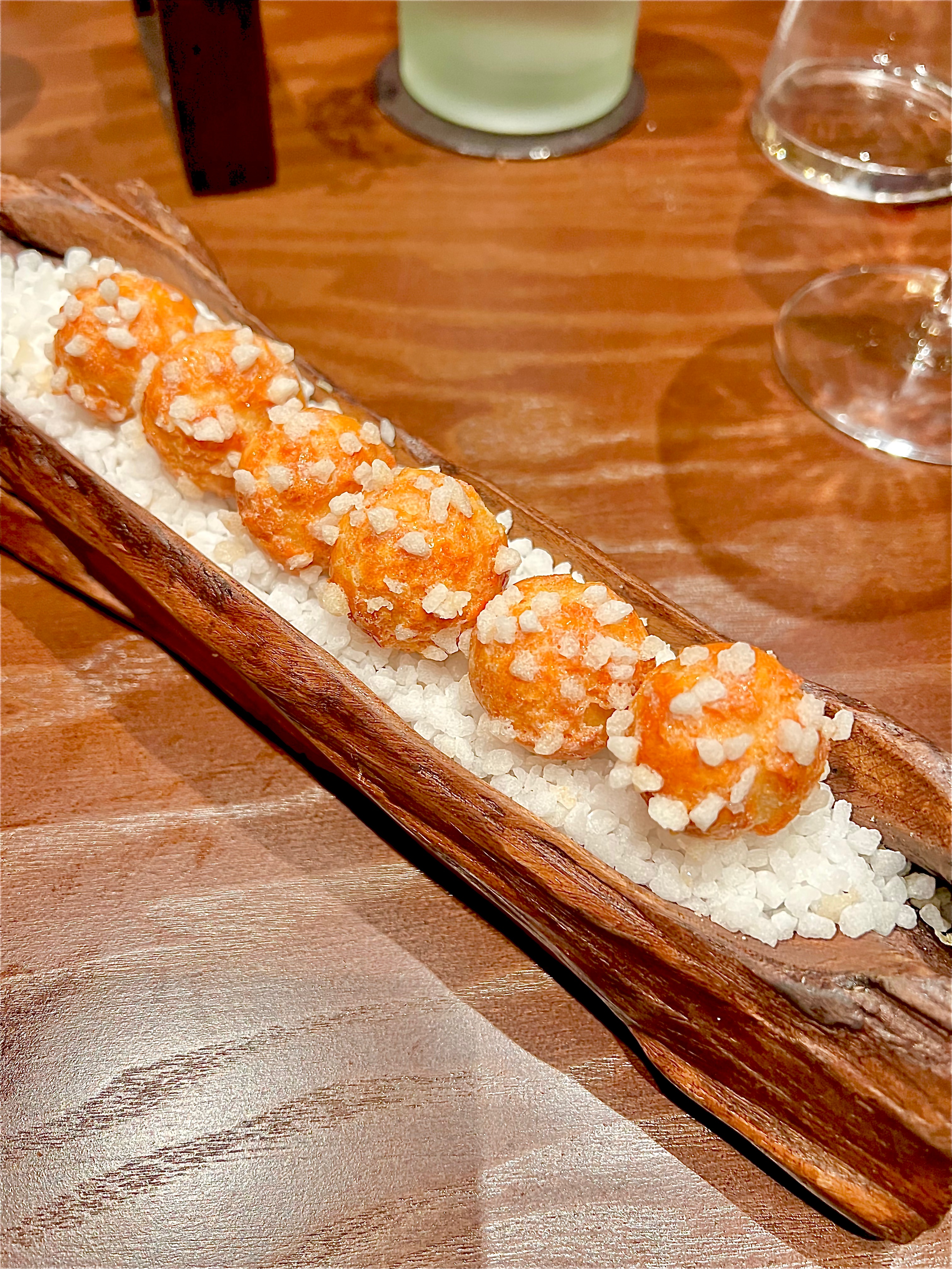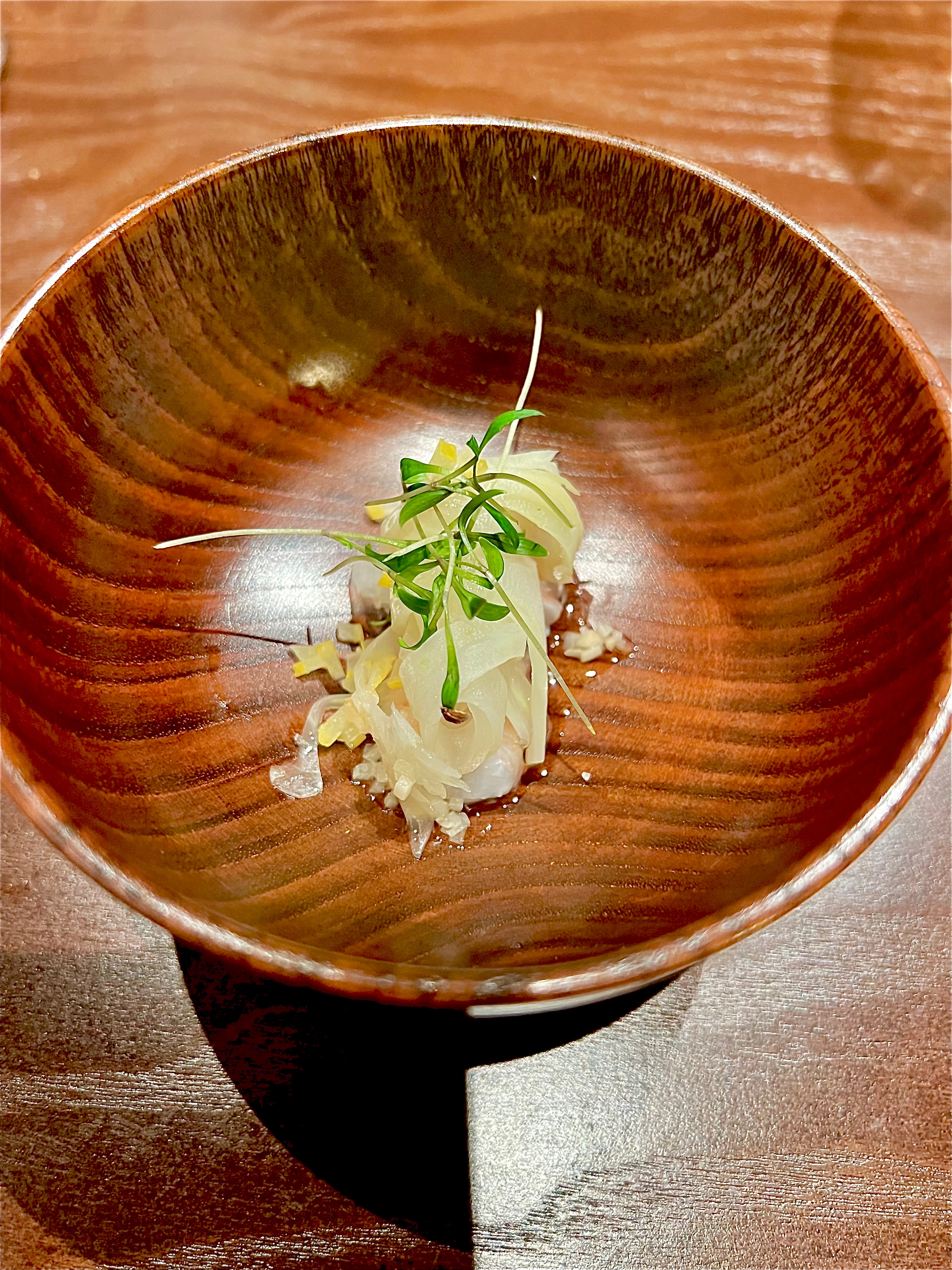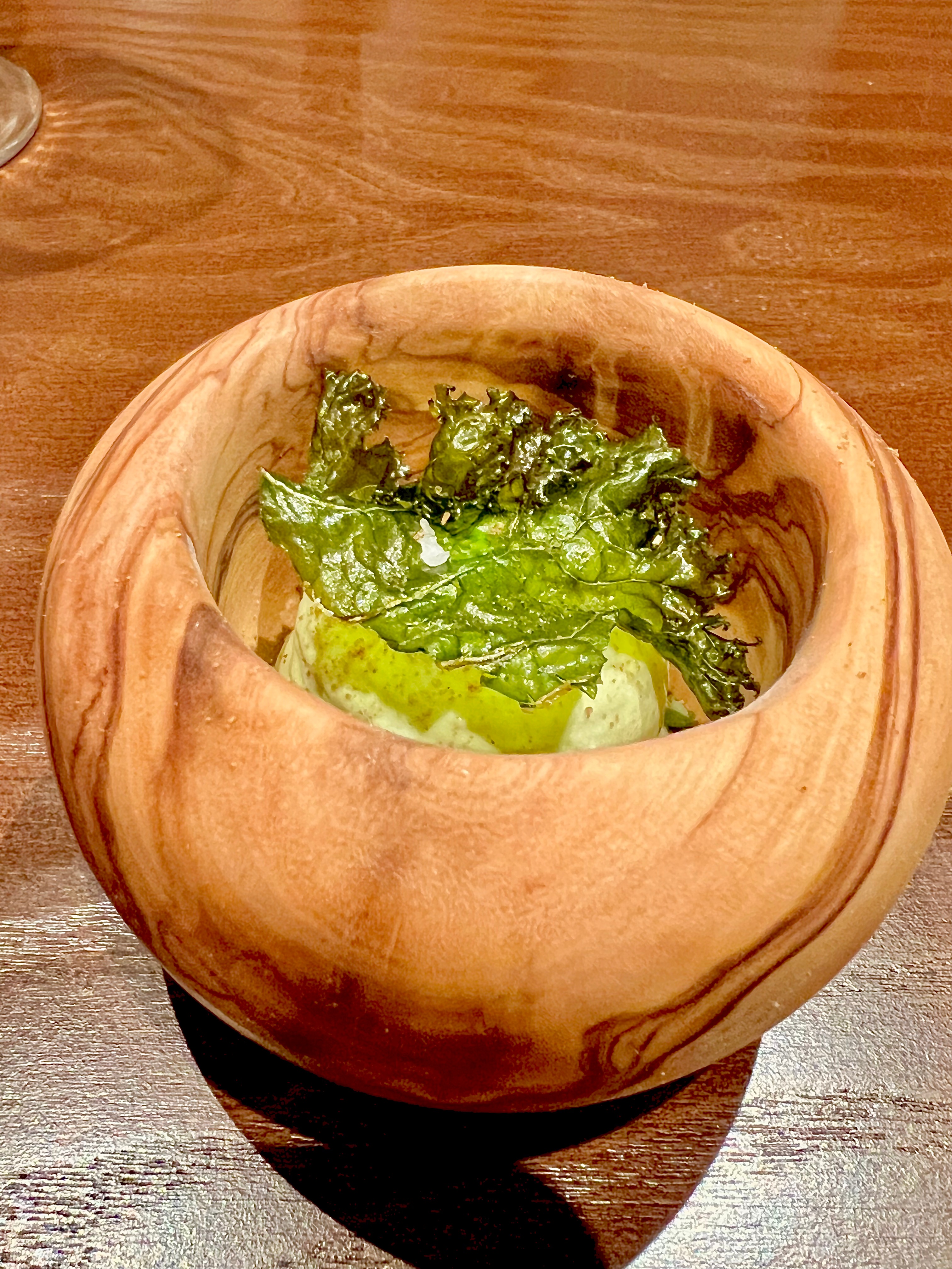 En pré-entrée, le petit bol à la douceur lisse du bois d’olivier cache en son cœur une ventrèche de mulet de ligne travaillée comme une suave brandade montée à l’algue confite et à la bergamote. Le nuage de brocolis en velours apporte toute sa verve légumière à ce monde terriblement marin. Les Baies de Sancho (poivre-agrume rare du Japon qui se récolte au sud de Kōbé dans la préfecture de Wakayama) viennent kicker en accompagnante harmonie de leur vision citronnelle et mentholée ce cérémonial bol. Les algues frites terminent à propos la dégustation d’une touche crispy saline.