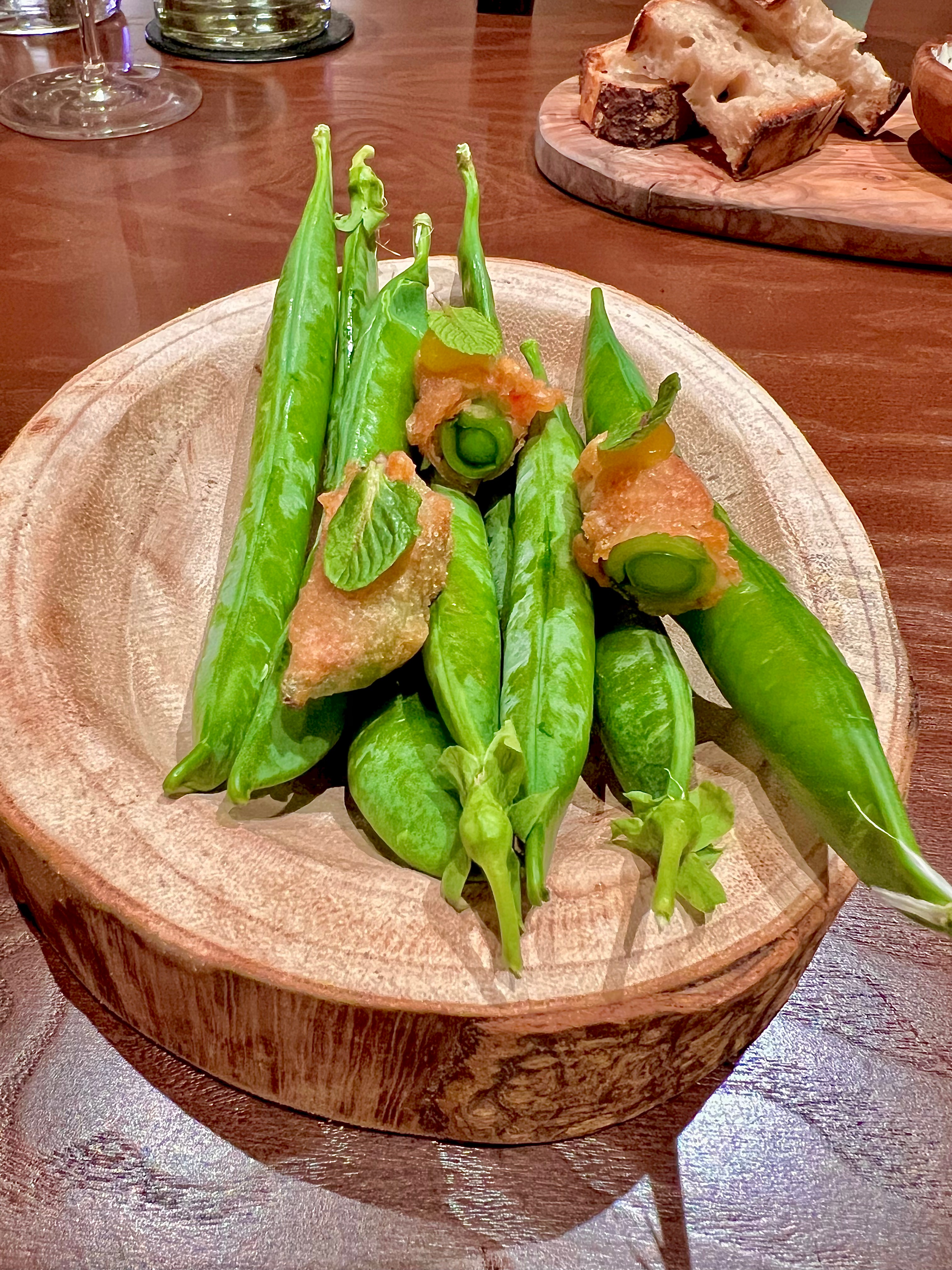 Petits pois en deux services : on croque de vie le printemps des petits pois en deux façons. Tout d’abord, la matrice, la cosse, est pétrifiée à cru en un rural tempura qui se condimente de l’asiatique kalamansi à la typicité pamplemousse-kumquat. Les feuilles de menthe sur le dessus ne sont pas sans rappeler le britannique combi : petits-pois-menthe.