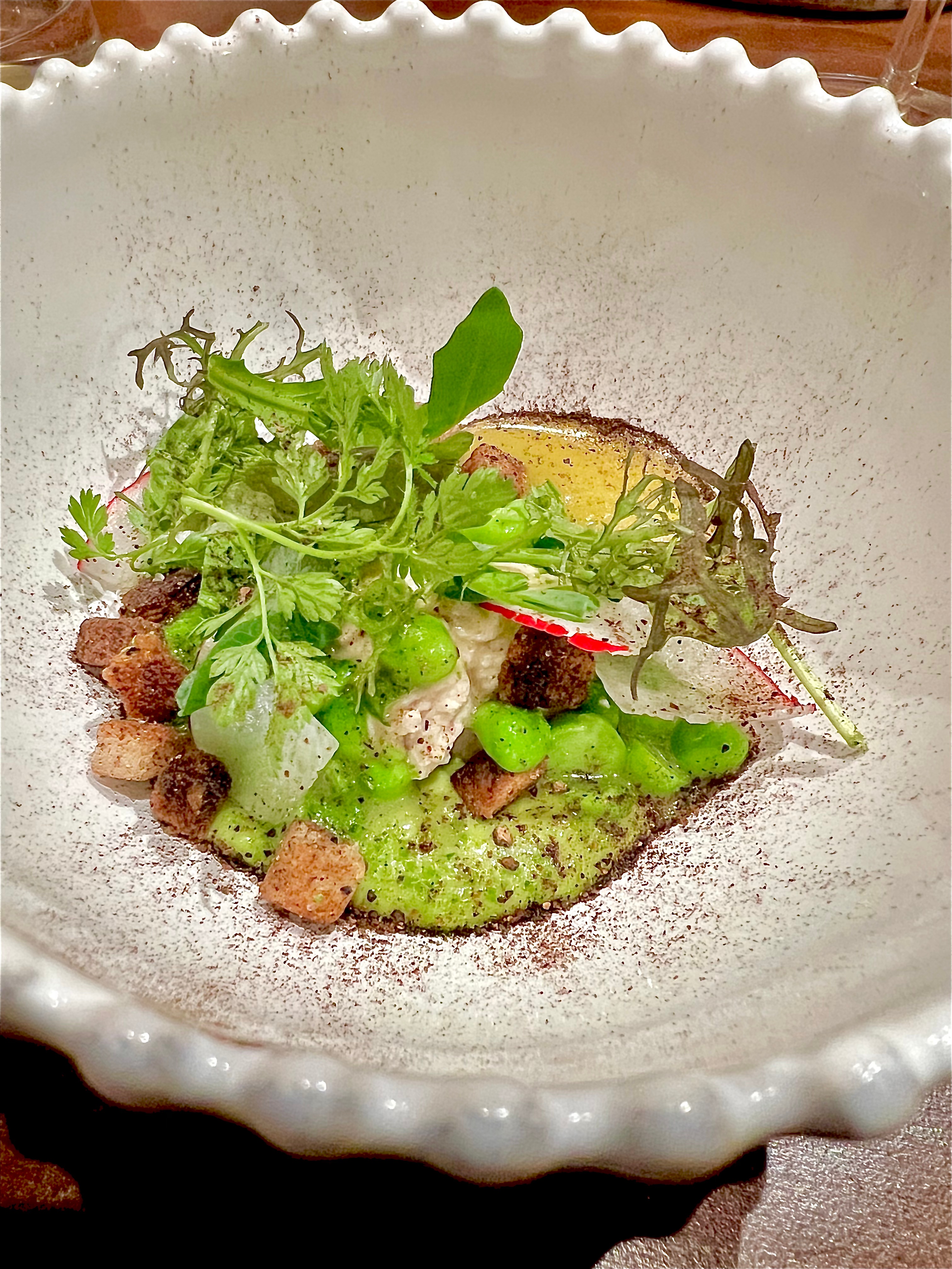Puis, en second service, le produit se fait toujours autant identitaire de ce petit pois travaillé dans l’idée d’une complexe, croquante et laiteuse salade. La brousse de brebis s’assouplit de sa saveur caillée du citron noir d’Égypte broyé, emmanant ses volutes de thé noir et d’agrumes fermentés. La purée de petits pois en fond se fait crème lisse potagère, la vinaigrette au balsamique blanc et l’huile confite se montent au miel et au piment d’Espelette en une enveloppante pommade. Les croutons et les petits pois crus se font pertinents de texture.