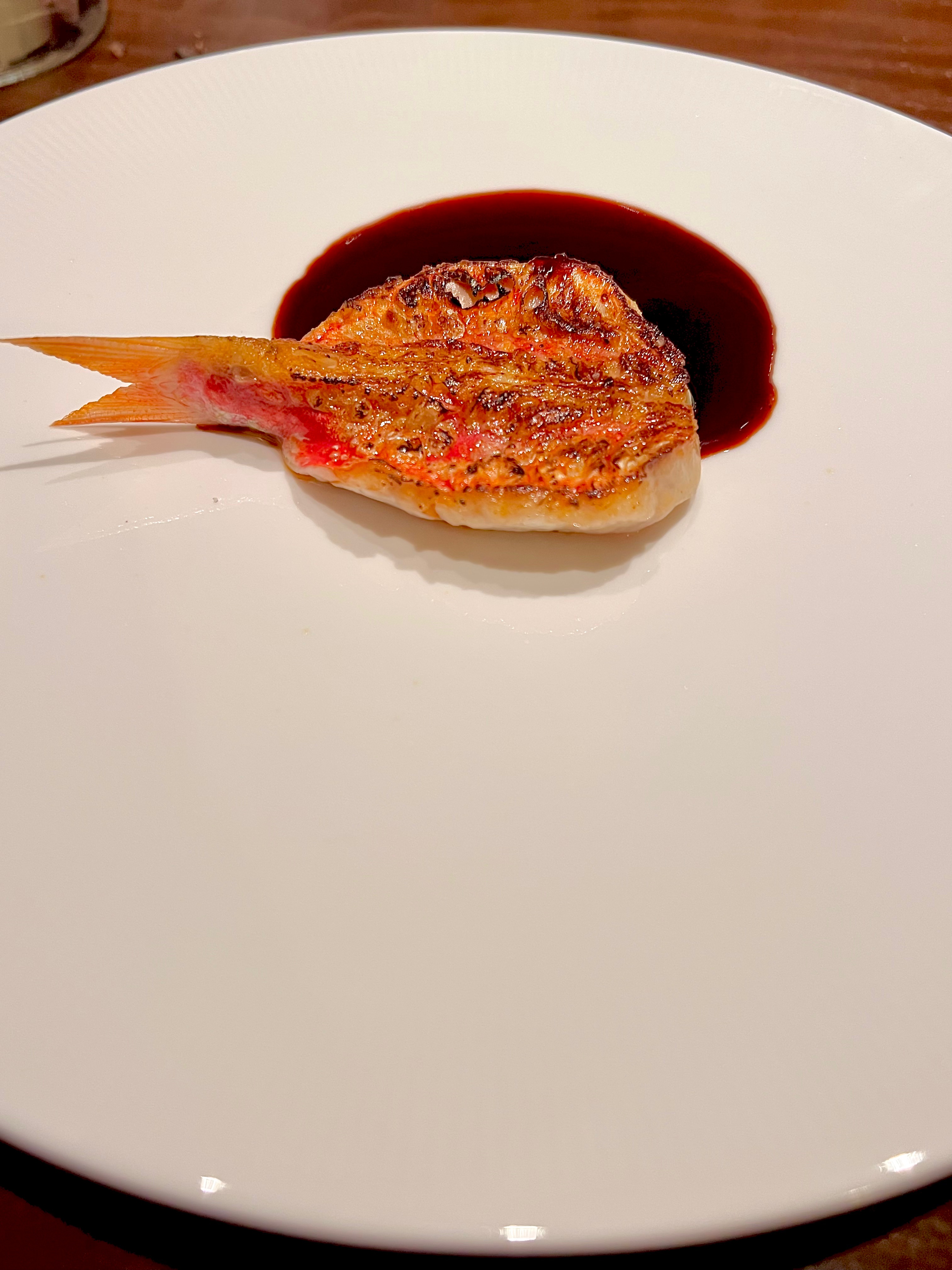 Le Rouget de roche juste grillé, matelote d’une Daube : cuisson instantanée de ce rouget raidi en perfection par la flamme, il s’acoquine en excellence et profondeur d’une puissante sauce miroir dans l’idée d’une matelote de Daube faite à base des arrêtes et des têtes. Tout est là, le genièvre vient justement souffler de sa rondeur résineuse et de sa verve poivrée herbacée.