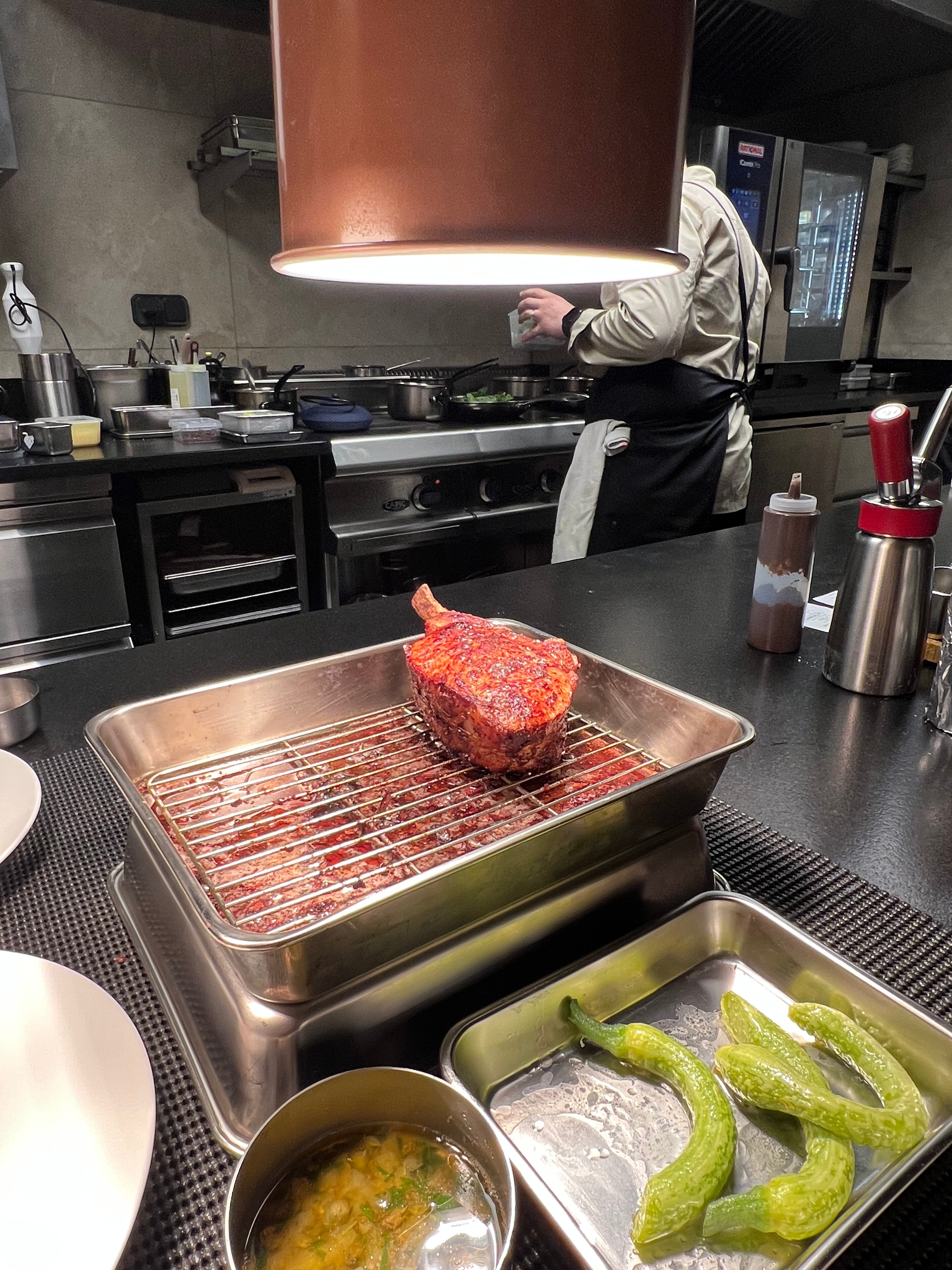 La Côte de Veau, cabosse de cacao se fait désirer de passion, sa préparation se fait spectacle. Peut-être serez-vous invité à venir dans l’antre du chef, à l’âtre de ses cuissons. Il vous explique sa passion, vous fait vivre cette côte qui chante et se nourrit du beurre dans la fumante poêle, les parfums vous titillent les narines comme rarement, avec simplicité enfantine, Sélim vous narre que la cuisine, c’est tout simple, un peu de ci, un peu de ça… Et voilà ! Le bonheur est là ! En même temps, il parsème en pluie, cette côte qui est bientôt la vôtre, de cette concassée de cabosses de cacao. Les assiettes se montent et se dressent avec agilité et simplicité des premières courgettes violon engourmandisées du beurre et du bouillon d’oignon ; quant aux épinards, ils tombent de joie du jus et des segments de citron. La viande s’est enfin posée et voilà le temps de la découpe affûtée de Maître Sélim, samouraï des cuisines, armé de son couteau japonais à l’allure d’un sabre. Vous aurez peut-être l’honneur de rogner l’os, comme à la maison, sans peur ni pudeur, mais avec fierté, vous arborerez à la main cet os tel un trophée. Vous voilà de retour à votre table et aux civilités. Vous savourez dans votre assiette cette fondante viande cacaotée d’une parfaite cuisson qui se lie de force d’un jus balancé qui fait mouche. Les légumes se font addictifs de délices.