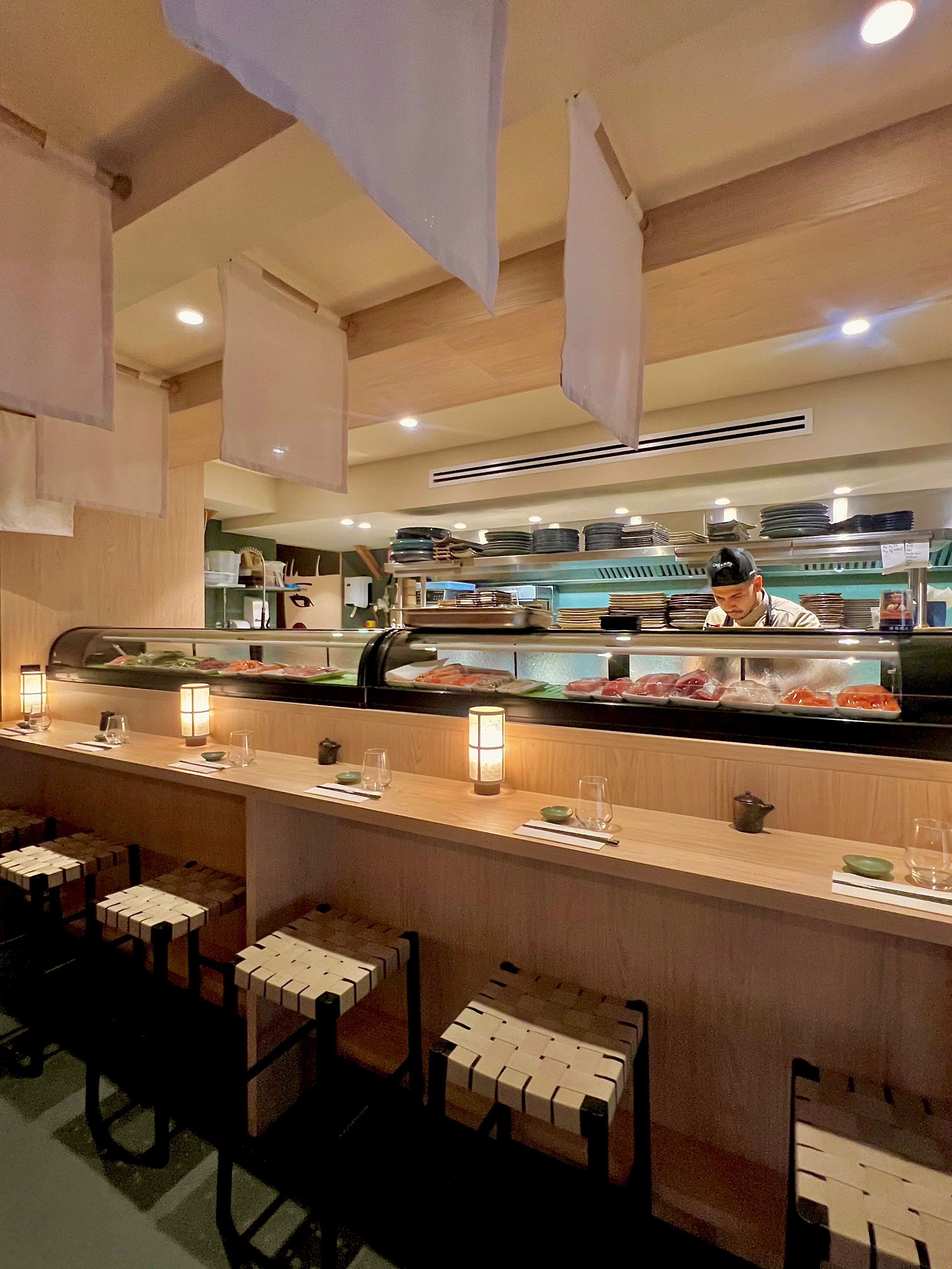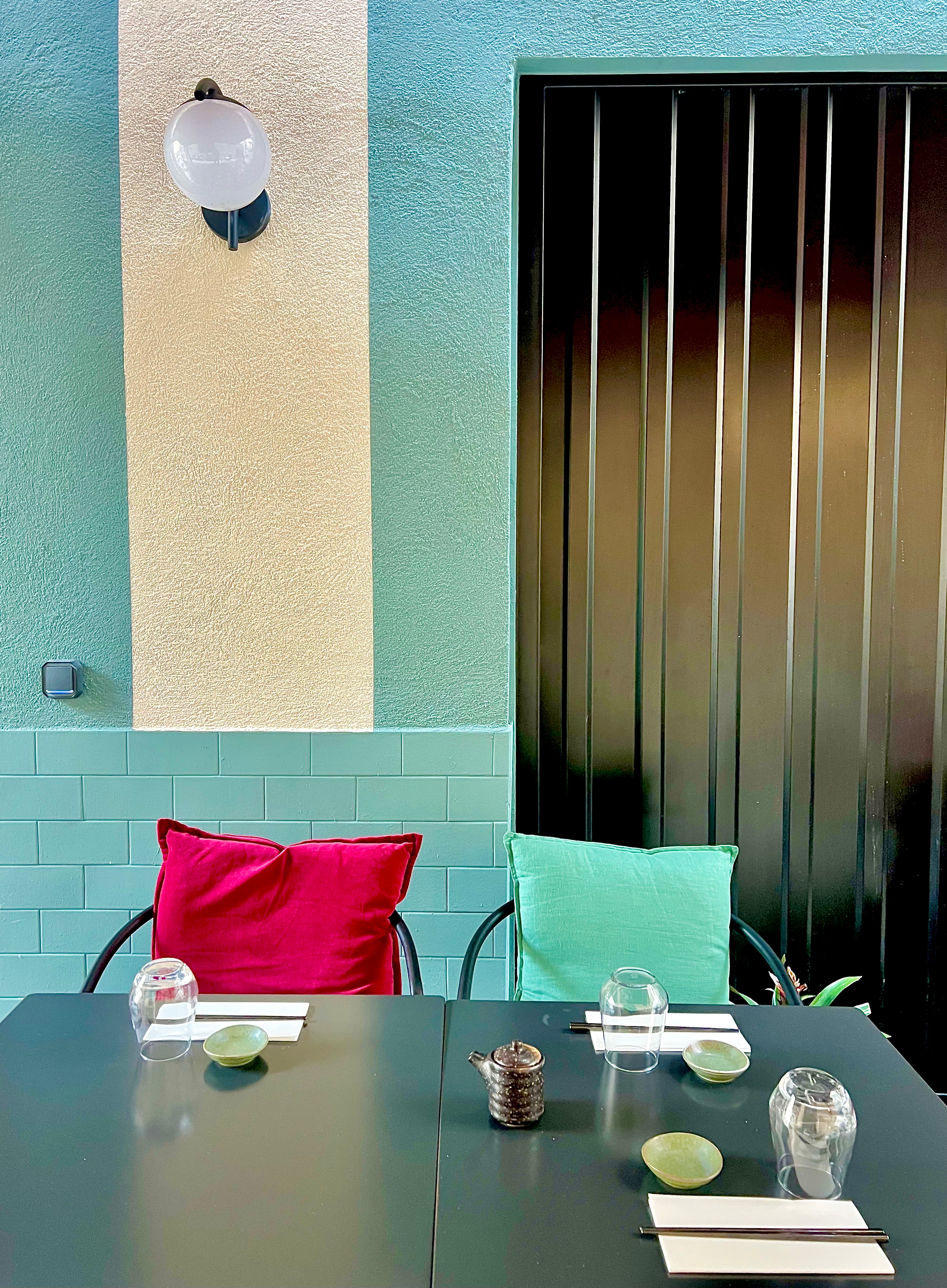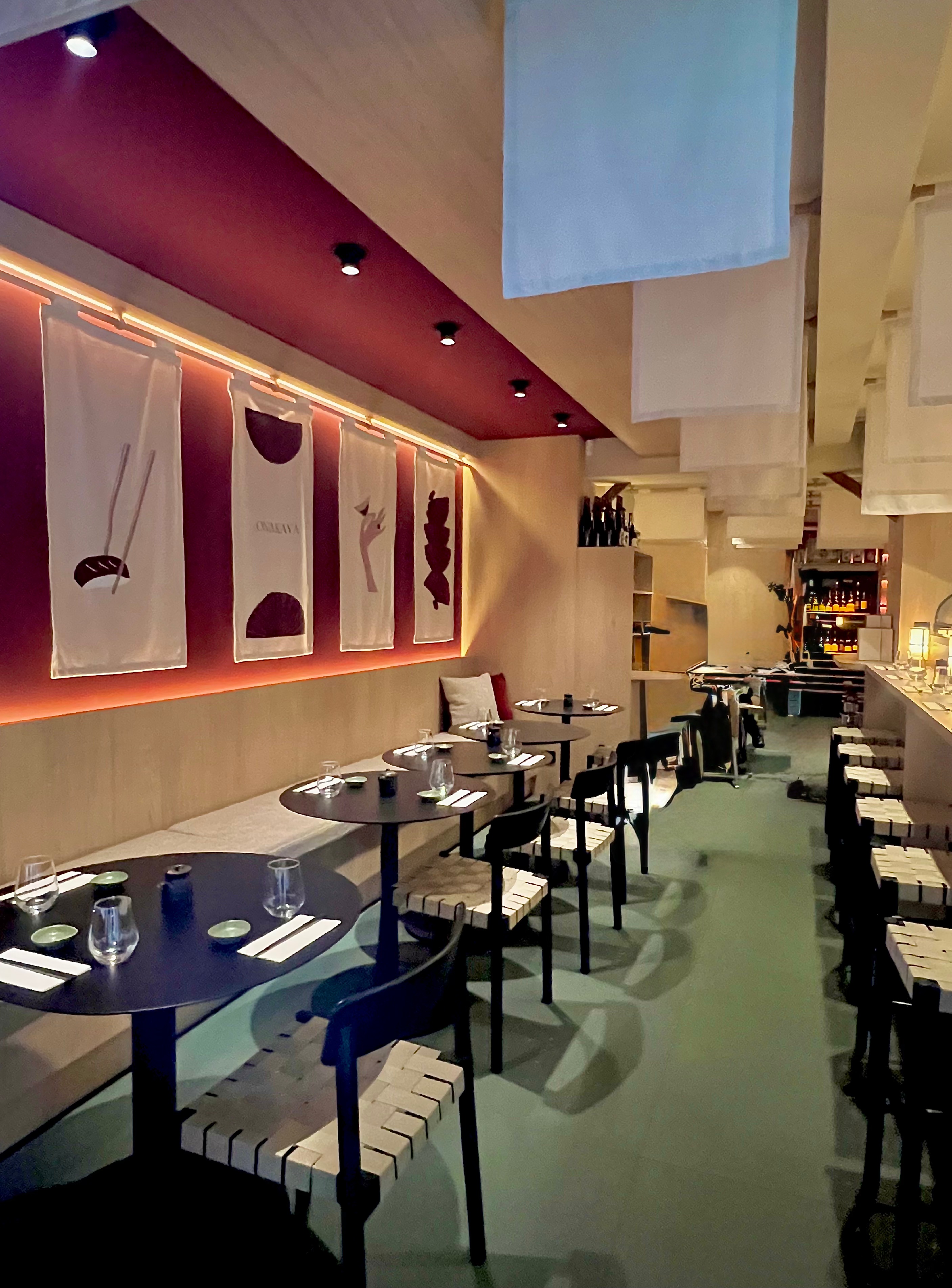 C’est Maison Maju, le cabinet d’architecture d’intérieur fondé par Julia Condro, qui a entièrement réinventé l’espace qui se fait désormais fluide et aéré aux différents lieux de vie : le comptoir pour vivre en direct l’effervescence de la cuisine et la précise découpe des poissons pour les inspirants nigiris, la salle pour des moments entre amis ou en famille, le bar pour assister à l’élaboration des cocktails, et la terrasse colorée dans cette impasse à l’abri de la rue, qui n’est pas sans rappeler ces étroites rues tokyoïtes vibrantes de gargotes en tout genre. La décoration est élégante et cossue où le bois blond délivre ses inspirations d’épure, charnelle et organique. Au plafond, les noren, ces petits rideaux qui vous souhaitent la bienvenue en tradition tout en chassant les mauvais esprits, cadencent la perspective. Les dessins au graphisme envoûtant et stylisé réalisés par Marion Butet qui se retrouvent sur les menus, les norens, les murs apportent une profondeur artistique à l’ensemble.
