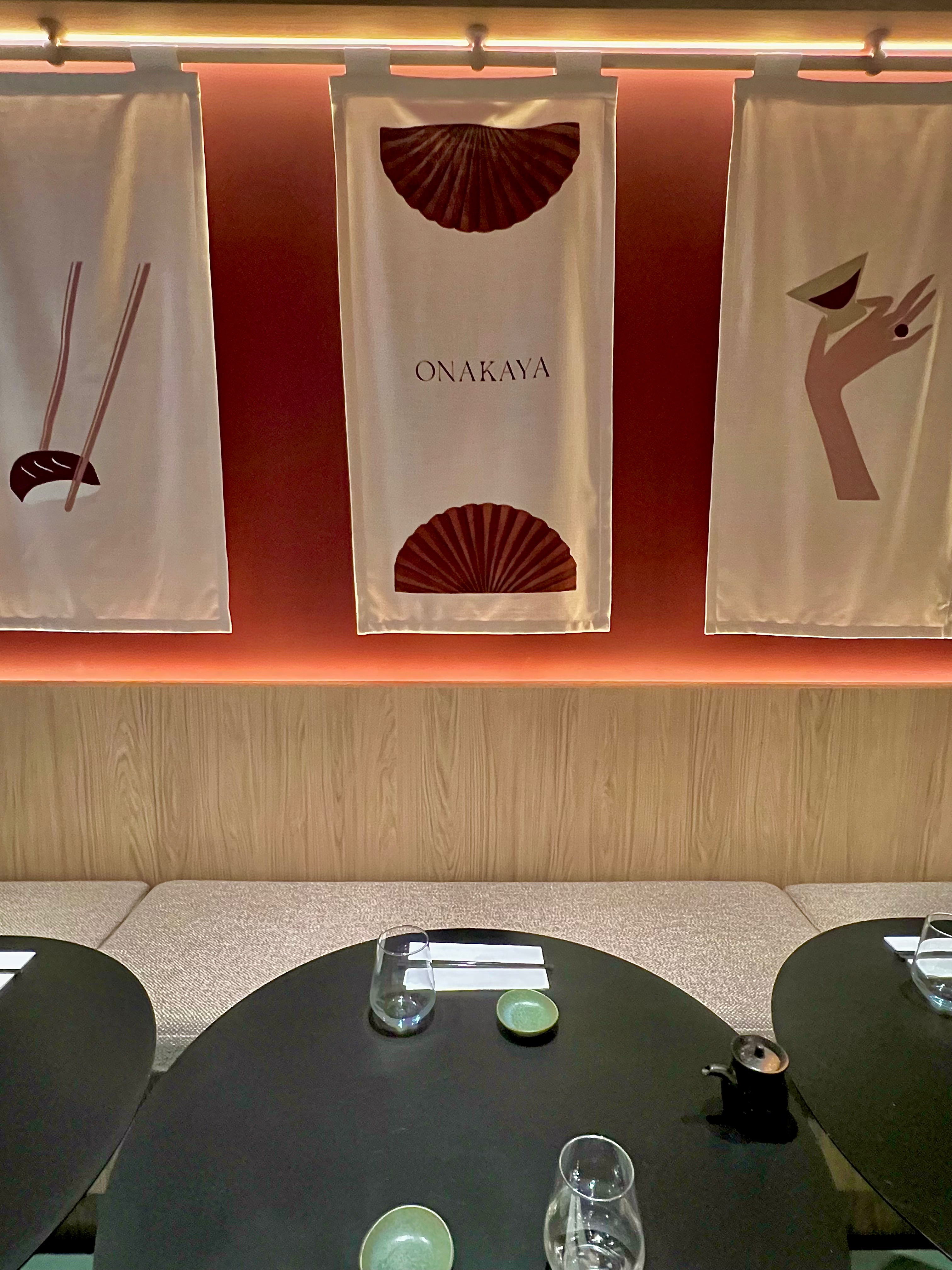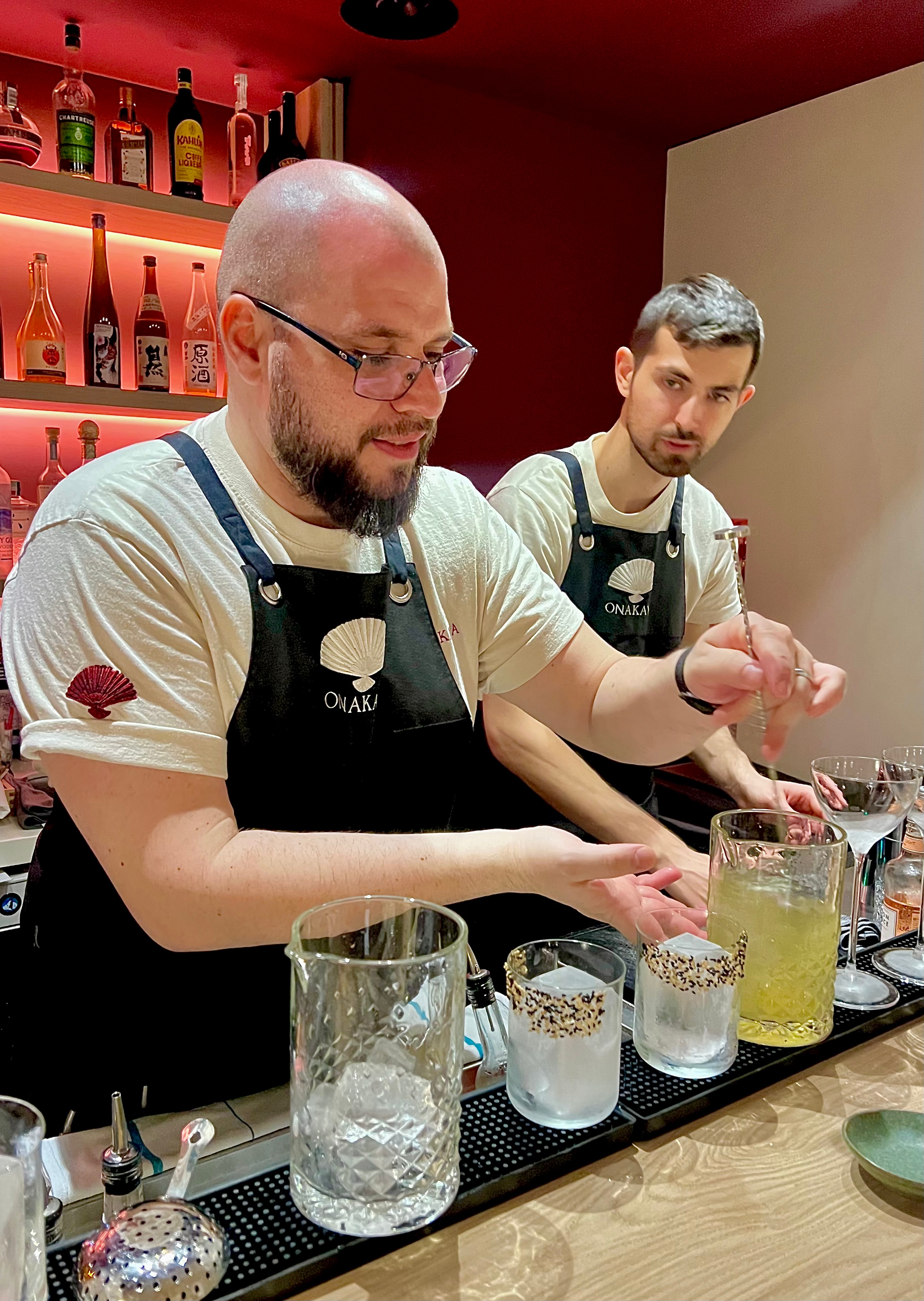 En effet, Alexis, dans son désir d’aller toujours plus loin dans l’authenticité, a souhaité créer dans ce même lieu deux entités : Onakaya et Onakase. Onakaya (contraction d’Onaka et d’Izakaya) est l’idée de ces bistrots populaires et enjoués que l’on trouve à Tokyo ou dans les grandes villes japonaises, où l’on vient pour se régaler, trinquer de bière, de shōchū ou de sakés, se réconforter et rigoler en toute convivialité de plats de partage. Véritable lieu d’échange et de socialisation des salaryman サラリーマン, le Nomikai 飲み会 (littéralement réunion pour boire) est le moment de détente de ces employés de bureaux dans les Izakayas avant de rentrer dans leur foyer. C’est dans cette idée d’échange, de partage et de convivialité qu’Onakaya a été pensé, mais dans une version gourmande, raffinée et bien ficelée de plats pimpants d’umami et de sushis justement ciselés, le tout accompagné de cocktails aux saveurs nippones, ainsi que d’une vaste sélection de sakés pointus et identitaires.
