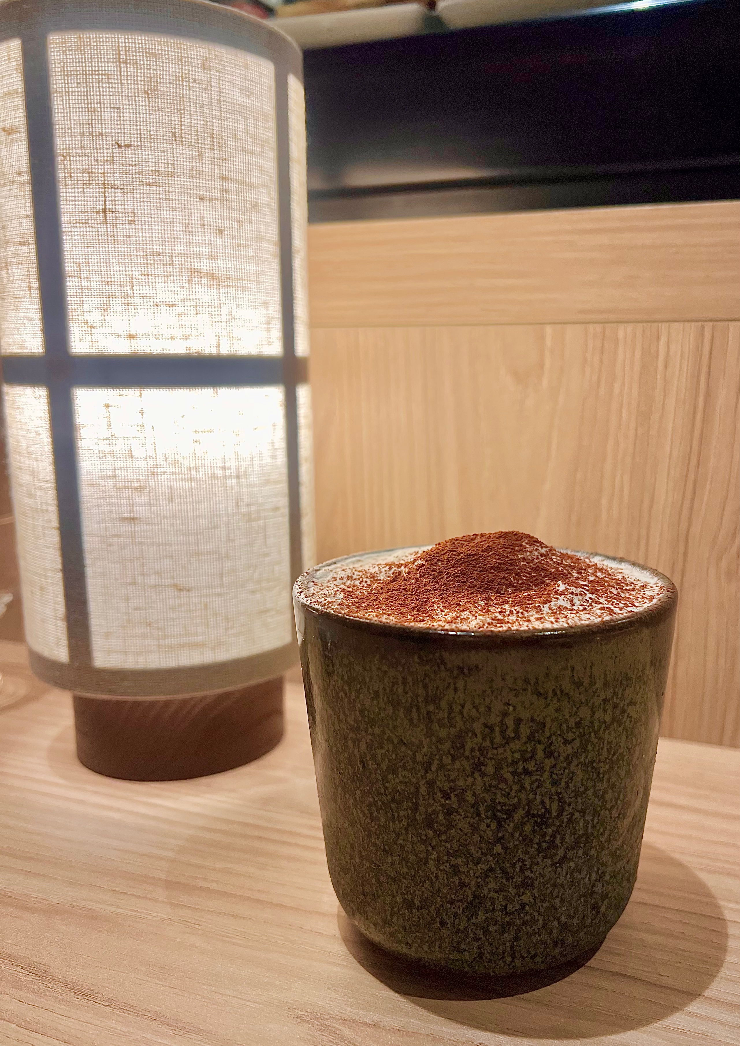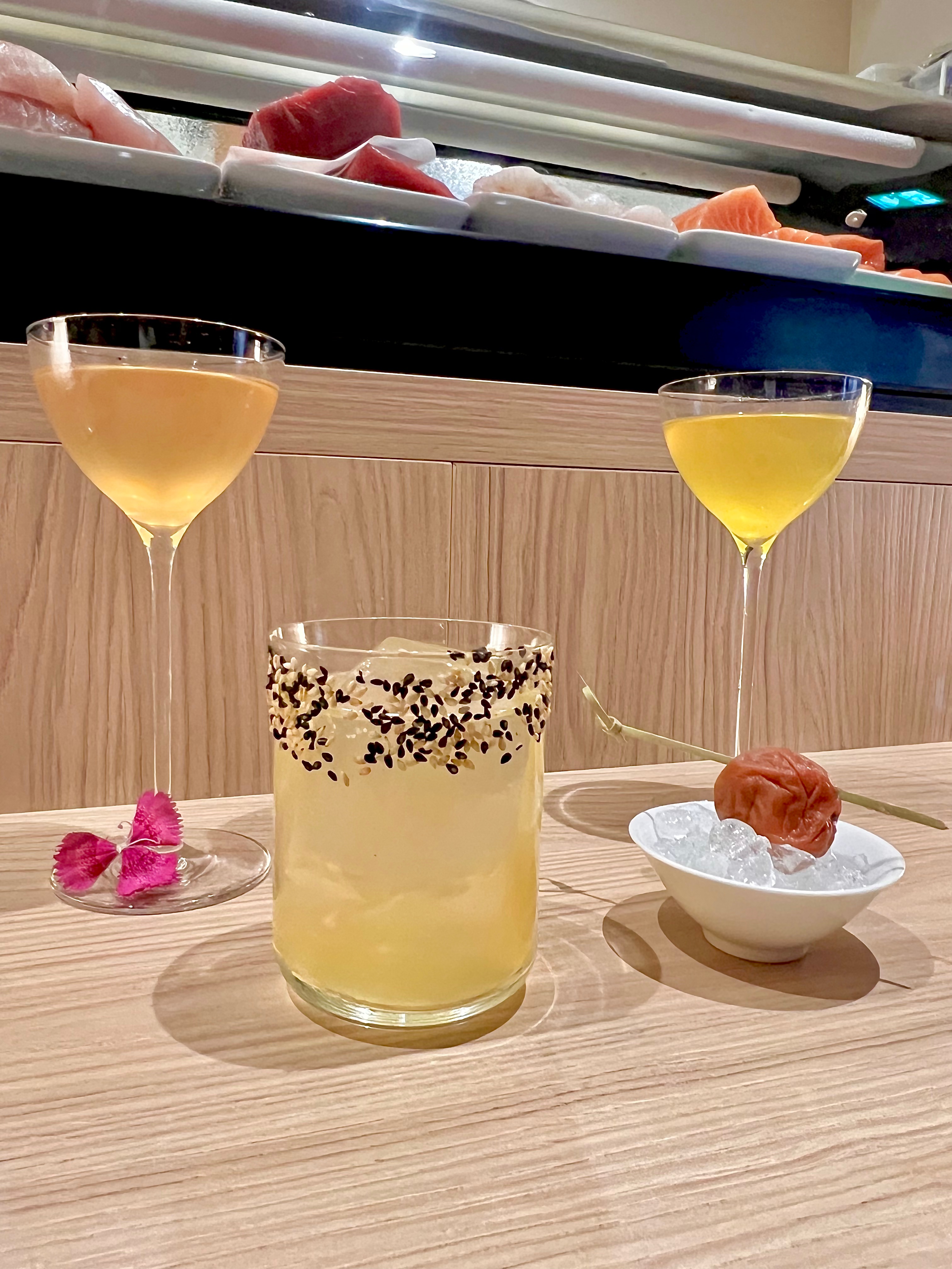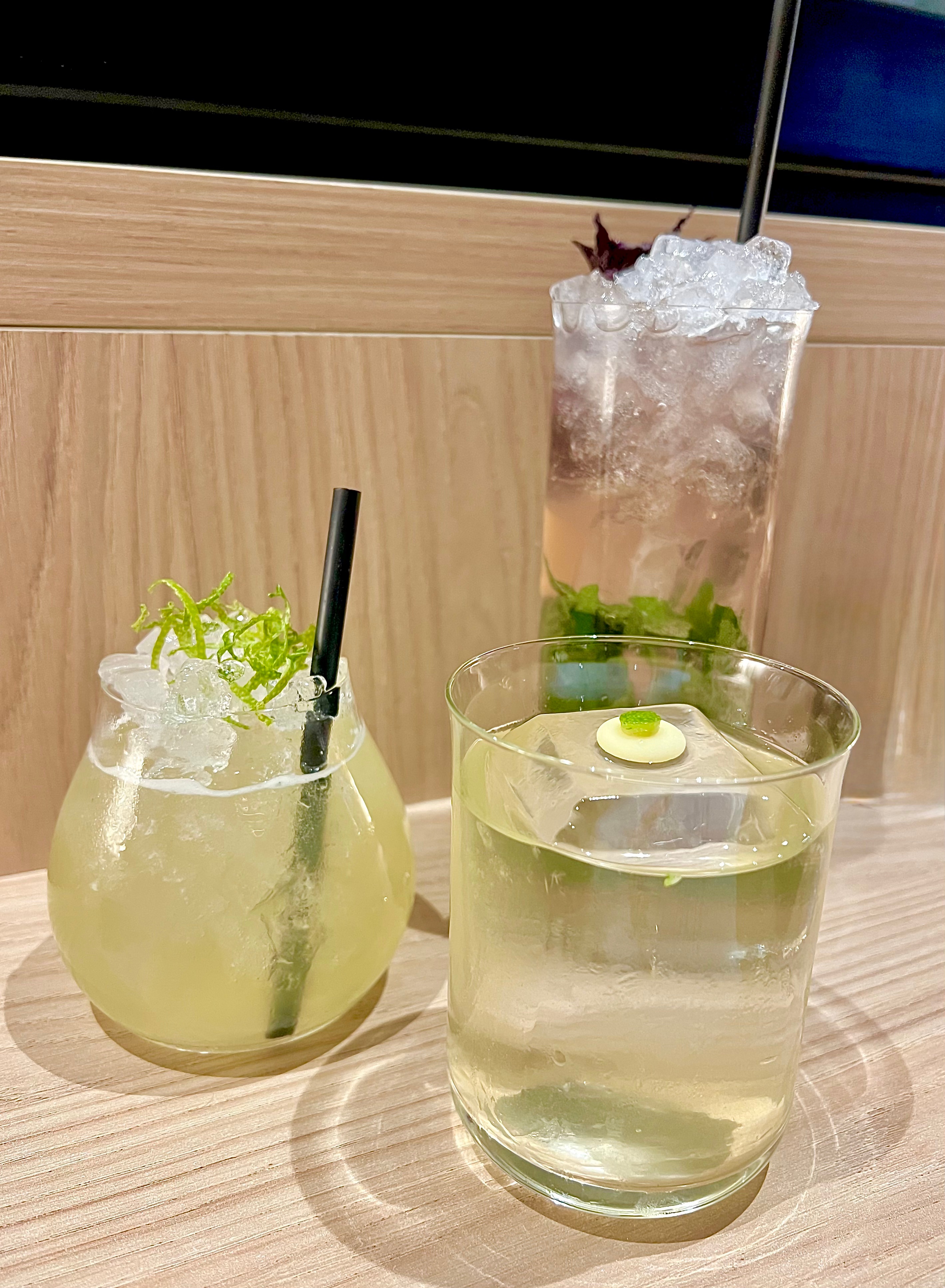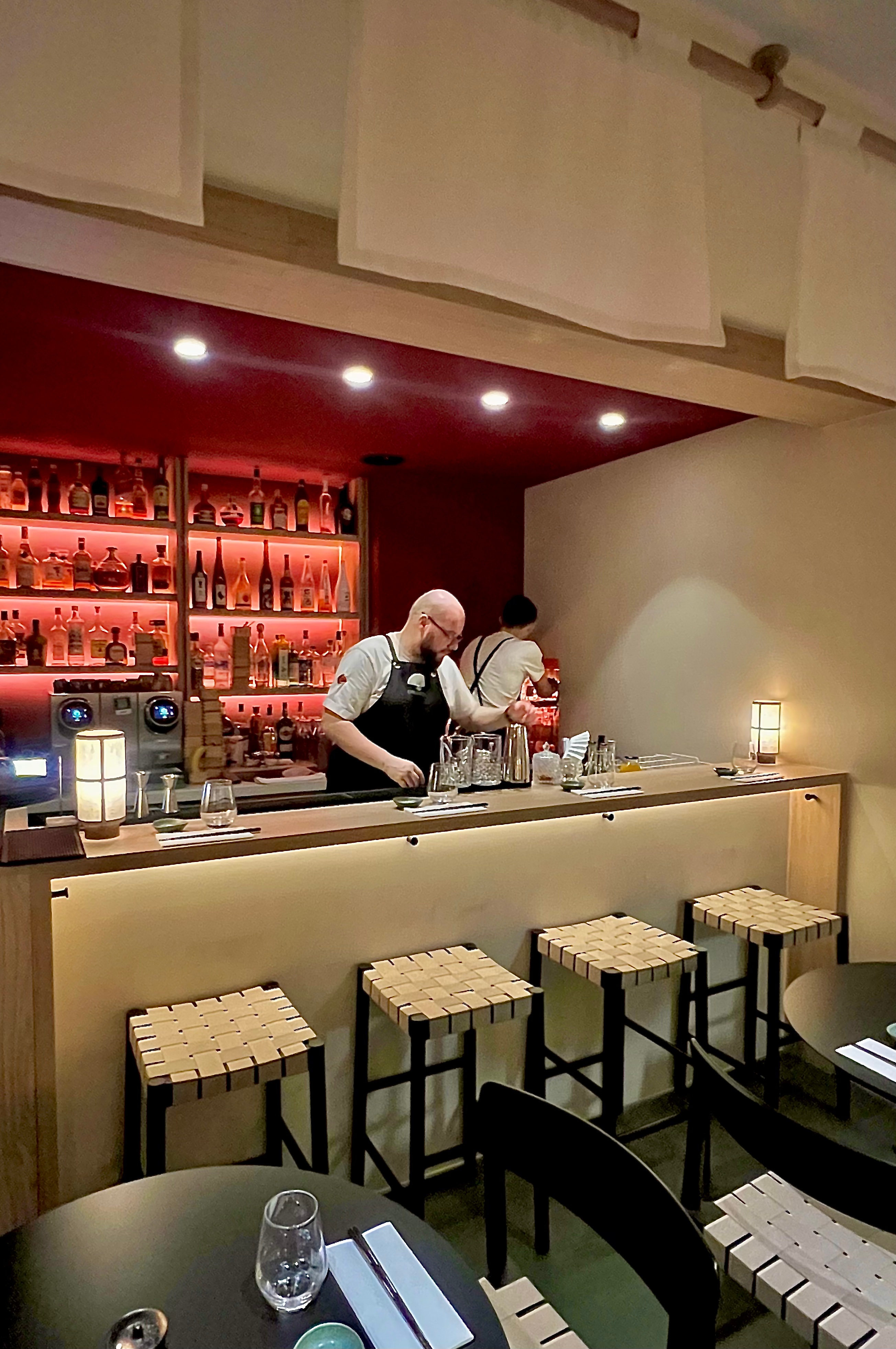 Vous voilà installé à table ou au comptoir, et pourquoi ne pas commander un cocktail signature parfaitement shaké et travaillé en amont de macérations aux notes et ingrédients emblématiques du pays du Soleil levant, comme le shiso, le saké, les fleurs de cerisier, le matcha ou l’oumeshu ? Comme le Banane & Osmanthus (gin à l’osmanthus, umeshu, eau de banane), le Matcha & Vanille (whisky japonais clarifié au yaourt vanillé, cordial de thé matcha) ou encore le Tomate & Fleur de cerisier (vodka, saké, liqueur de fleur de cerisier, cordial d’eau de tomate à la fleur de cerisier). Tout est en parfait accord, aucunement anecdotique, mais d’un subtil raffinement aux saveurs fondues et réelles.