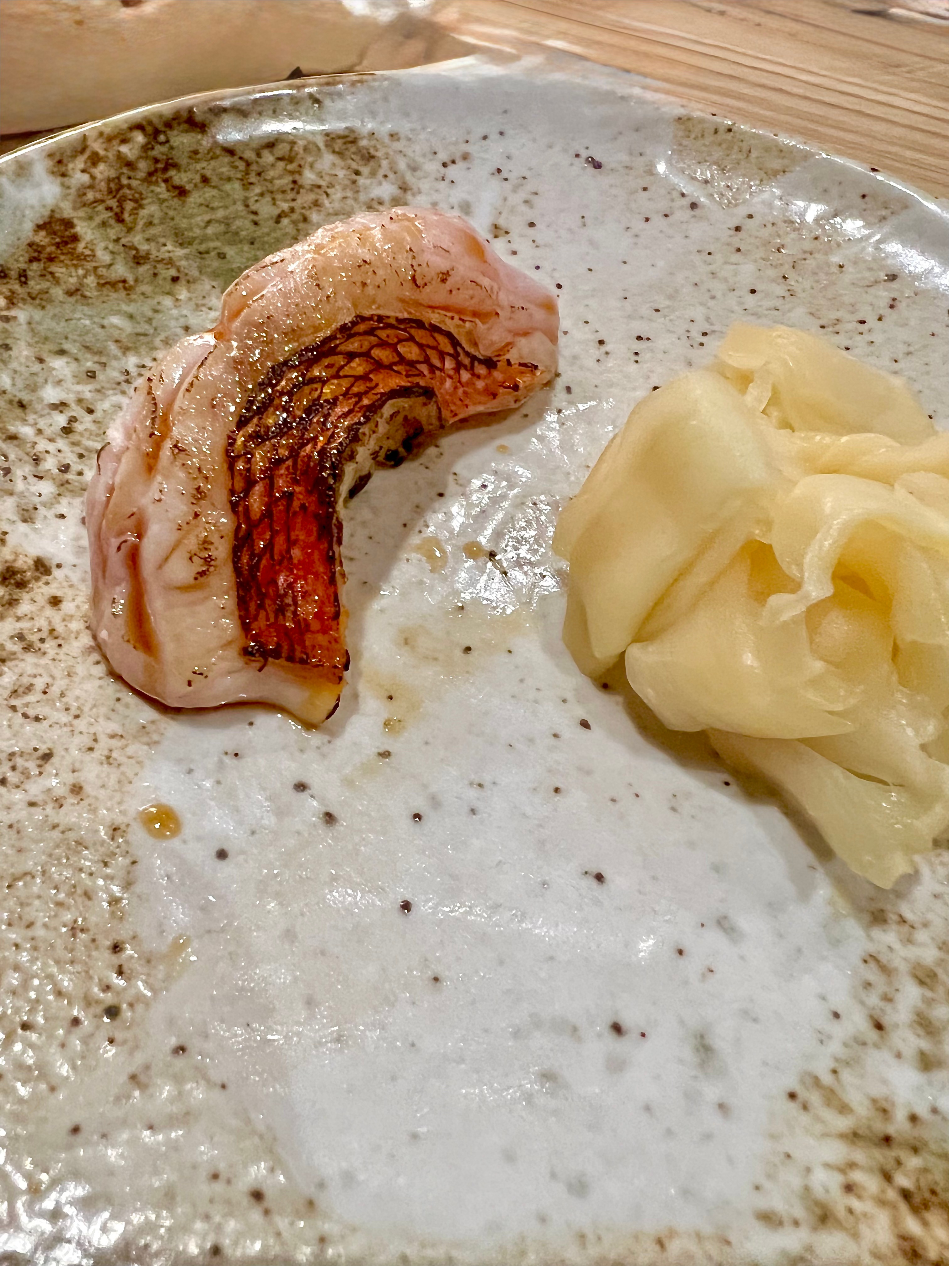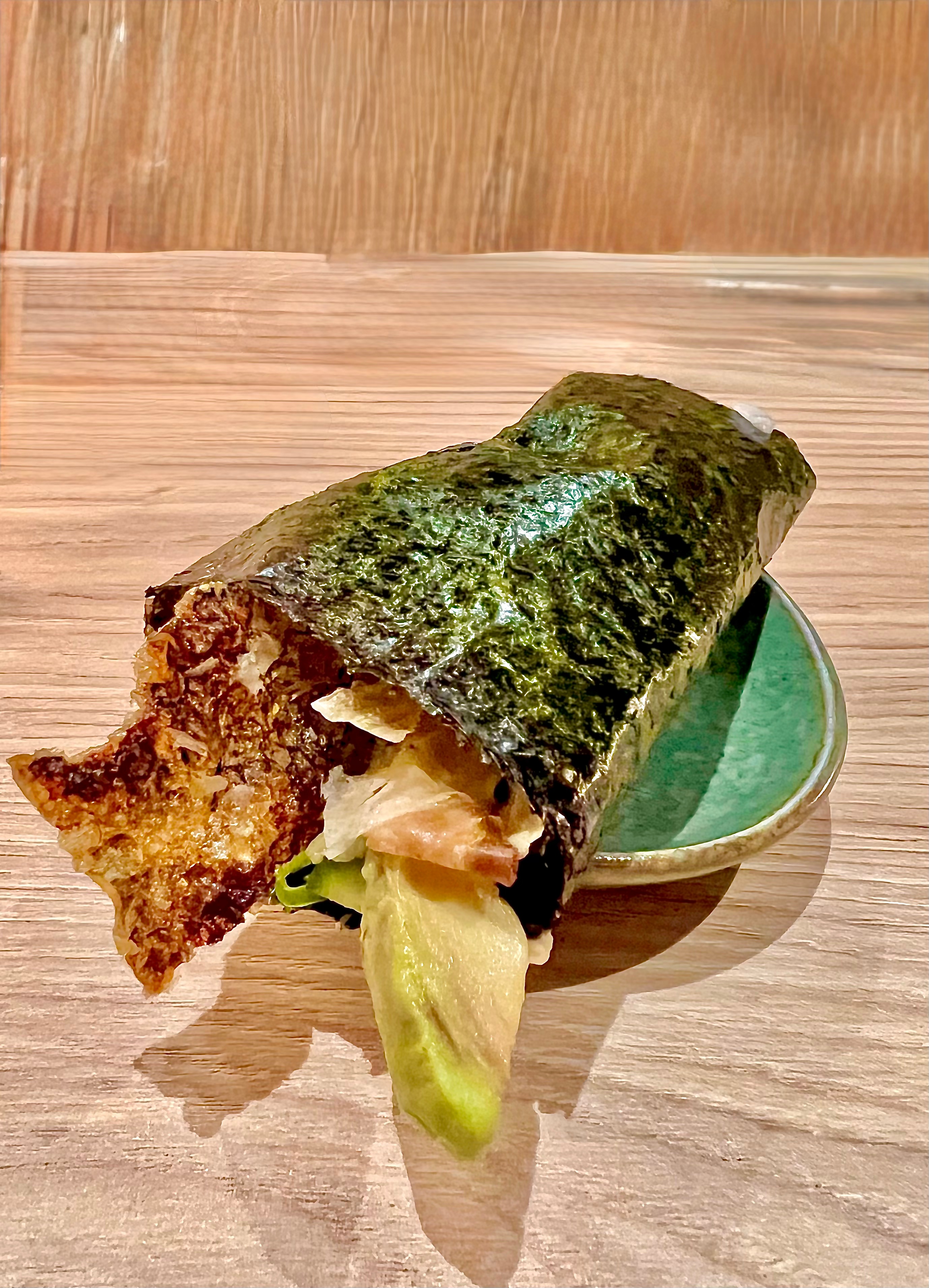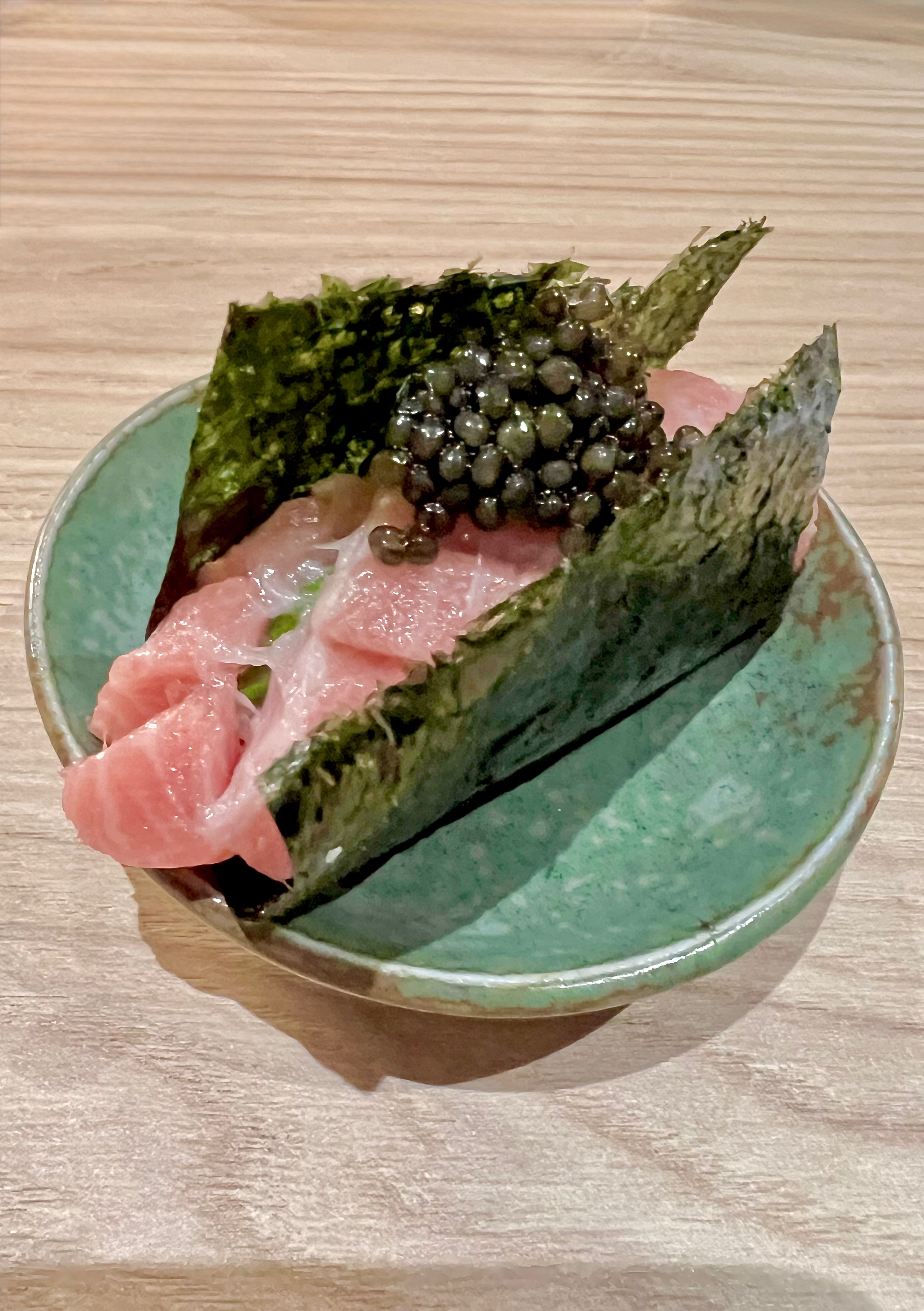Le Bar, qui fond dans la bouche, est ajusté en fine croque de la feuille de shiso, la Sériole se titille d’un accord piment, la crevette Carabinero, excellence des profondeurs méditerranéennes, se chauffe du wasabi frais tout en gardant sa personnalité fondante et nacrée, le Maquereau se marine de son caractère iodé et de sa belle mâche, le Béryx, cette dorade rose, est grillotée à la flamme pour apporter chaleur et profondeur… Puis arrive l’incontournable thon rouge en triptyque de ses différentes parties et intensité de gras : on commence par le moins gras, le Hamachi, fraîcheur absolue du poisson avec cette texture unique et viandarde, puis le Chu toro qui se suffit par lui-même de ce gras gourmand et vivant, et enfin l’Otoro (le plus gras, le plus recherché et le plus cher), ici, il se fait Temaki enveloppé d’une rustique feuille de Nori (on aimerait peut-être pour ce thon d’exception une feuille de nori un peu plus fine et plus sèche). Le caviar en iode noisette s’équilibre en délicatesse de ce gras si subtil qui tapisse le palais de bonheur. Pour continuer, la peau de saumon est frite telle une friandise et s’acoquine d’avocat, de concombre en croque et de katsuboshi, ces fins copeaux de bonite séchée, le tout s’enveloppant d’une feuille de nori, puis le Wagyu grillé qui se titille de wasabi frais sur le dessus, est telle une récompense largement méritée, et enfin l’Anguille, qui fait partie des nigiris recherchés des amateurs, se laque et se s’électrise de poivre.