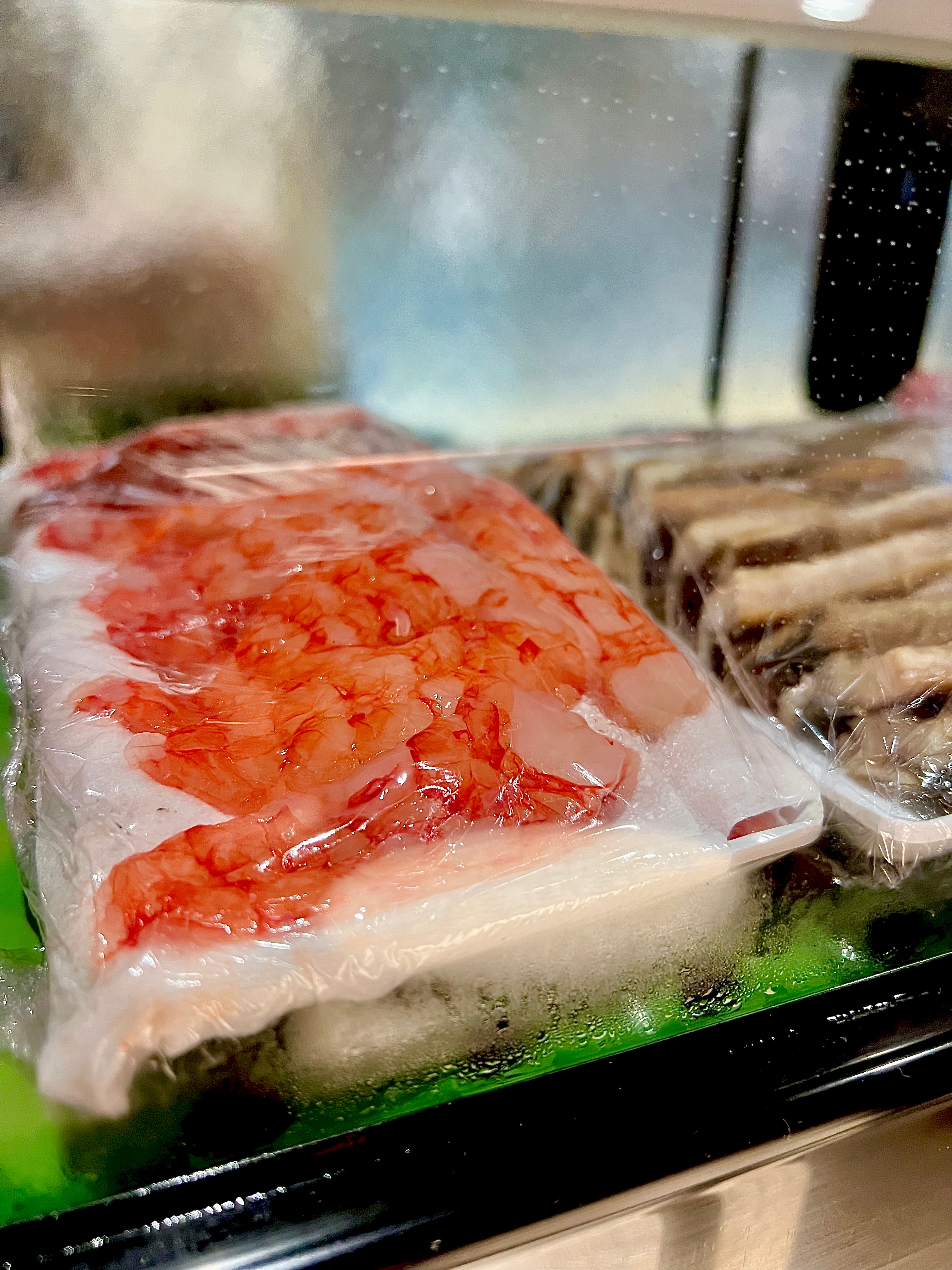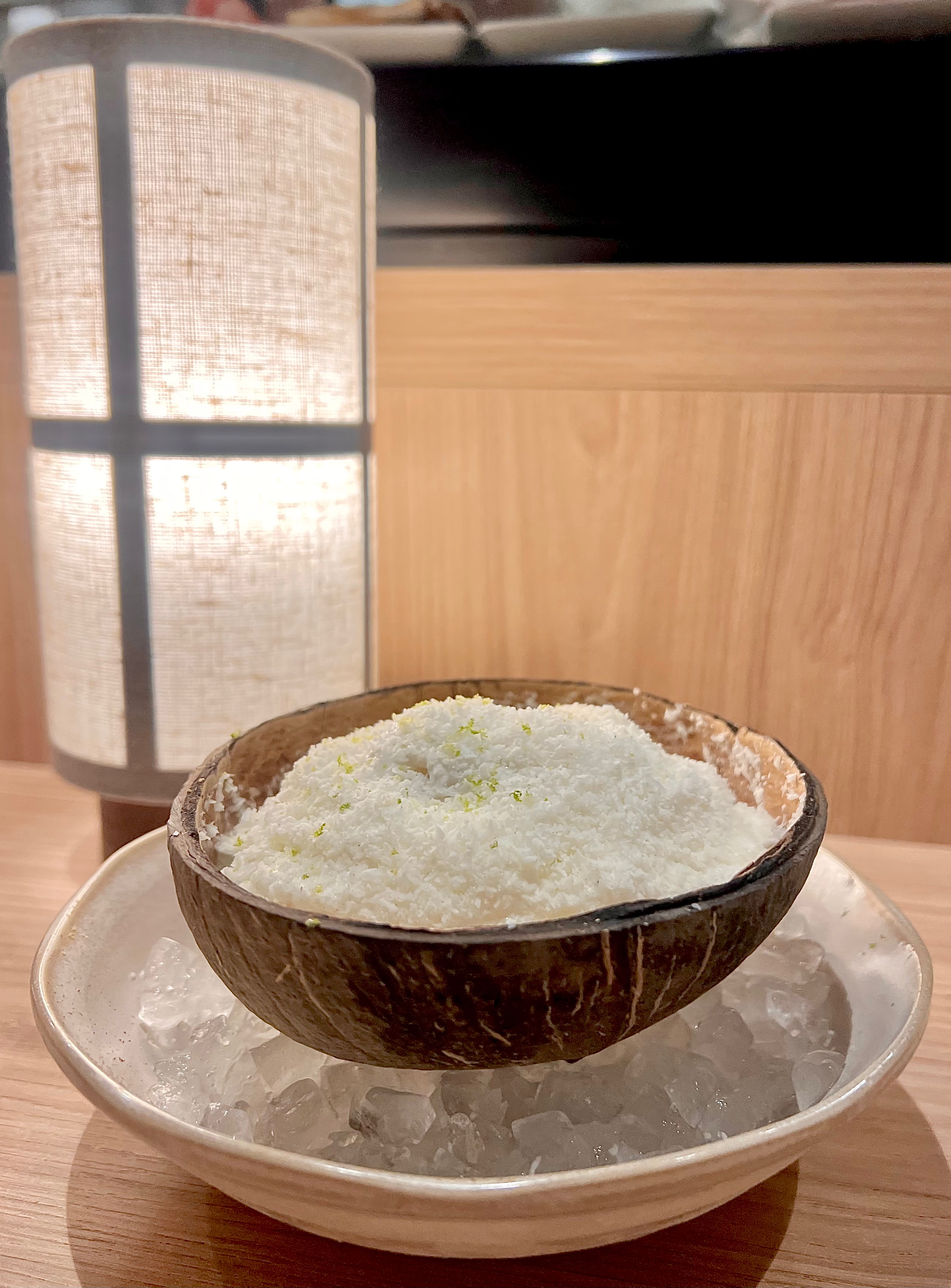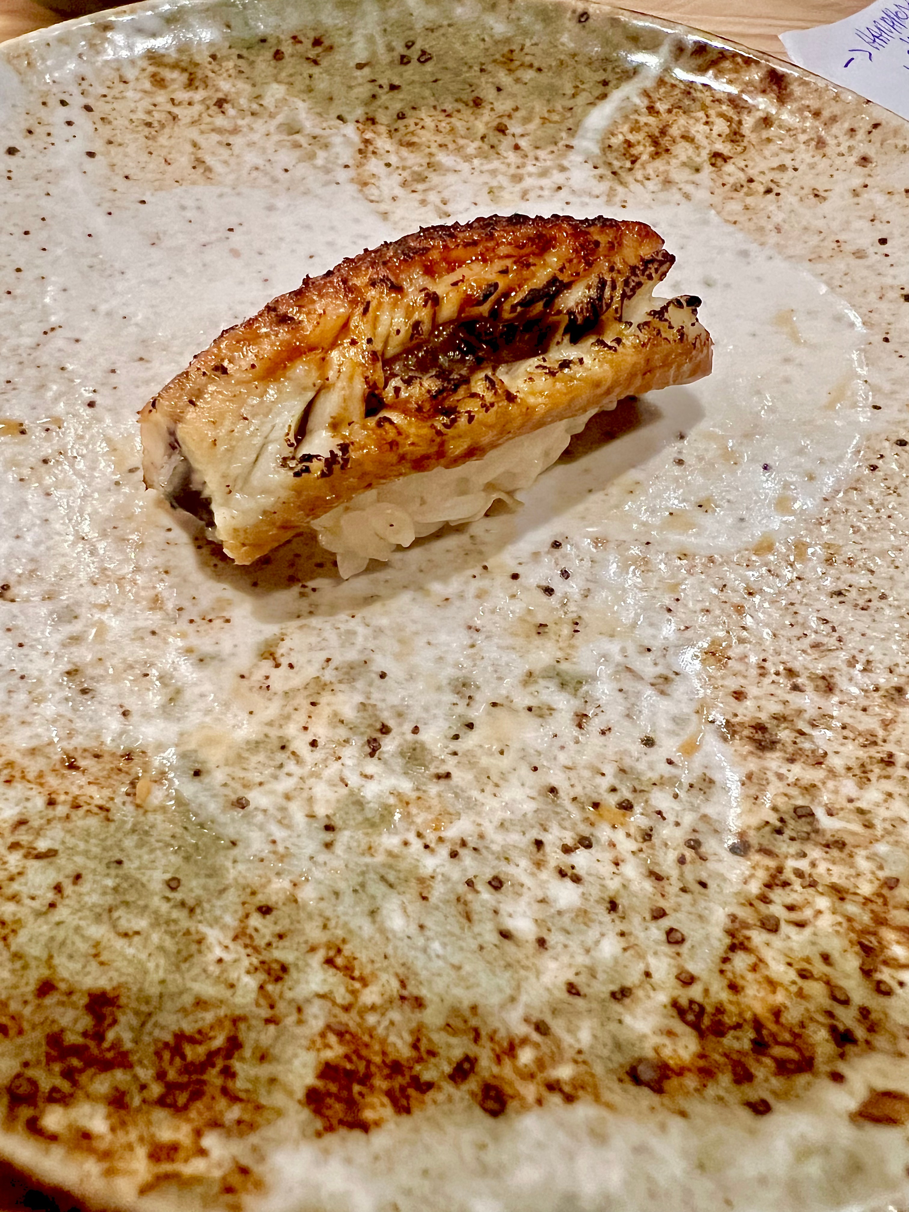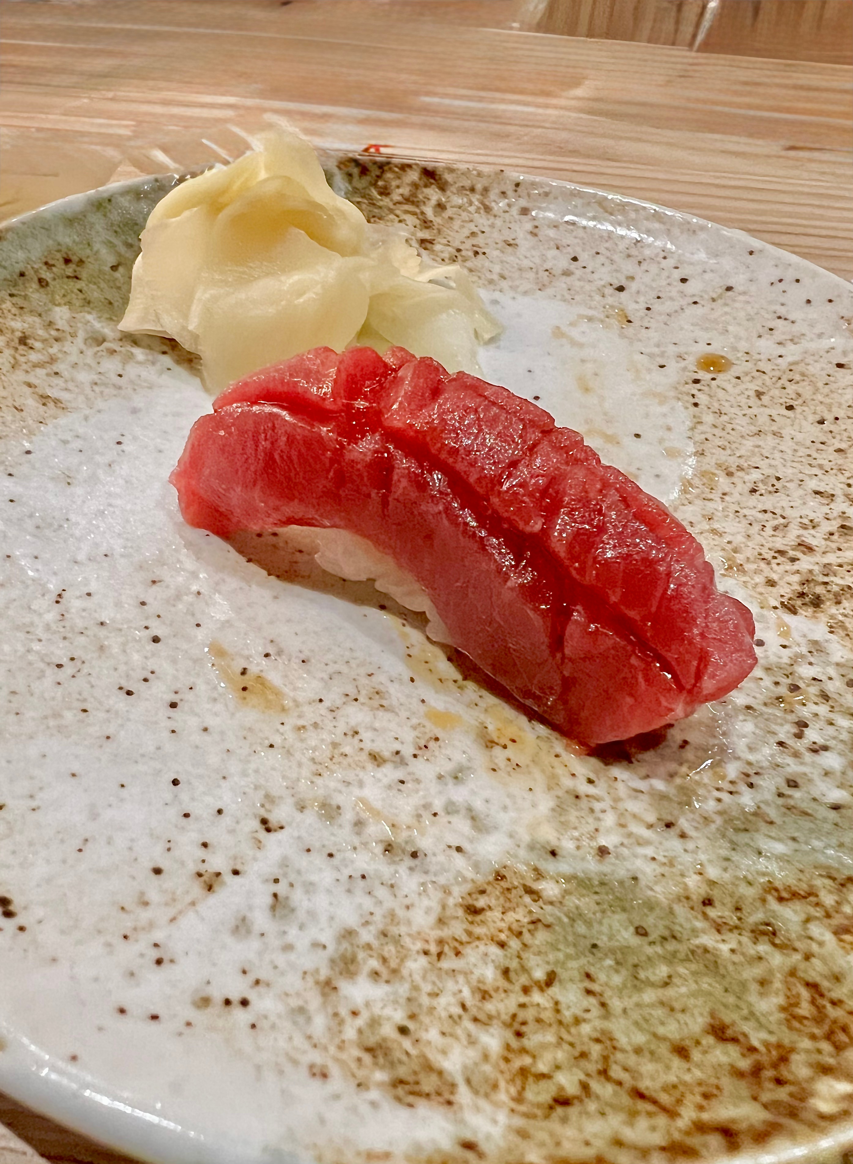 Le Bar, qui fond dans la bouche, est ajusté en fine croque de la feuille de shiso, la Sériole se titille d’un accord piment, la crevette Carabinero, excellence des profondeurs méditerranéennes, se chauffe du wasabi frais tout en gardant sa personnalité fondante et nacrée, le Maquereau se marine de son caractère iodé et de sa belle mâche, le Béryx, cette dorade rose, est grillotée à la flamme pour apporter chaleur et profondeur… Puis arrive l’incontournable thon rouge en triptyque de ses différentes parties et intensité de gras : on commence par le moins gras, le Hamachi, fraîcheur absolue du poisson avec cette texture unique et viandarde, puis le Chu toro qui se suffit par lui-même de ce gras gourmand et vivant, et enfin l’Otoro (le plus gras, le plus recherché et le plus cher), ici, il se fait Temaki enveloppé d’une rustique feuille de Nori (on aimerait peut-être pour ce thon d’exception une feuille de nori un peu plus fine et plus sèche). Le caviar en iode noisette s’équilibre en délicatesse de ce gras si subtil qui tapisse le palais de bonheur. Pour continuer, la peau de saumon est frite telle une friandise et s’acoquine d’avocat, de concombre en croque et de katsuboshi, ces fins copeaux de bonite séchée, le tout s’enveloppant d’une feuille de nori, puis le Wagyu grillé qui se titille de wasabi frais sur le dessus, est telle une récompense largement méritée, et enfin l’Anguille, qui fait partie des nigiris recherchés des amateurs, se laque et se s’électrise de poivre.