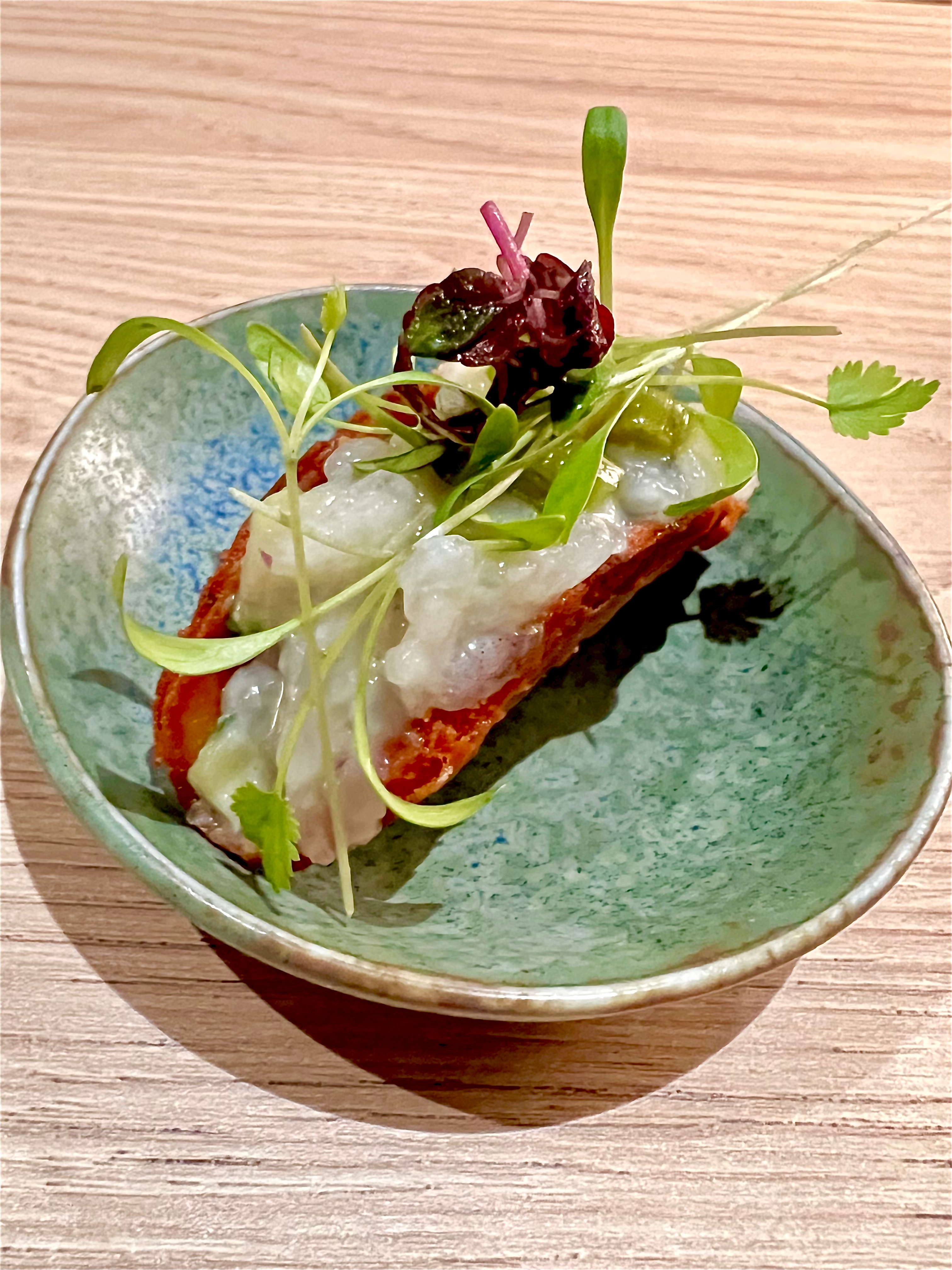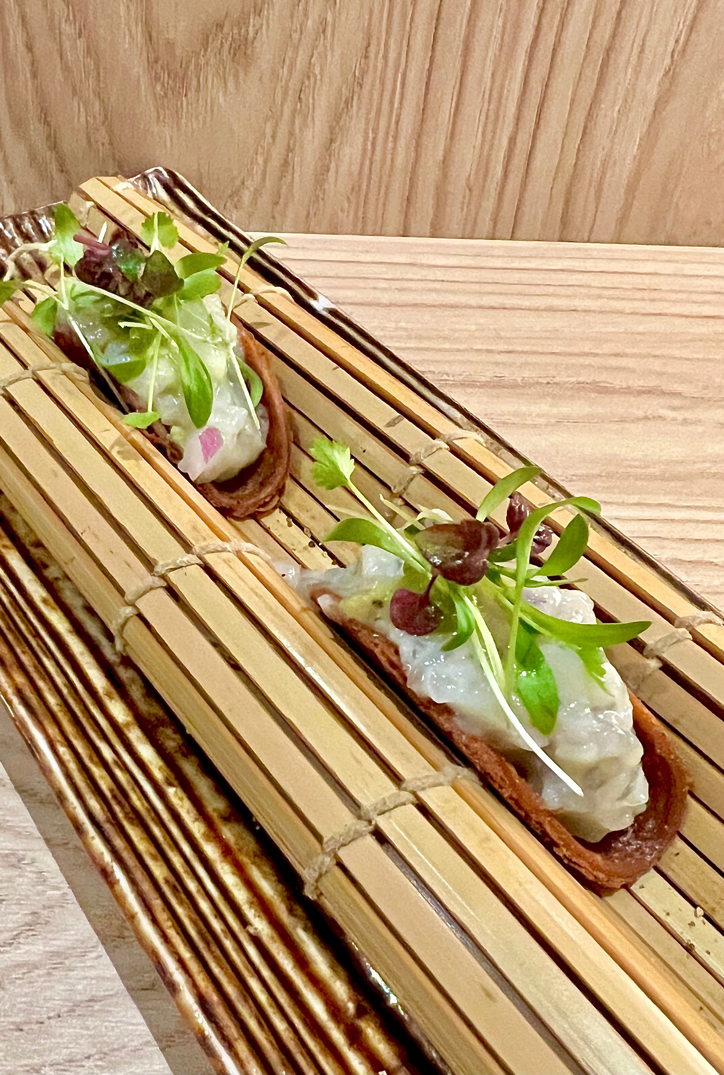 Pour commencer et accompagner ces cocktails, les Tacos Socca Crevette Yuzu Miso vous immergent dans les deux mondes d’Alexis, Nice, sa ville d’adoption, et Tokyo, sa ville de cœur. On se régale avec enthousiasme de ces mini-tacos à la fine saveur d’une socca qui croustille, les crevettes gardent de toutes leurs valeurs pepsées des agrumes et des pousses de shiso rouges.