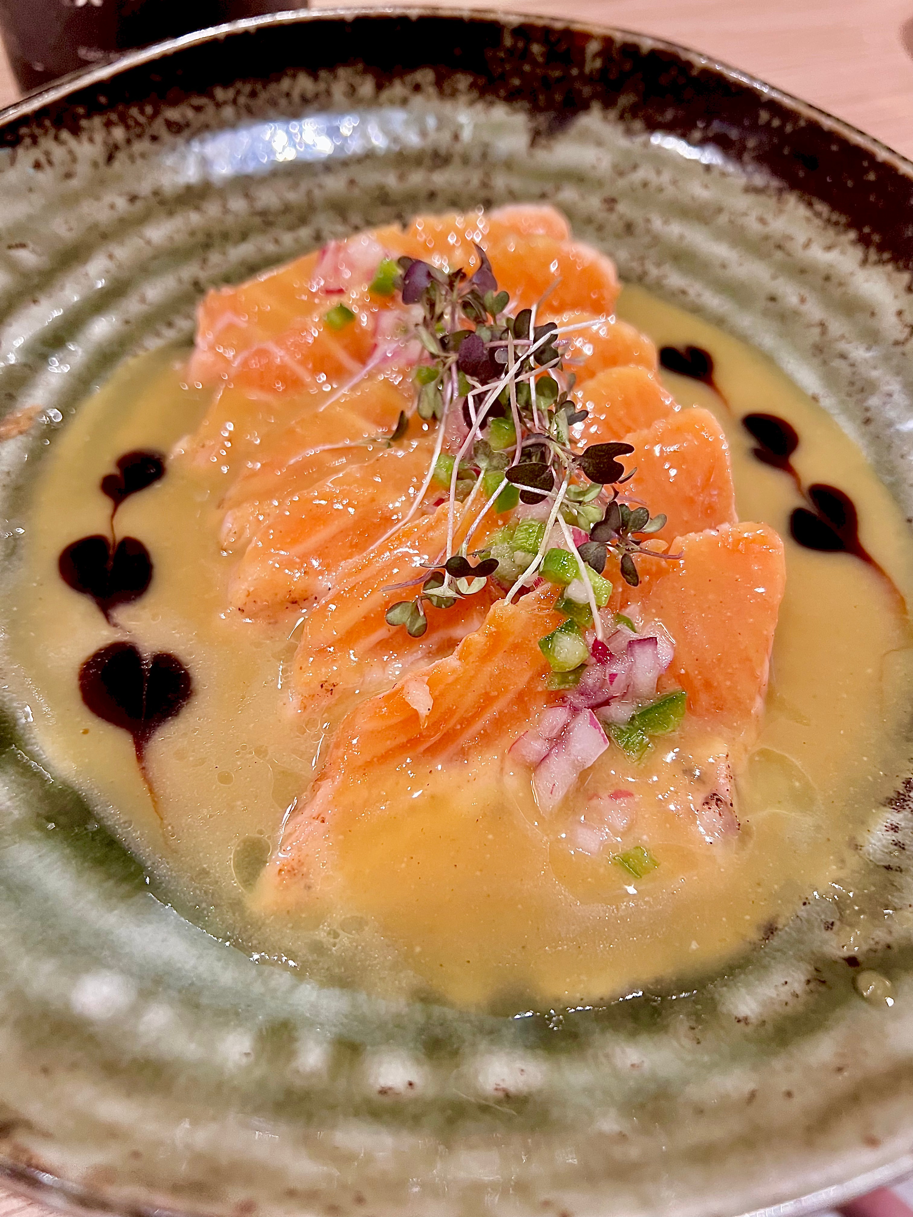 Filet de saumon, sauce yuzu-miso : tel un tataki, ce saumon mi-cuit, d’une chair dense et fondante, s’intensifie des saveurs umami de la sauce faite à base de yuzu, de pâte de miso et de moutarde japonaise. Une assiette qui devient addictive et enjouée.