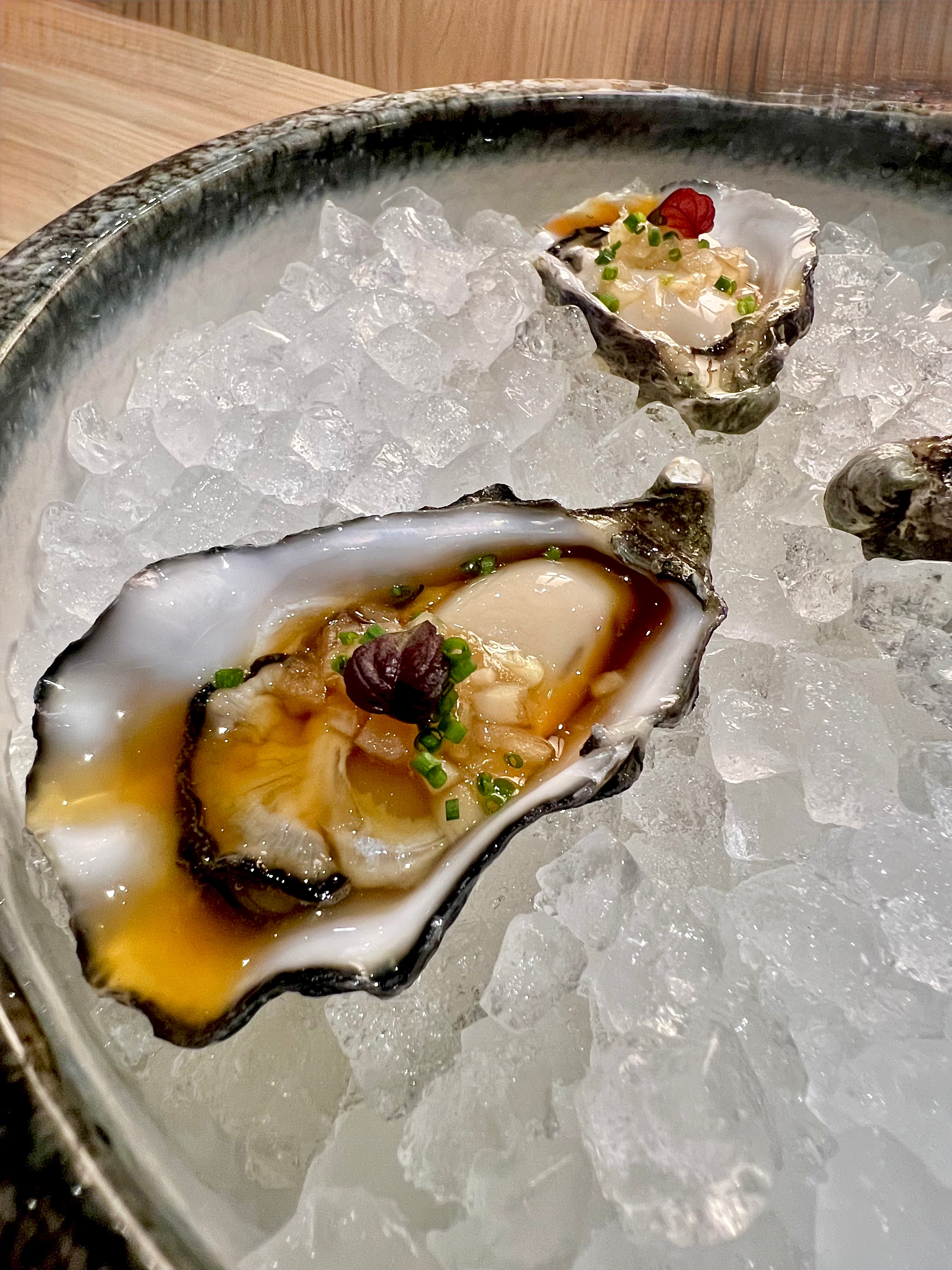 Huîtres Ponzu : juste raidies de vie, elles se font vives et pimpantes du ponzu, cette emblématique sauce soja travaillée à base de citron yuzu, de mirin et de vinaigre de riz. Elle a cette typicité à la fois douce et vive qui apporte le relief juste.