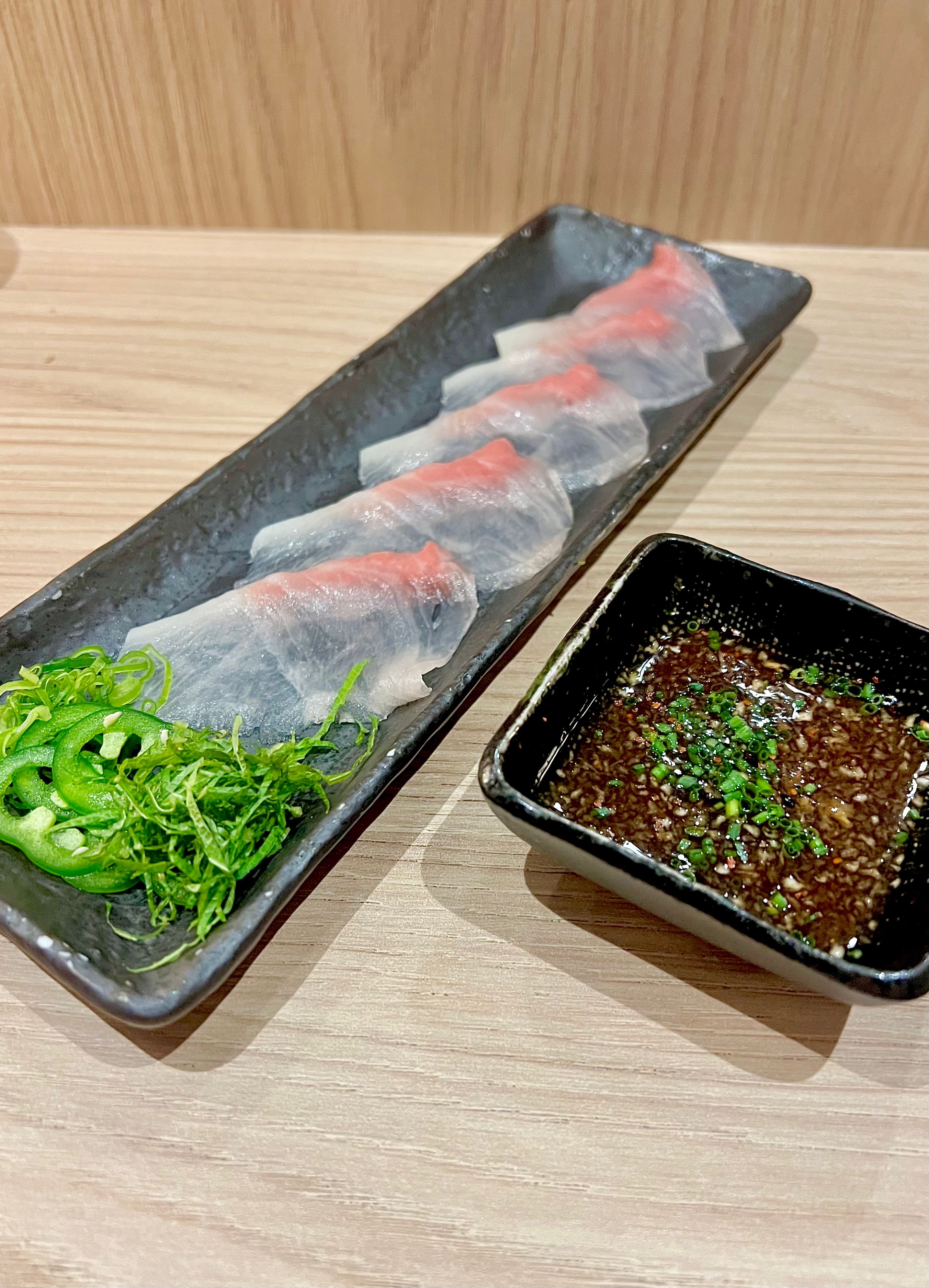 Sériole Jalapeño Soja Yuzu : découpe translucide de la sériole qui s’intensifie en force et croque du jalapeño cru et des feuilles de shiso. Ce sashimi se trempe à loisir dans la sauce soja vinaigrée et agrumée du yuzu.