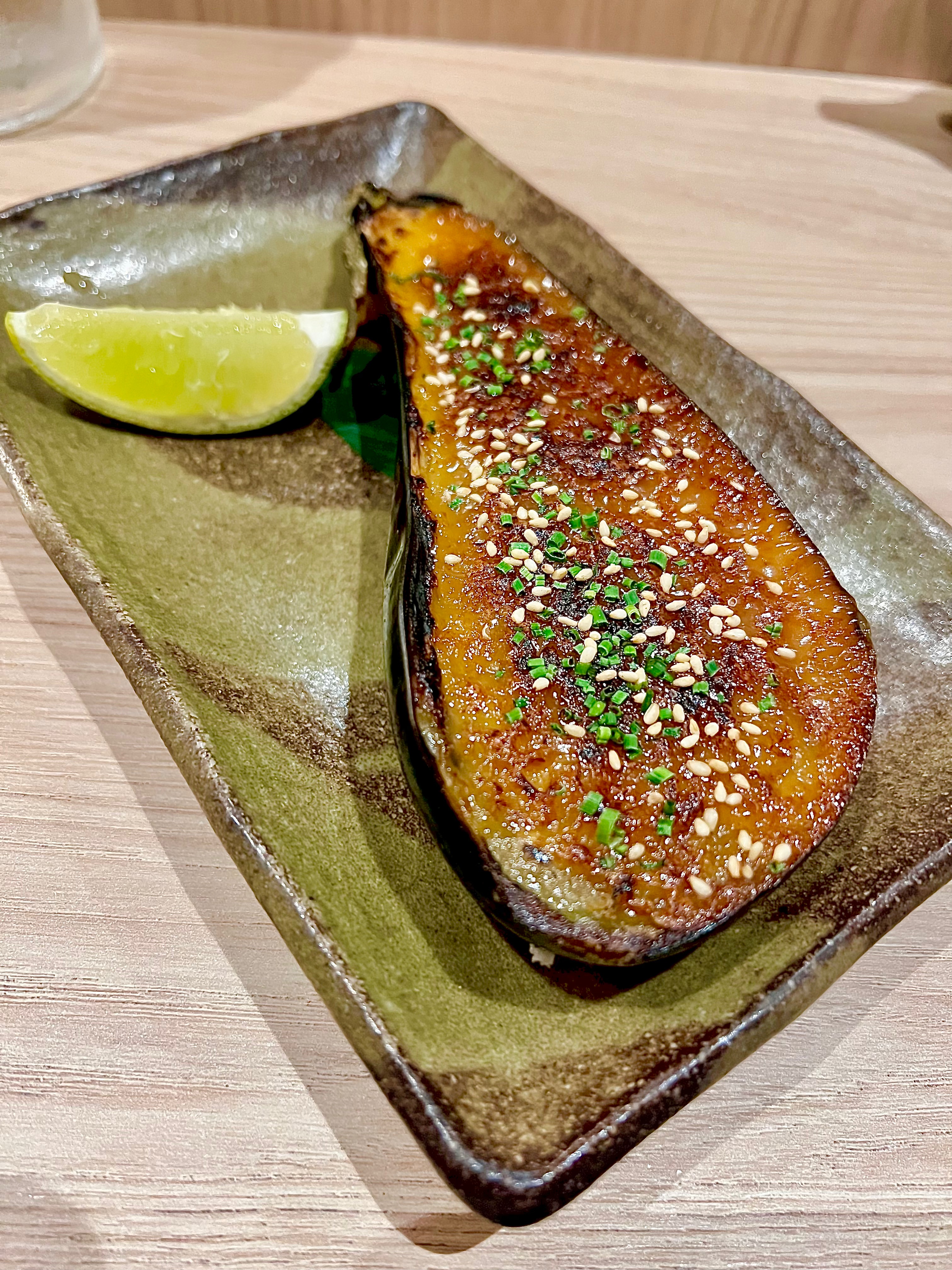 Nasu Miso : cette aubergine, à l’allure très porn-food, se fait crème brûlée d’elle-même d’une texture compotée et suave, elle s’intensifie du miso et du sésame et se savoure sans façon à la cuillère.
