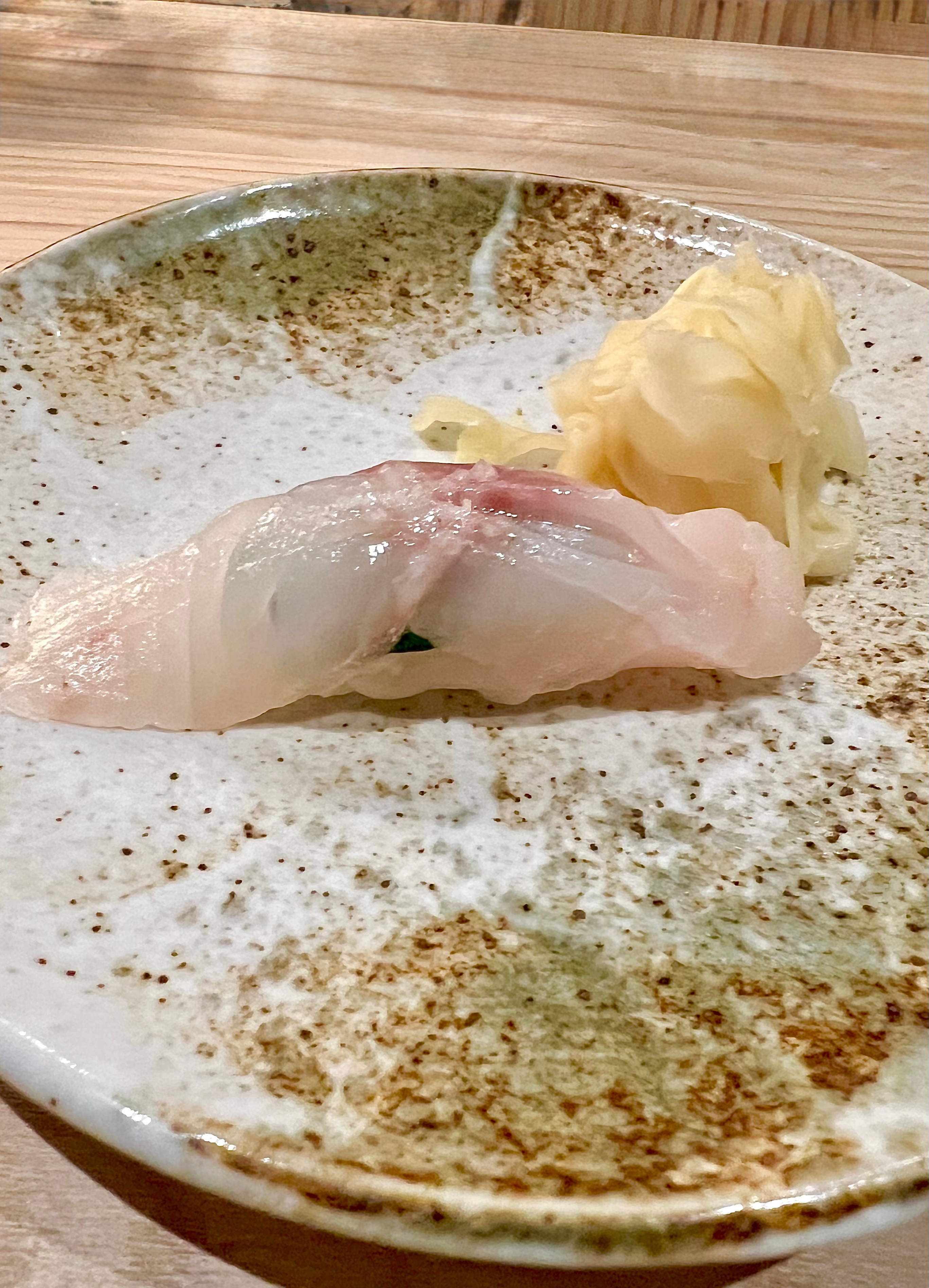 La Soupe Miso, à base de bouillon dashi des têtes de bar et de sériole (dans cette valeur « du ne rien jeter et de l’utilisation du produit dans son entièreté ») et approfondie du miso, se fait entracte qui termine les entrées et vient laver le palais pour préparer la suite où commencent les Nigiris.