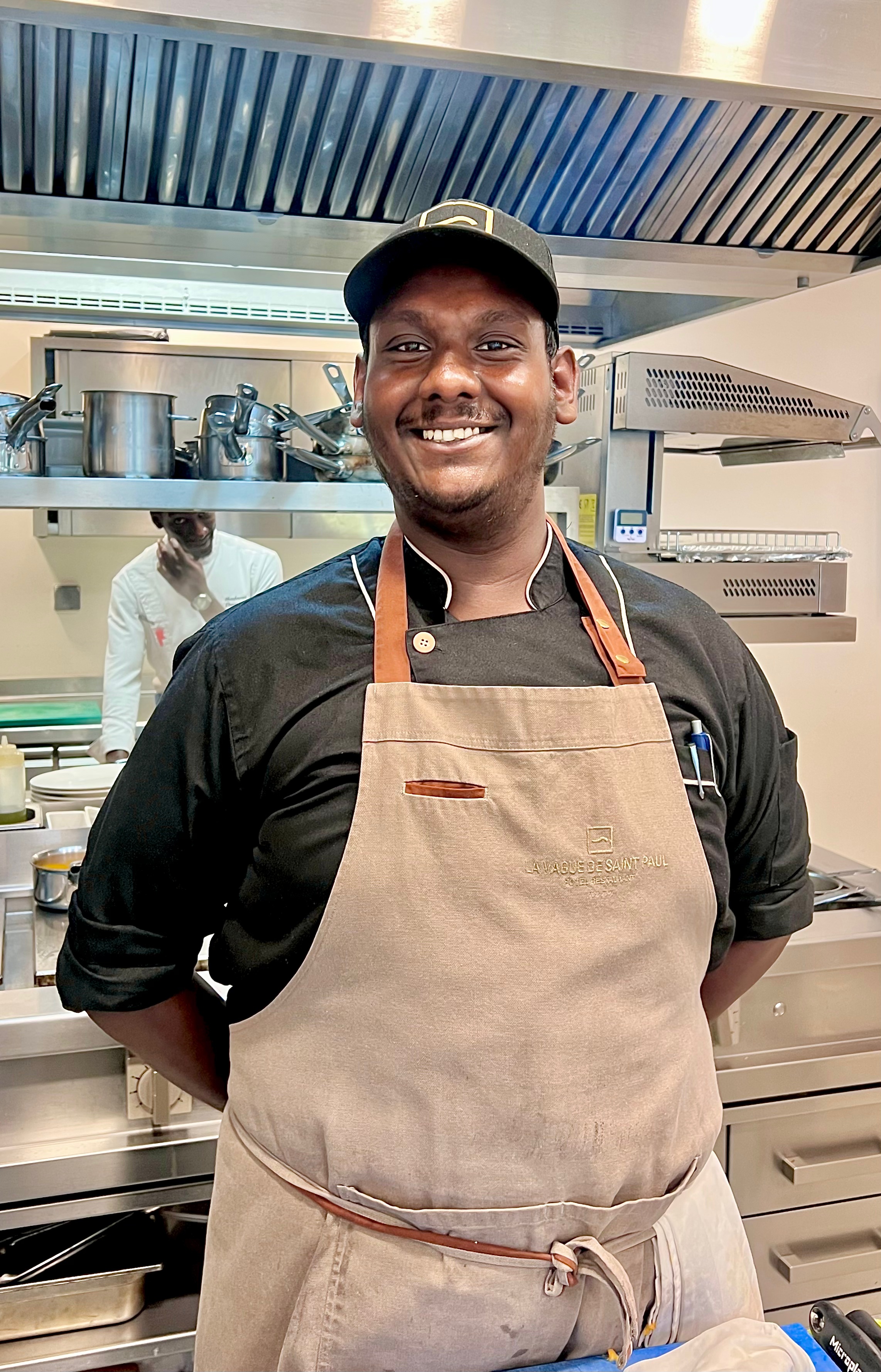 Akhara, au parcours assuré (Ghislaine Arabian au Pavillon Ledoyen, Alain Ducasse à L’Hôtel Relais du Parc et au Saint-James à Paris, Eric Provost au Royal Barrière à Deauville, Serge Gouloumès au Mas Candille, Mas des Herbes Blanches, Château Valmer…), est à la tête des cuisines de La Vague de Saint-Paul depuis 2017. C’est avec une immense complicité et confiance qu’il travaille en continu avec le directeur de l’hôtel, le brillant et passionné Guillaume Puig. Tous deux font de leur établissement une adresse que l’on aime, non seulement pour sa situation au cœur de la forêt saint-pauloise, préservée de l’agitation touristique, mais également pour son accueil familial et chaleureux, telle une douce, élégante et contemporaine pension de famille. Les clients fidèles ne s’y trompent pas et se sentent comme dans leur maison de vacances. Guillaume n’est pas un débutant, bien au contraire, il baigne très tôt dans le monde de la restauration en travaillant les week-ends dans les établissements de son oncle (le chef Richard Borfiga qui a été le plus jeune chef étoilé de France), pour le service traiteur La Toque du Midi, puis il fait un BTS au lycée hôtelier de Monaco avant de partir en Espagne sur le conseil de Thierry Naidu qui y gérait à cette époque plusieurs établissements. C’est dans le luxueux resort urbain Gran Hotel La Florida, à Barcelone, que Guillaume commence à travailler, il part par la suite à Mallorca au très chic Palais Grand Hotel Son Net. En France, il intègre en tant que responsable des opérations l’emblématique Relais & Châteaux Le Moulin de l’Abbaye dans le Périgord. En 2012, sur la proposition de Thierry Naidu, il postule pour l’ouverture de La Vague de Saint-Paul, nouvel hôtel en plein devenir, où il est rapidement nommé Directeur. Guillaume aime cet échange avec la clientèle, avec cette notion de l’art de recevoir. Il se rappelle toujours ce que lui avait dit Monsieur Giraudel, le propriétaire du très chic Relais & Château Le Vieux Logis à Trémolat : « on ne reçoit pas des clients, on reçoit des amis chez nous », voilà, comment Guillaume conçoit aujourd’hui son hospitalité à la Vague, tel un maître de maison.