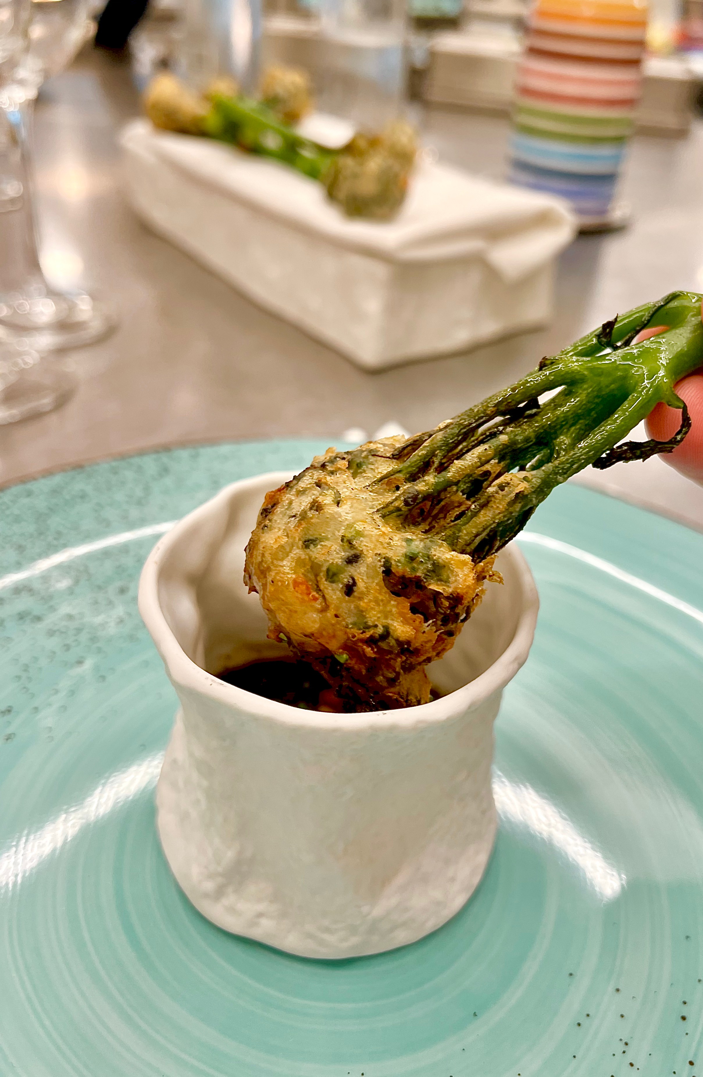 Pour commencer, l’amuse-bouche se fait végétal avec le Brocoletti en tête de tempura, qui est d’abord laqué entier à la flamme de l’Hibachi, ce qui lui donne un accent subtilement fumé. Les têtes en tempura apportent la vivante croustillance et se trempent de plaisir certain dans la pertinente et pulsante vinaigrette au piment, mangue, mélasse de grenade, miel et coriandre. Ça titille en équilibre les papilles avec envie et appétit.