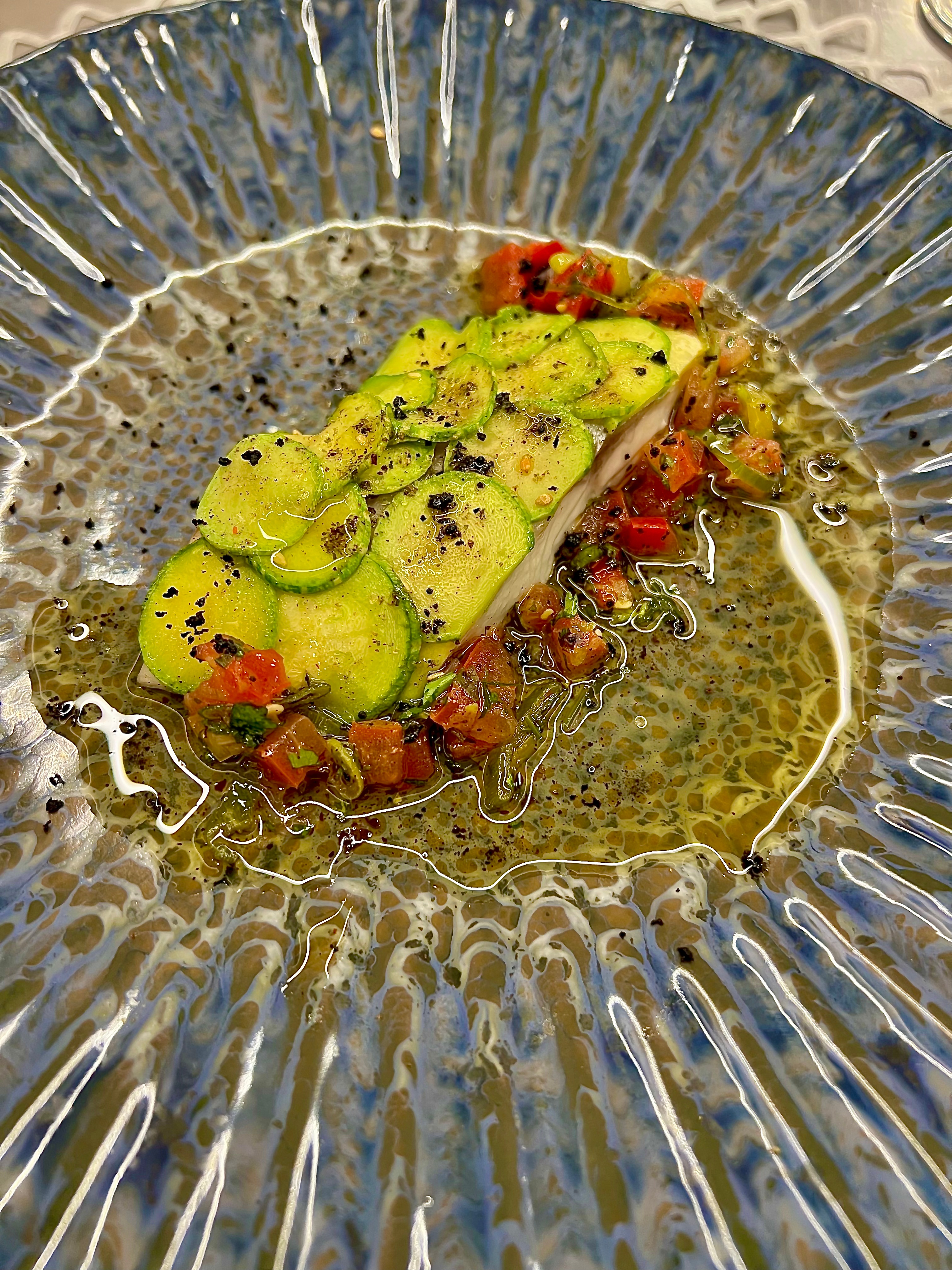 La Dorade en écailles de courgette de Nice au zaatar, vierge de tomate ancienne à la coriandre : avec cette dorade cuite en vapeur douce, c’est un retour aux saveurs méridionales avec une ponctuation levantine. Elle s’encanaille d’écailles de courgettes de Nice, d’une poudre d’olives noires déshydratées et de zaatar, ce mélange d’herbes et d’épices typique du Moyen-Orient avec une prédominance du thym d’Alep. La vierge de coriandre à la tomate et sumac (autre épice levantine à la saveur douce et acidulée) vient accentuer l’orientalisme niçois de l’assiette avec une dynamique herbacée et citronnée.