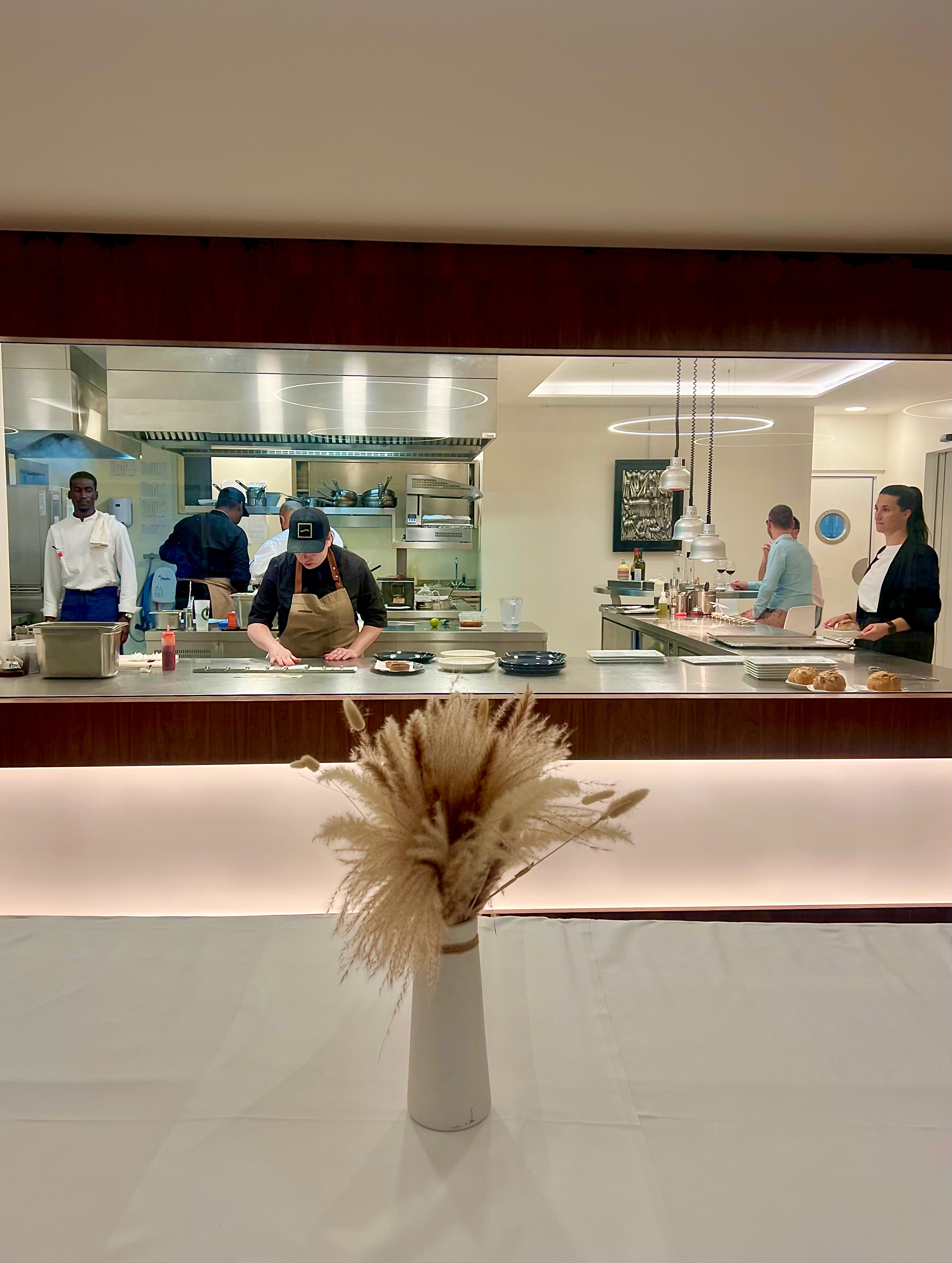 Ces dernières années, les tables du chef se font les stars des restaurants gastronomiques et proposent parfois différents formats : dans une pièce privée derrière une vitre face aux cuisines, comme au Meurice ou au Jardin de Berne, au coeur de l’action mais isolé du bruit dans un aquarium, comme au Louis XV – Alain Ducasse ou encore en cuisine à une table sur le côté telle au Mirazur… mais celle d’Akhara est unique, elle se situe au bout, directement sur le pass en inox, là où toutes les assiettes sont terminées et sortent pour le service. Cependant ici, pas de service comme on l’entend habituellement, c’est le chef lui même qui s’occupe de tout, rien que pour vous. Que vous soyez seul, à deux ou maximum à quatre , Akhara prend soin de ses hôtes, avec cette idée qu’il vous reçoit chez lui, comme à la maison. Il prépare, cuit, dresse les assiettes, met les couverts, dessert votre table, la redresse tout en discutant avec vous, comme il le ferait dans sa propre cuisine, chez lui.